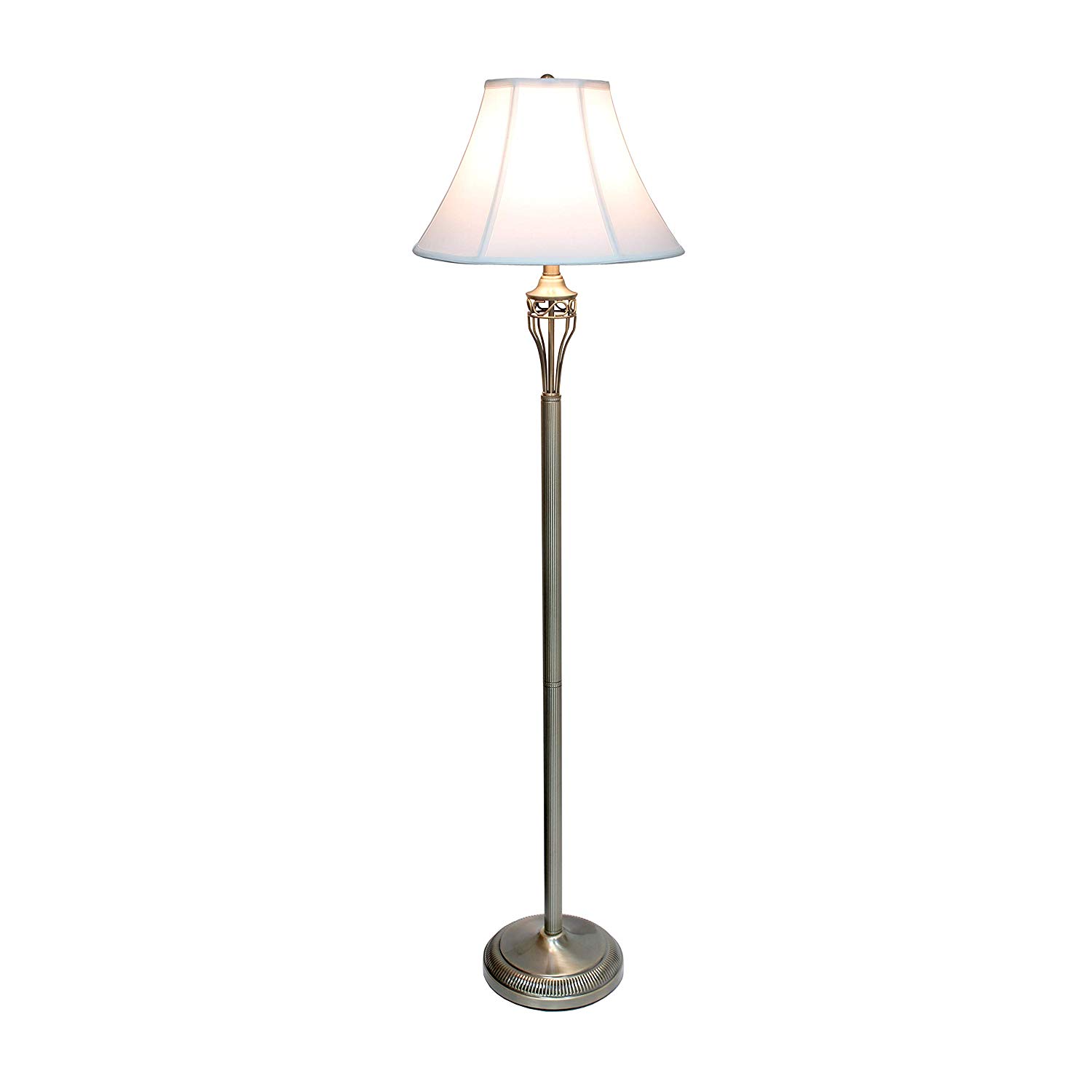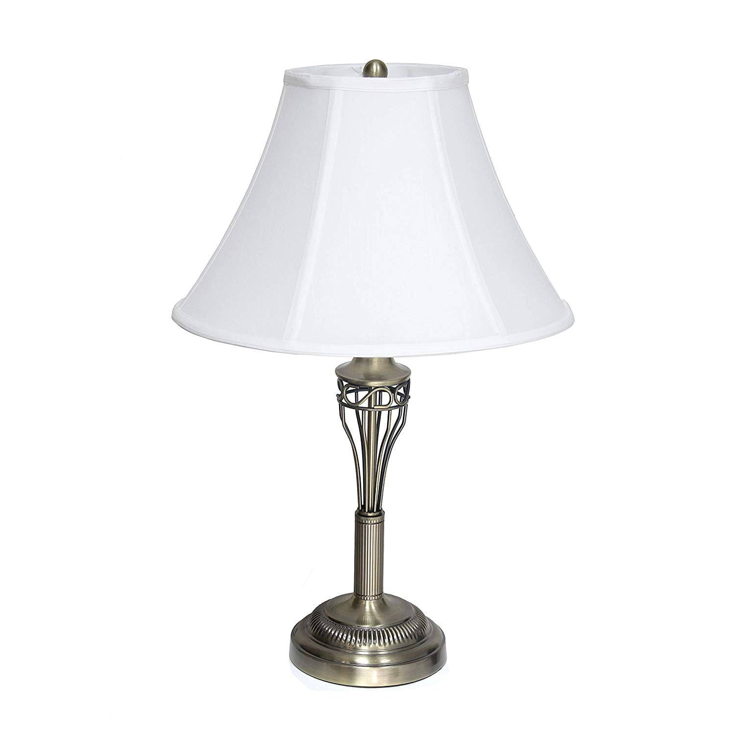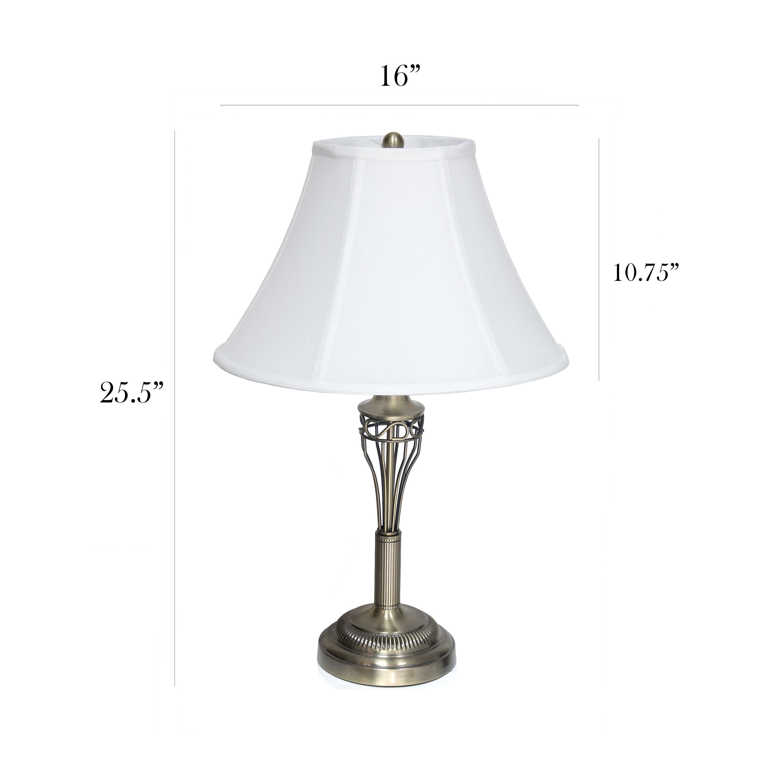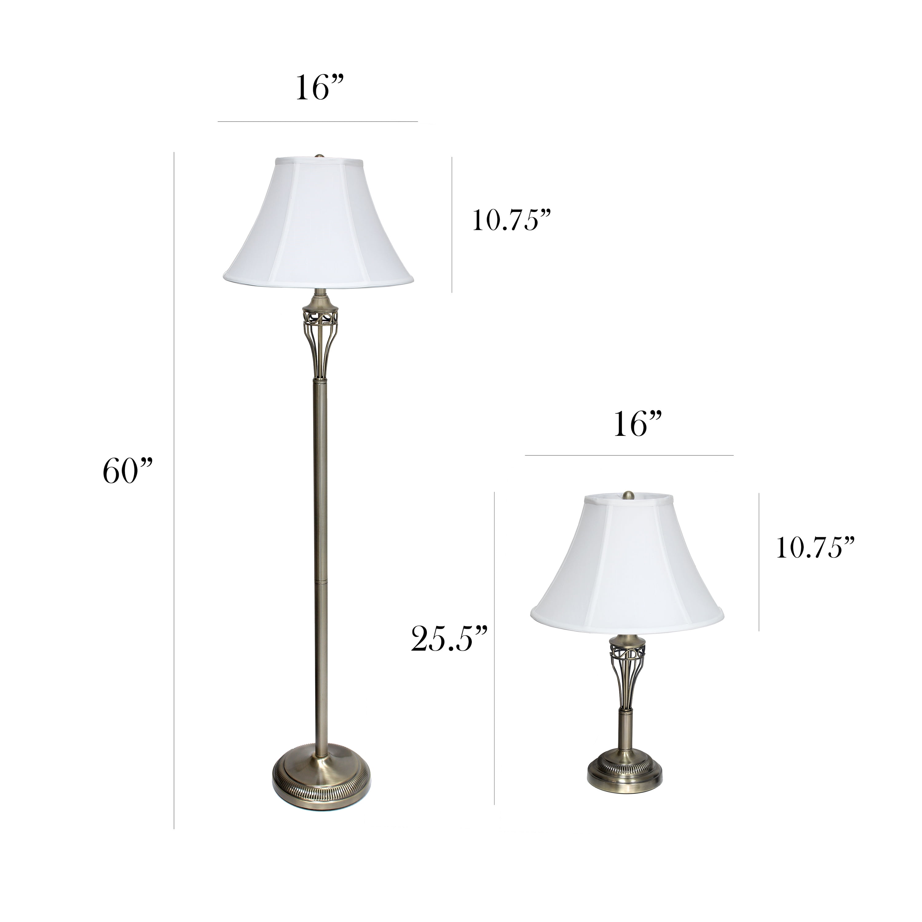 Set includes 2 table lamps and 1 floor lamp Beautiful white fabric shades and exquisite Antique Brass finish Table Lamps: H: 26”, Shades Diameter: 13.5″ Floor Lamp: H: 60.5”, Shade Diameter: 14.5” Floor lamp dimensions: 7L x 16W x 60H in. Each uses 1 x 100-Watt equivalent Type A medium base 3 way bulb (not included)