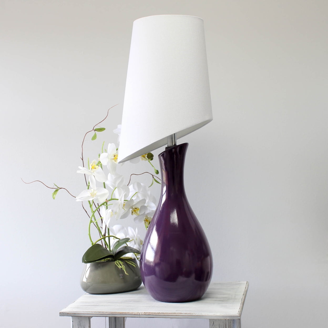 Elegant Designs Curved Purple Ceramic Table Lamp with Asymmetrical White Sha Add a contemporary flair to any room with this lovely tall curved table lamp. The eggplant color helps to create this fresh look. The asymmetrical white fabric shade completes the ensemble. Perfect lamp for a bedroom, living area, office, kid’s room, or college dorm. We believe that lighting is like jewelry for your home. Our products will help to enhance your room with chic sophistication. Material breakdown “Ceramic: 86.97%, Fabric: 6.30%, Iron: 6.72%”. Incandescent bulb type uses 1 x 60W type A Medium Base Bulb (not included). : Deep eggplant purple color. Contemporary style. Ceramic primary material. Asymmetrical white fabric shade material. Black cord color. Curvy base. Incandescent bulb type uses 1 light x 60Wattage. Weight: 5.13 lbs. Socket Nut shade security. 11″ shade diameter. Dimensions: 9.84″L x 9.84″W x 28.50″H. Model No: 1270-LT1040-PRP Shipping Details:
