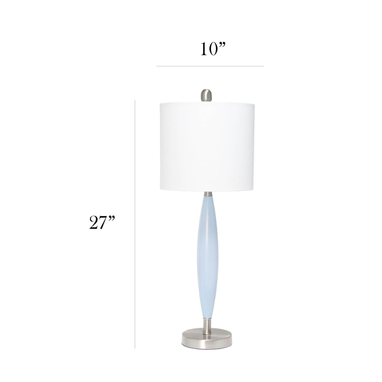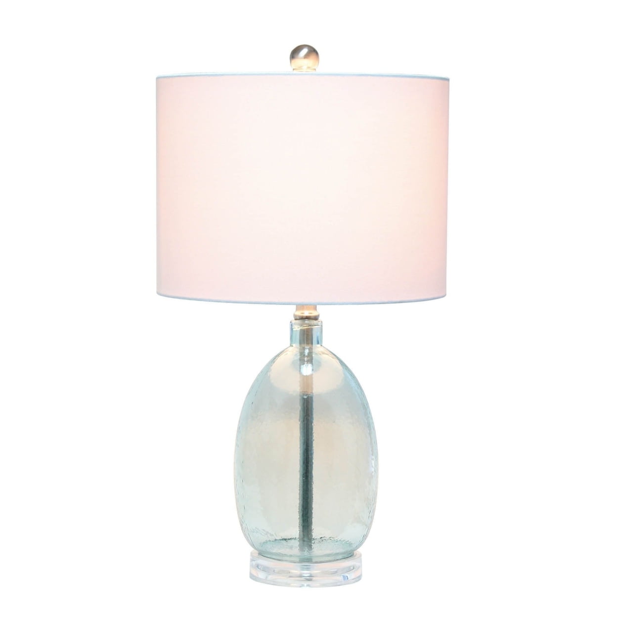 Clear blue oval glass base White fabric shade Easily accessible rotary switch located on the socket Uses 1 x 60W equivalent medium type A base bulb (not included) Lamp measures D: 12″ x 21.5″ Elegant and contemporary look