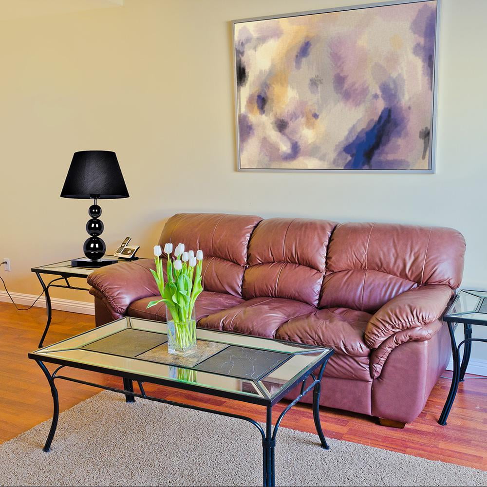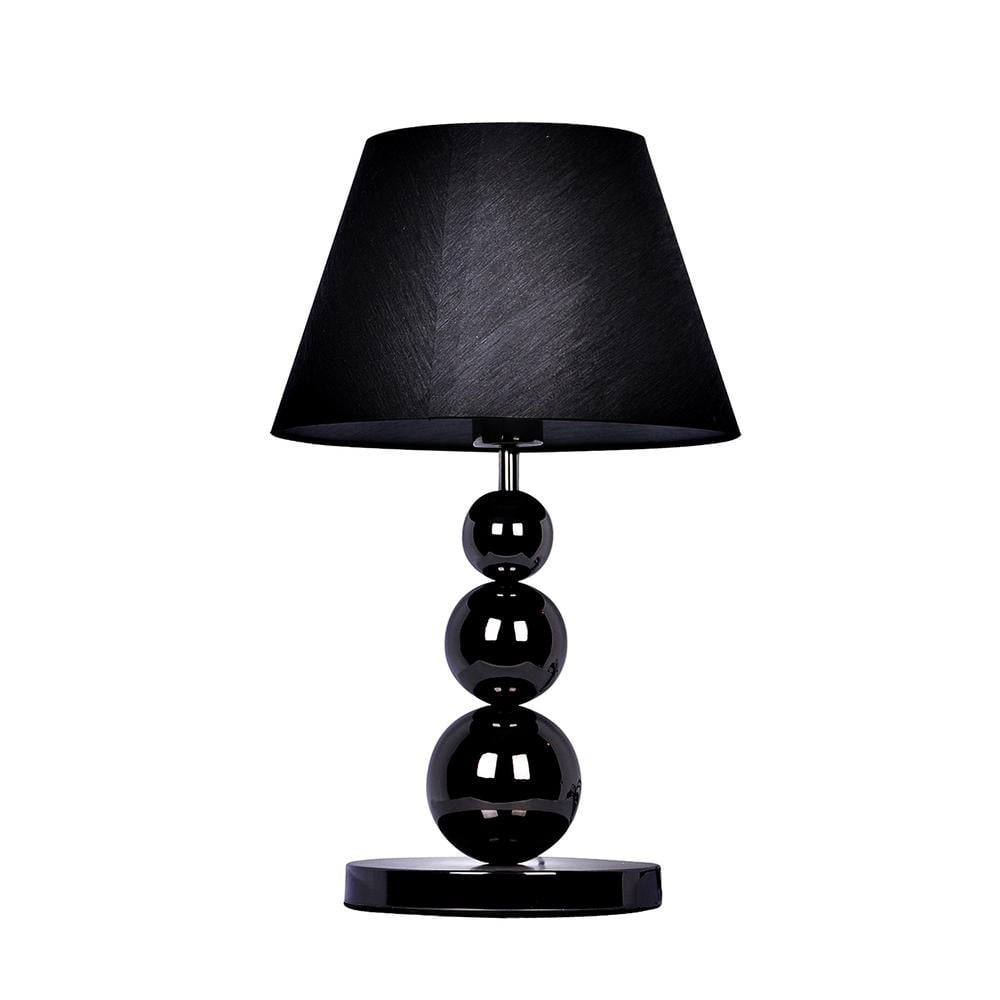 Black fabric shade Pearl black chrome finish Modern 3 tier ball design Height: 19″ Shade diameter: 11.81″ Uses 1 x 60W equivalent type A medium base bulb (not included)