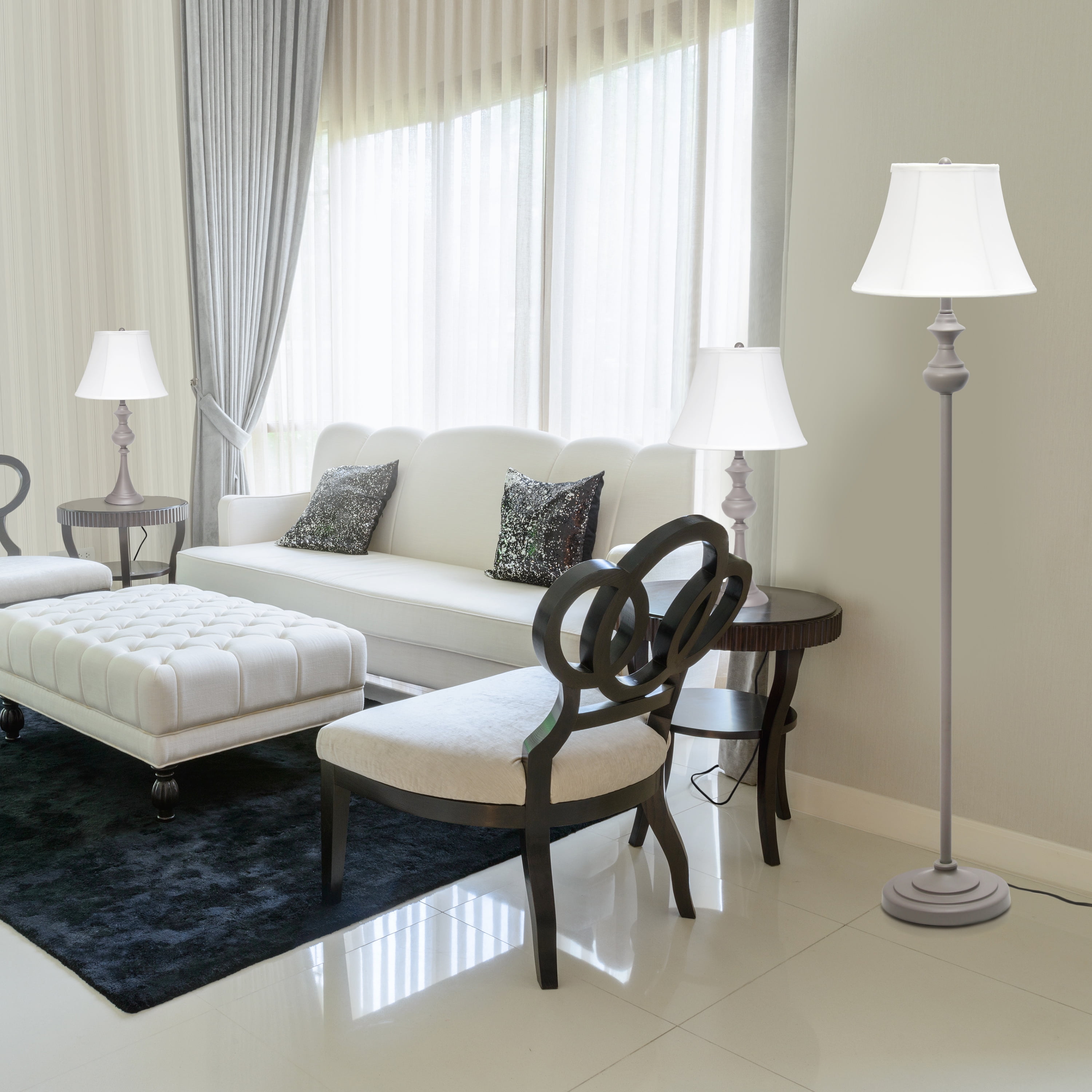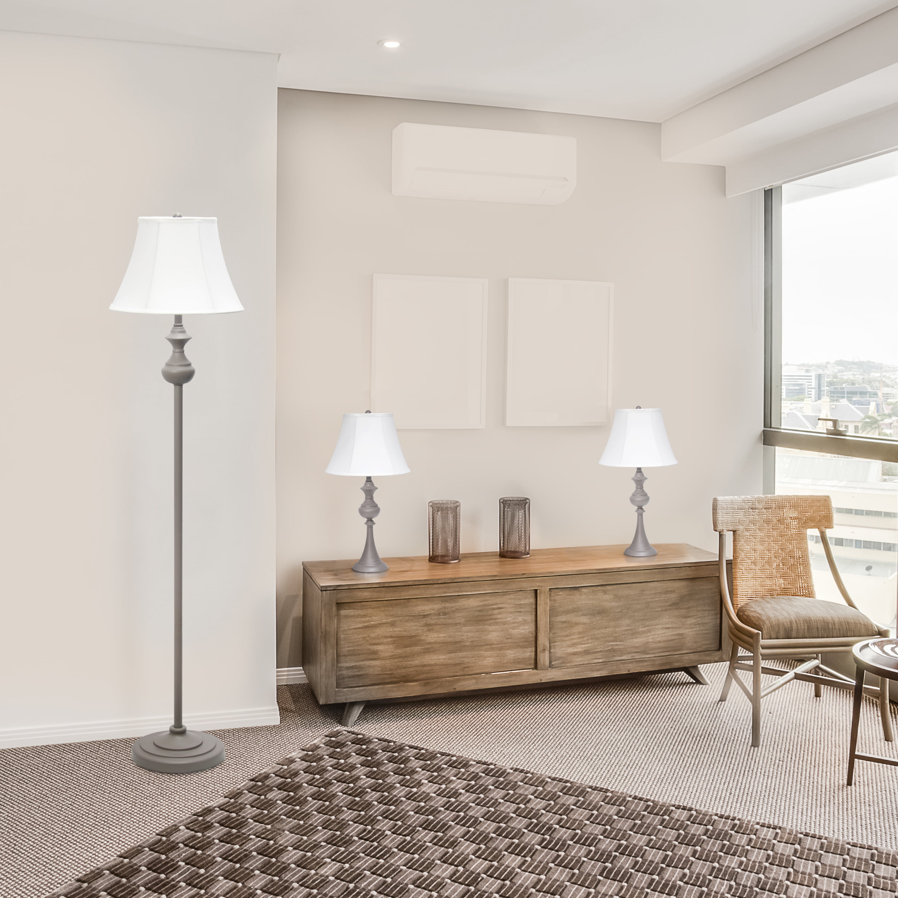 Elegant Designs Traditionally Crafted 3 Pack Lamp Set (2 Table Lamps, 1 Floor Lamp) with White Shades, Gray Description: As trends change throughout the years, sometimes it is best to have a few pieces of furniture that will survive years of transitions, like this table and floor lamp 3 pack set. It includes two table lamps and one floor lamp, each with curved and winding bases showcasing the right amount of detail, without overriding it’s simplicity. Matched with a pure white fabric empire shade, this set is bound to remain among your timeless favorites! Set includes one (1) floor lamp and two (2) table lamps. Gray painted finish on metal lamp bases. Pure white bell shaped fabric shades. Perfect for bedroom, living room, foyer, dining room, or office! Each uses 1 x 100W 3-way Type A Medium base bulb (not included). Some assembly required. Features: Product Dimensions: Table: 14″L x 14″W x 26″H, Floor: 14″L x 14″W x 60″H. Product Weight: Table: 3.91 lbs, Floor: 9.68 lbs lbs. Switch Type: Rotary. Switch Location: Socket Finish Color: Gray/White Shades. Primary Material: Metal. Material Breakdown: 90% Metal plus 5% Fabric plus 5% Electrical Componets. Bulb included: No Bulb Type: Type A-19 3-Way Incandescent. Shade Diameter: 14.5. Shade Top Opening: 8. Shade Bottom Opening: 14.5. Shade Height/ Slant: 10 Shade Security: Harp. Number of Lights: 1 plus 1 plus 1. Maximum Wattage: 100. Shade Material: Fabric. Cord Color: Black. Cord Length: 72″ Style: Traditional. Base Type: E26. Base Dimensions: Table: 5.875″D x 16.5″H, Floor: 10″D x 50″H. Height From base to socket shade: Table: 19.25″ / 16″, Floor: 53″ / 49.5″ Brand Name: Elegant Designs Model No: 1270-LC1019-GRY