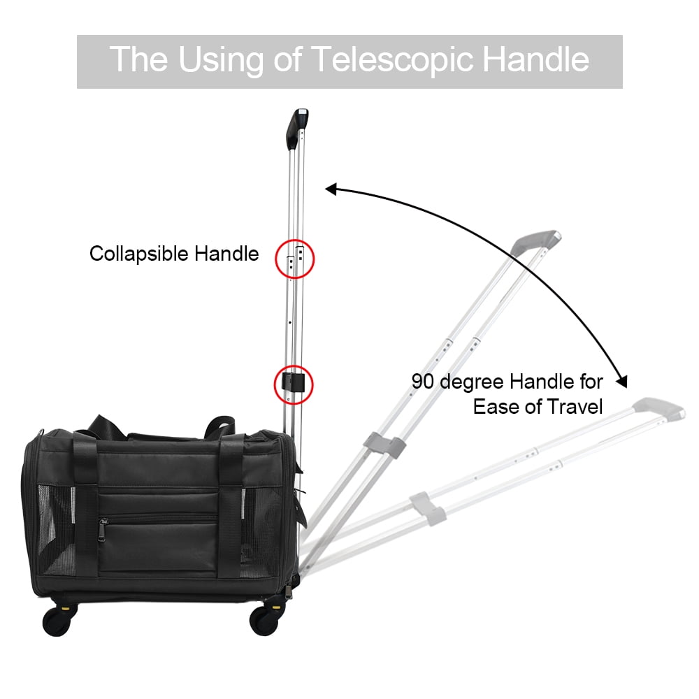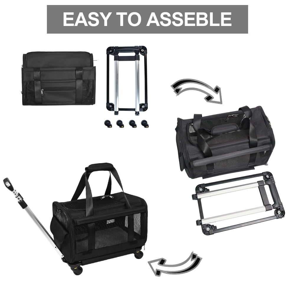 Size & Durable: 18″/45.7cm (L) x 11″/28 cm (W) x 10.5″/26.5 cm (H). Please check dimensions to determine if your pet is enough to fit within.Made of durable Oxford cloth and high grade polyester, anti-scratch and well constructed.Also, you can get a pet bowl,Name tag. Airline Approved:Designed to meet TSA and most airlines standards and can be placed under the front seat in the cabin,best fit for pets less than 15″ in length while laying down.(18″x11″x10.5″,Please check your airline size requirements before traveling) Durable Handle& Flexible Wheels:Convenient disassembly and assembly of the four wheels,Wheels smooth-rolling mobility in any direction.The telescoping handle extends easily and smoothly and the length is adjustable to accommodate varying heights.high-quality polyurethane double wheels provide extra stability and durability. Multiple ways to carry: It comes with a telescoping handle and a no-slip, adjustable shoulder strap for easy pulling and pushing, easy-to-assemble.This pet rolling carrier can pull rod, car seat, top of Suitcase,hand carry.Multi-purpose in one package, convenient to travel. AFTER SALE SERVICE:We provide one-year replacement service for all products at no cost.Finally, wish you a happy shopping!