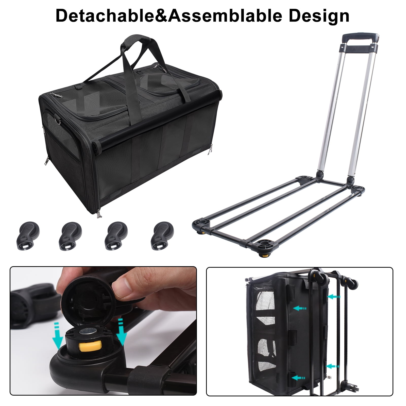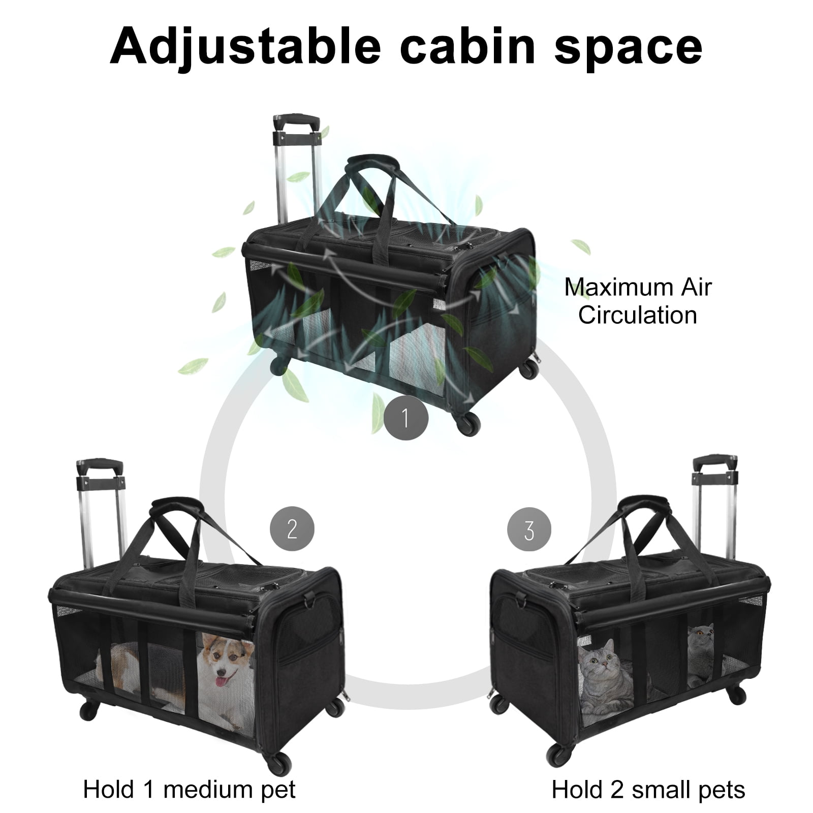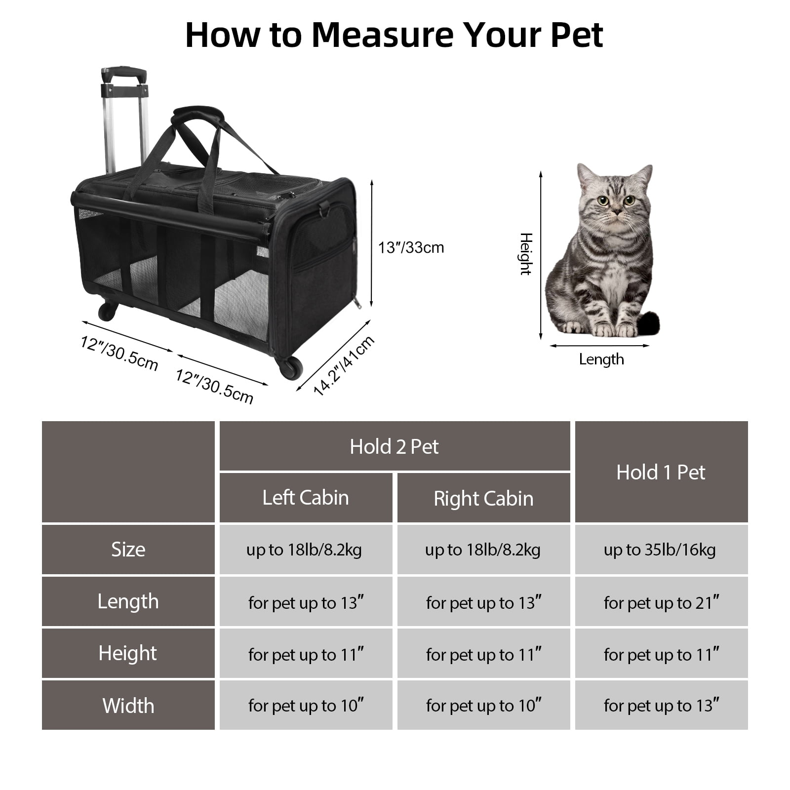 [Overall Size & Durable:]Double-Compartment design can hold two small pets,or fit one small to medium sized pet by removing the divider,realizing double-Compartment and single-Compartment free switching in a few seconds.The Double-Compartment pet rolling carrier can hold two 16-pound pets or one 35-pound pet.Soft-sided pet rolling carrier is made of durable cation linen and high grade polyester,anti-scratch.(Add:It may not meet the requirements of airline due to the large size) [Durable Handle & Flexible Wheels]:Convenient disassembly and assembly of the four wheels,Wheels smooth-rolling mobility in any direction.The telescoping handle extends easily and smoothly and the length is adjustable to accommodate varying heights.high-quality polyurethane double wheels provide extra stability and durability. [Durable Handle & Flexible Wheels]:Convenient disassembly and assembly of the four wheels,Wheels smooth-rolling mobility in any direction.The telescoping handle extends easily and smoothly and the length is adjustable to accommodate varying heights.high-quality polyurethane double wheels provide extra stability and durability. [Multiple ways to carry]: It comes with a telescoping handle and a no-slip, adjustable shoulder strap for easy pulling and pushing, easy-to-assemble.This pet rolling carrier can pull rod, car load, hand carry. Multi-purpose in one package, convenient to travel.(90 degree Handle for Ease of Travel.The handle is very sturdy,and the four Wheels very smooth and it can absorb the shock of the ground,smooth and quiet.When the carrier turns, it will not lean.) [Sturdy & Soft Bottom Mat]This bottom 2 mats has comfortable plush surface,and build in firm MDF board,very comfy and safe to sit or sleep for your pet,can washed separately.There are zippered doors on each side. [AFTER SALE SERVICE]:We provide one-year replacement service for all products at no cost.If you encounter any problems with the product,please don’t be angry and don’t worry.Please feel free to contact us if you need any help from us or any inquiries about the pet carrier,we will give you a satisfying solution within 12 hours.Finally, wish you a happy shopping!
