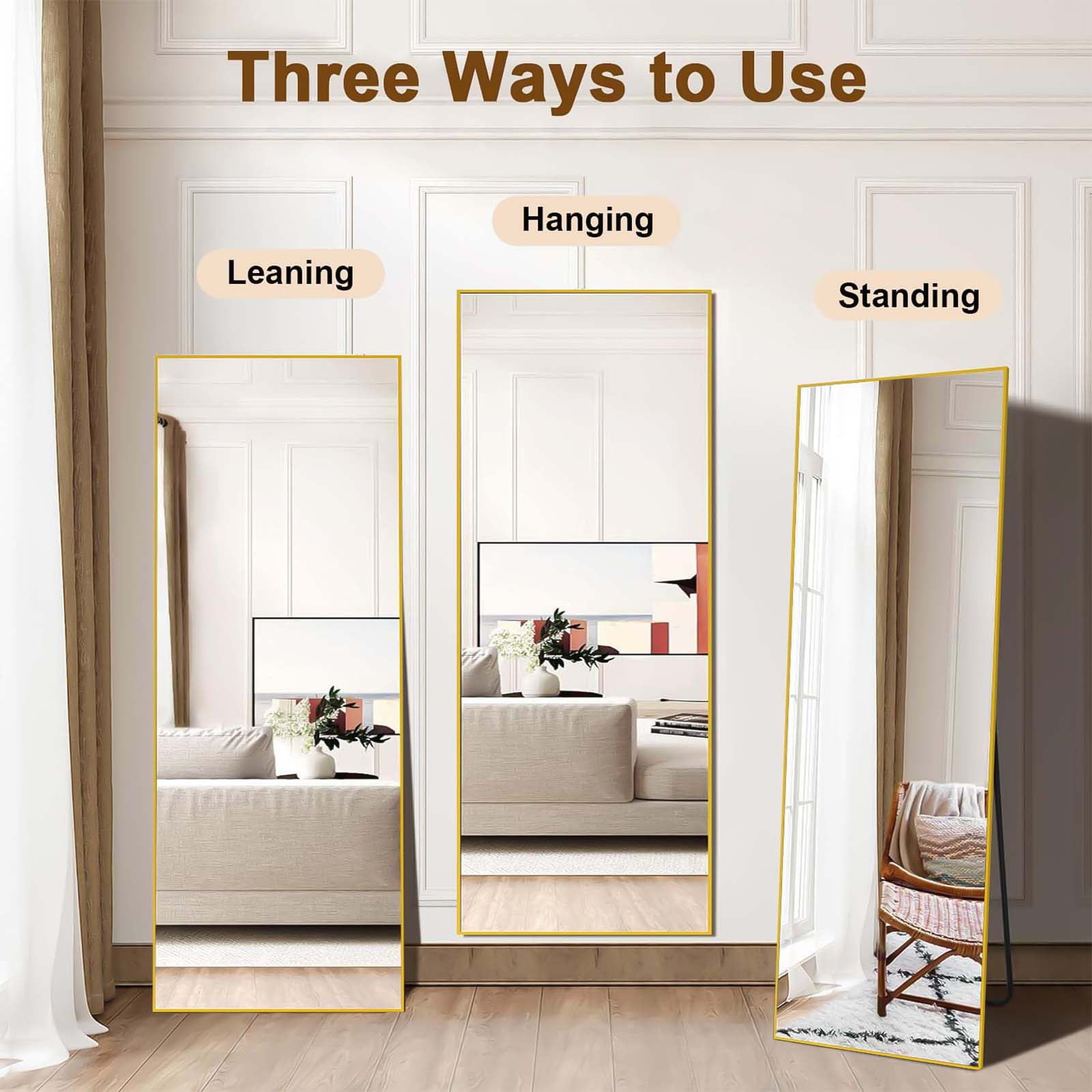 【Full-length Mirror】The mirrors for wall is 65 inches long and 24 inches wide, which is enough to truly and completely let you appreciate the whole body, and the modern and simple style can also fit perfectly into your space. 【Unique Design】 The top of the floor mirror adopts a unique smooth rectangular frame design, which adds beauty on the basis of practicality. The slim aluminium frame adds a touch of design to the body mirror, allowing him to become an ornament for your space. 【High Definition Imaging Glass】 Our standing mirror is made of 3mm high-definition nano glass. Upgraded sterling silver layer explosion-proof nano glass, more high-definition, not easy to break, strong and durable. Even if it is accidentally damaged by an external force, the fragments of the mirror will not scatter and protect you and your family. 【Multiple Functions】The bedroom full length mirror can be tilted to the wall or mounted vertically on the wall. You can also open the stand and place it anywhere. It is suitable for bedrooms, living rooms, cloakrooms, home gyms, hallways, clothing stores, etc.