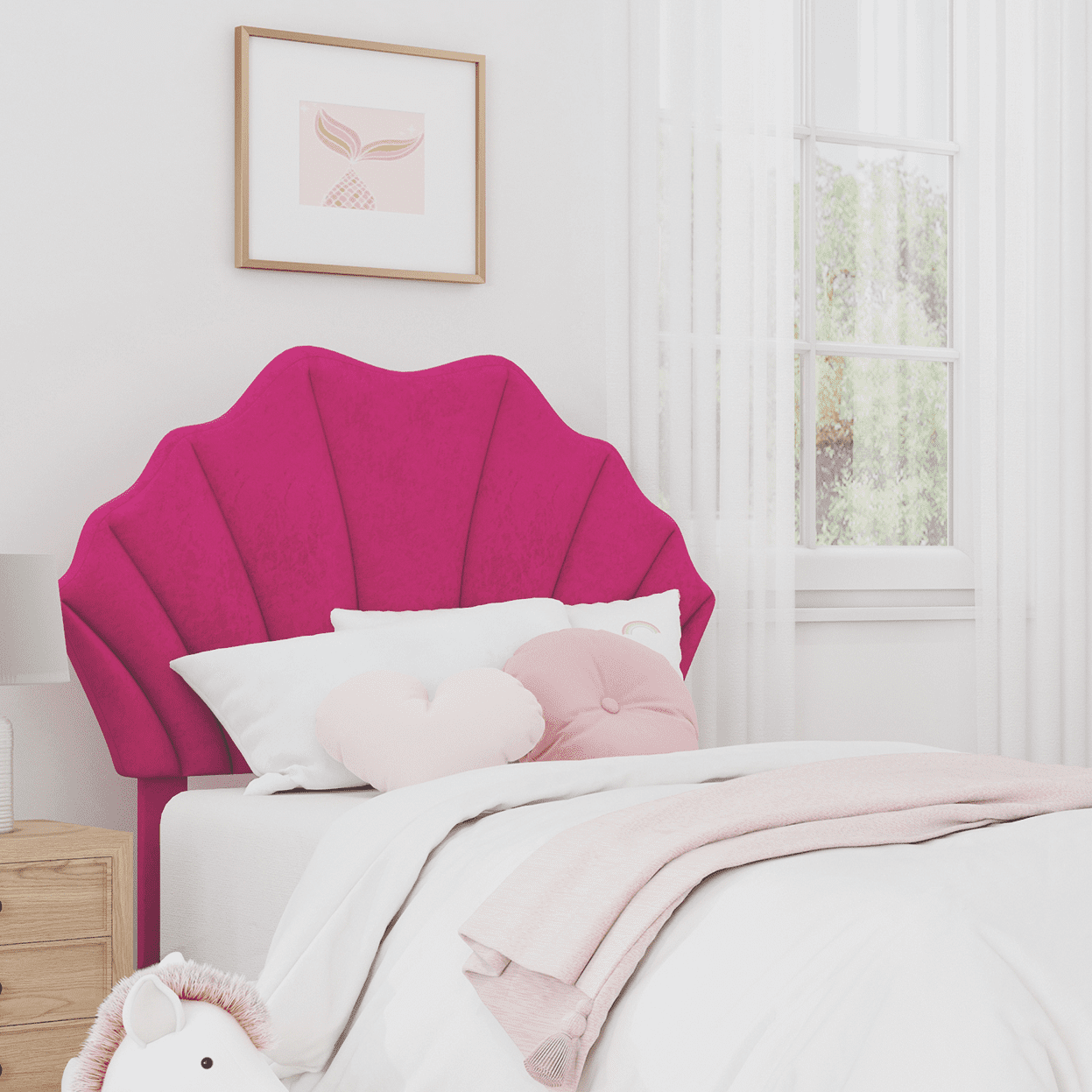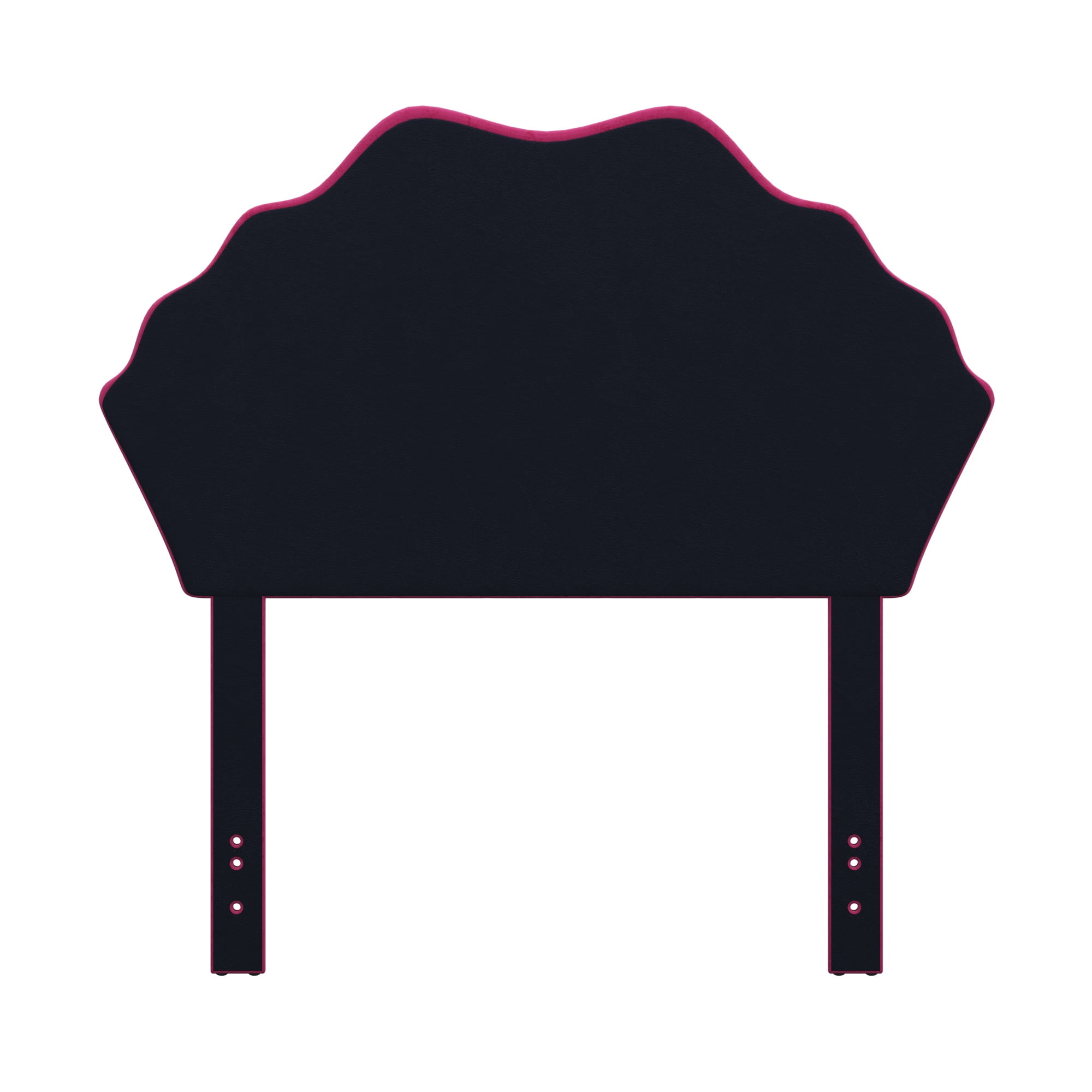 Modern glam upholstered headboard in a seashell silhouette Channel tufting and faux velvet upholstery accentuate the glamour of this piece Wooden construction; 100% polyester upholstery in a playful pink Overall Dimensions: 48H x 49.25W x 3.5D Assembly required Item will ship in one box Works with twin size bed frame Spot or wipe clean Headboard is padded for maximum comfort Residential usage only