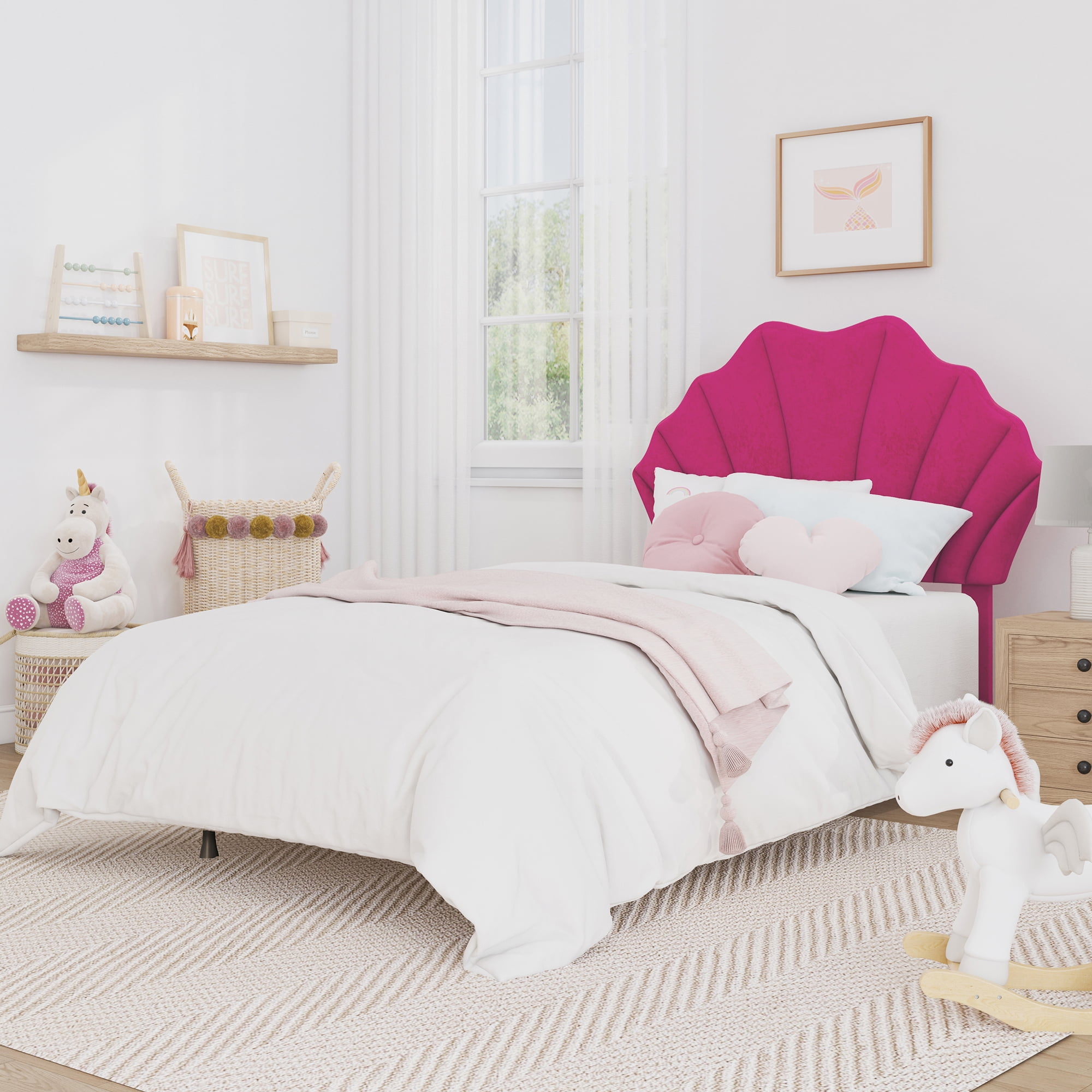 When life is a paradise and you’re at the center of it all, you deserve the perfect, swoon worthy bed. Sink into this plush upholstered twin headboard and be transported to your happy place. This headboard makes a statement with a glamorous seashell silhouette, complete with luxurious channel tufting and sweeping, dramatic scallops. Upholstered in a dreamy faux velvet in playful pink, this piece is great for when you need to press pause on the party. Begin and end your day in beautiful repose. Bed frame not included. Assembly required.