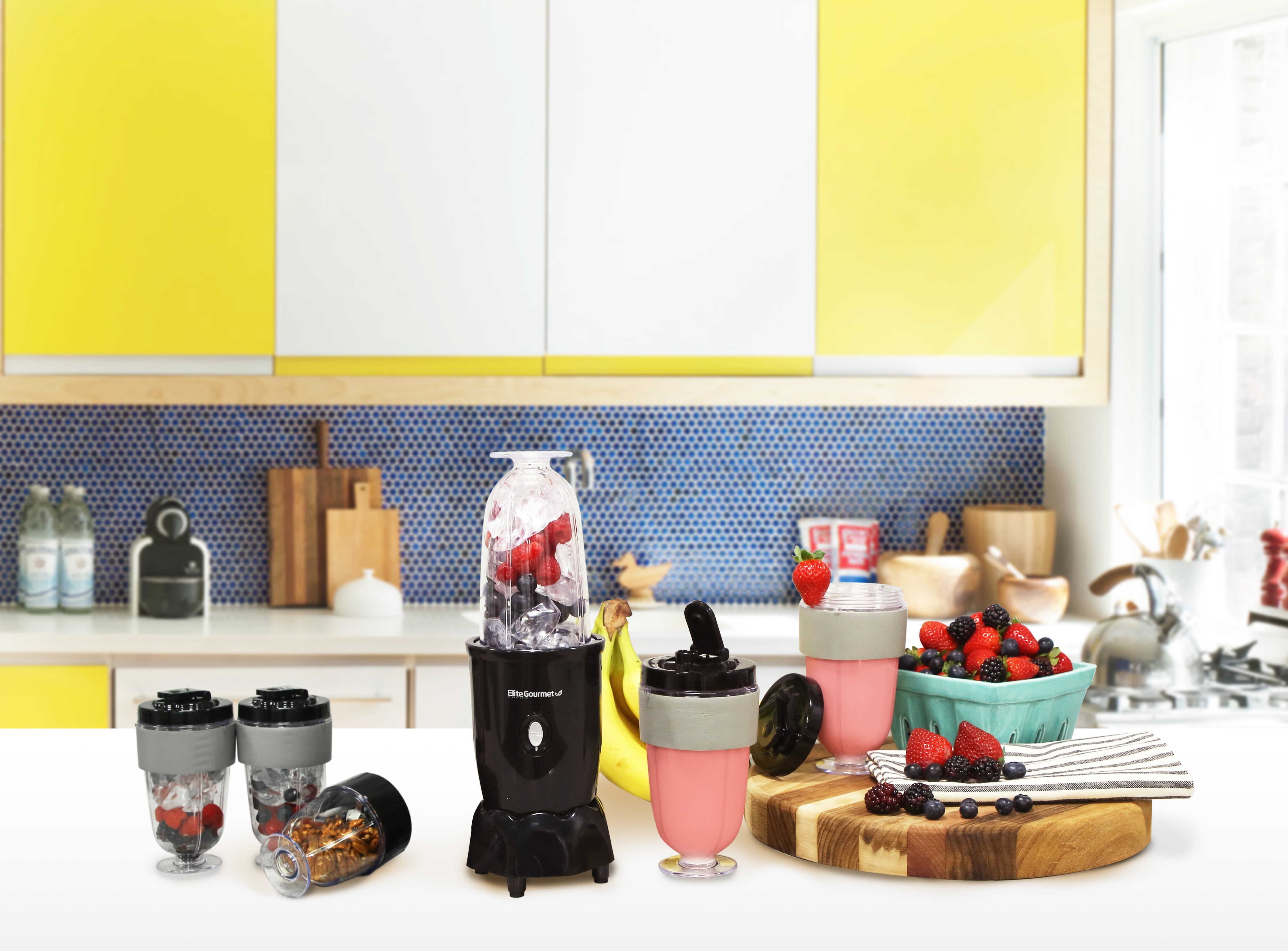 The 17 piece Elite Cuisine Personal Drink Mixer & Blender is the perfect complement to your active lifestyle. Included are four spill proof 16 oz cups that feature foam grips to ensure that you hang on to your beverage while you are on the move. You can also use the small grinder cup to shred cheese with ease, grind coffee beans, or dice vegetables to make fresh chunky salsas. Make healthy and delicious drinks such as smoothies protein shakes, milk shakes and more. Accessories Include: Four 16oz. cups Four spill-proof lids Four foam-grips One 16oz. blending cup One 8oz. grinding cup Stainless steel blending blade Stainless steel chopping blade Powerful motor base.