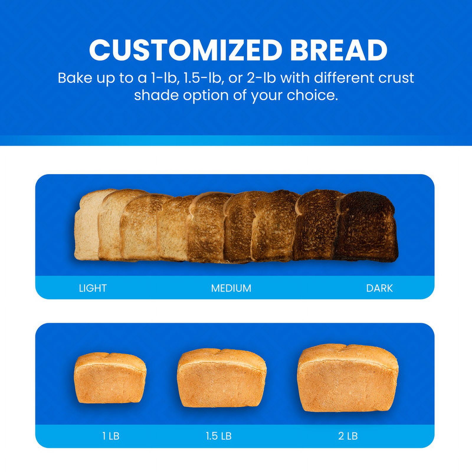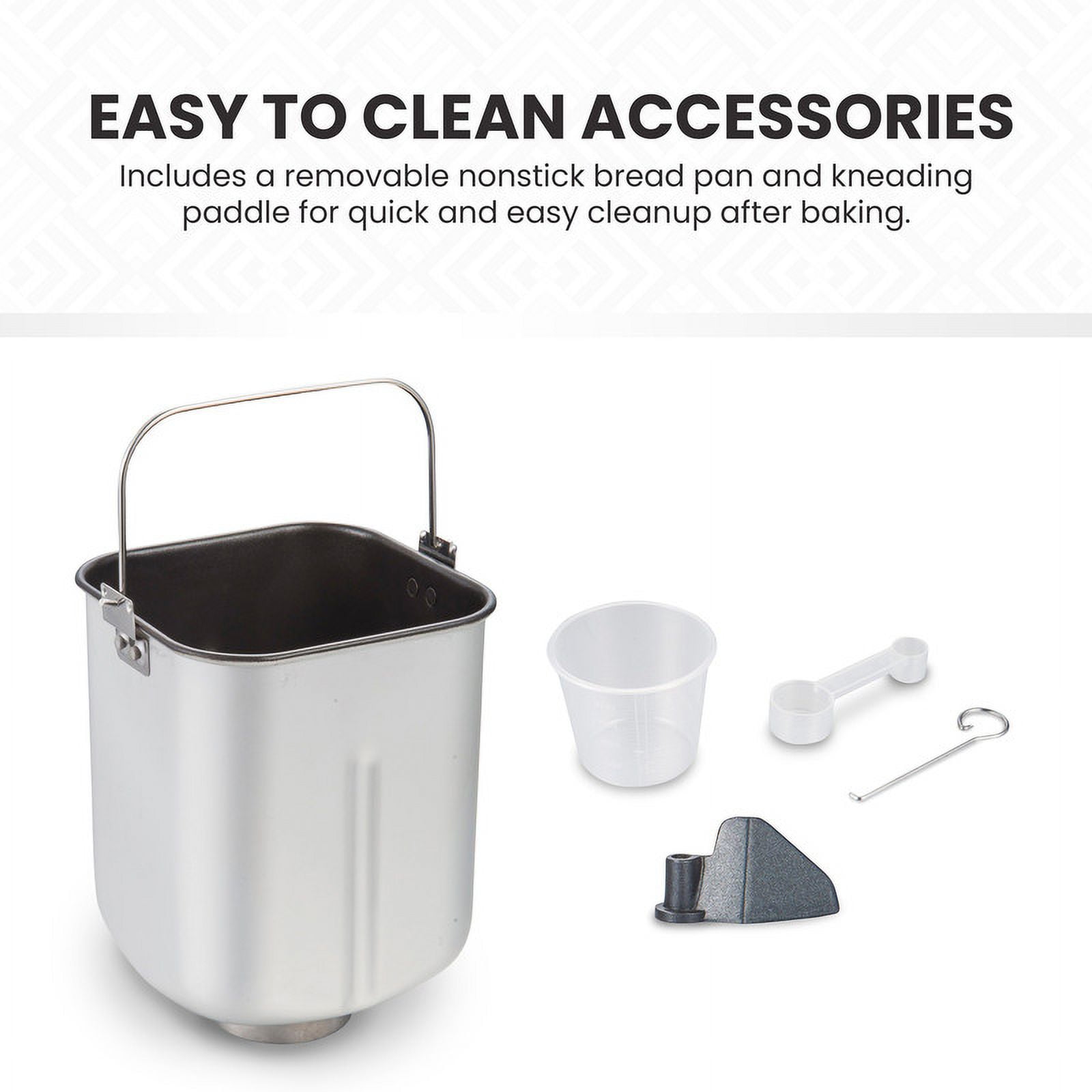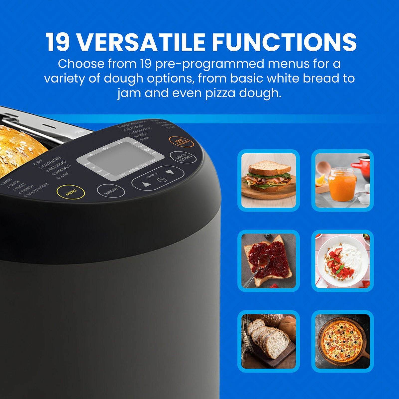 Make 1lb, 1.5lb or 2lb loaves of bread Large LCD display with 19 digital preset functions 60-minute keep warm function Up to 15-hour delay timer Non-stick dishwasher safe pan for easy cleaning Cool-touch body Glass viewing window Adjustable crust control: light, medium, dark Includes measuring cup, spoon, mixing paddle & baking pan hoo 10-minute electric power cut off memory functio Anti-slip silicone feet 550 watts Enjoy fresh bread without preservatives. Make Gluten-free breads Don’t spend all day in the kitchen. Just add ingredients, select your cycle and press start. Prepare doughs, jams (fresh fruit), yogurt and other quick meals It’s not just a bread maker but a “Meal Maker!