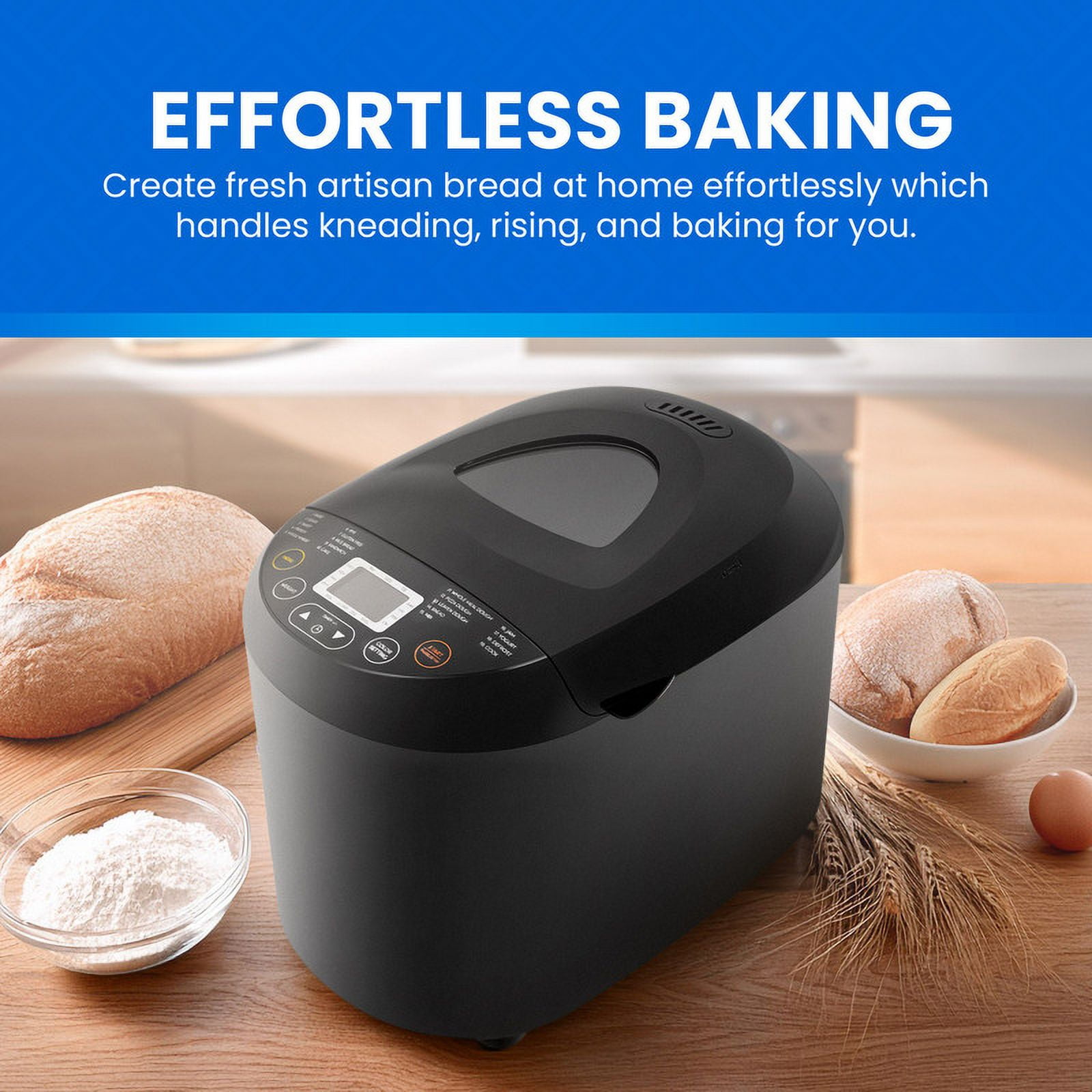 The Elite Cuisine 2 lb Digital Bread Machine simplifies the process of making preservative-free homemade bread, perfect for busy chefs. With 19 pre-set functions tailored for various types of bread and flours, including basic, quick (no yeast), sweet, French, whole wheat, rye, gluten-free, rice, and sandwich breads, as well as various doughs like pizza, whole meal, and leaven, this appliance makes bread-making effortless. Simply add your ingredients, choose your cycle, and press start. You’ll quickly find yourself experimenting with new recipes, and soon, family and friends will be requesting more of your delicious homemade creations. Additionally, you can make jams, yogurt, and bake cakes. The delay function allows you to bake overnight, ensuring warm bread is ready in the morning. Customize your bread with light, medium, or dark crust settings, and add nuts, seeds, or dried fruits for a personal touch. It also mixes and prepares dough for pizza, focaccia, or cinnamon rolls. The machine includes an instruction manual, tips, and recipes, making it a versatile appliance that saves both time and money.