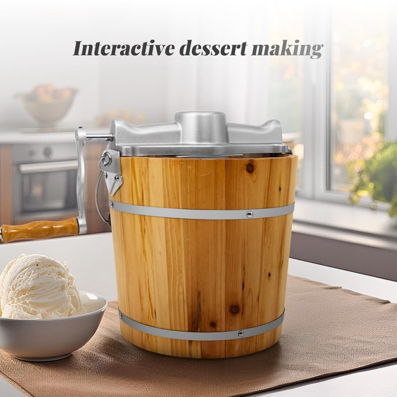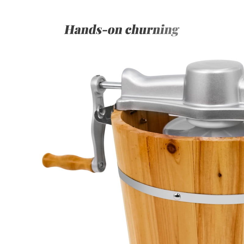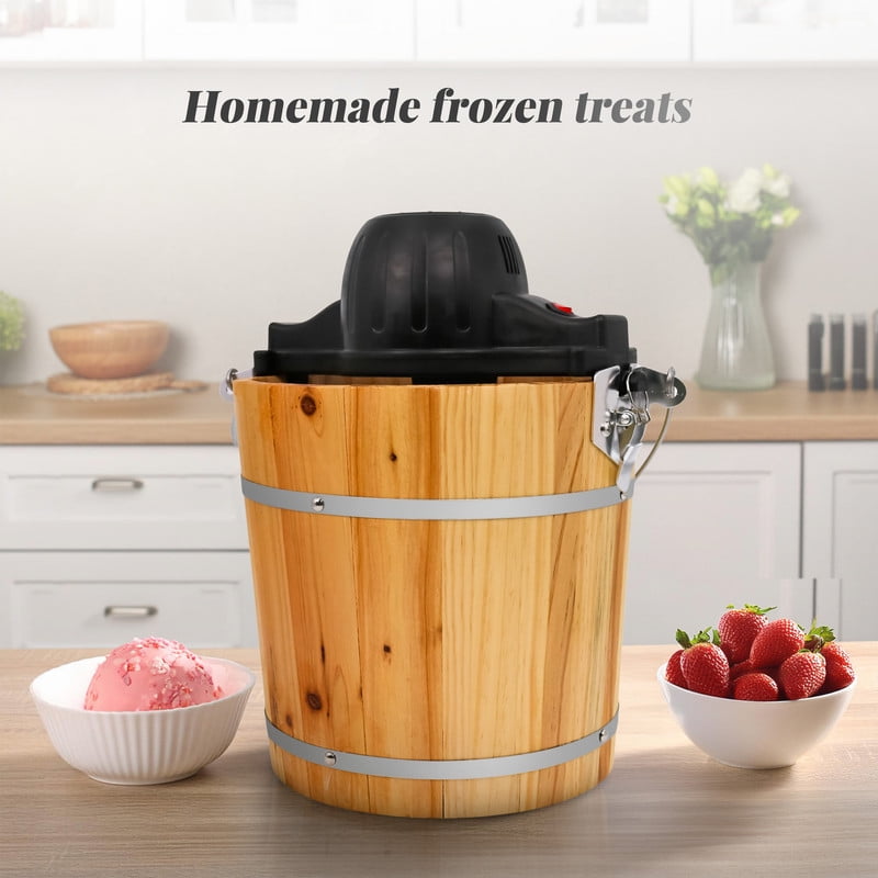 Makes 4 quarts of cold and creamy ice cream, gelato, frozen yogurt, or sorbet. Hand-crafted solid pine wood bucket. Easy to operate and clean. Great for barbeques, family parties and picnics. Heavy duty aluminum freezing canister. Powerful electric motor-driven paddle to whip creamy consistency. Use included classic die-cast hand crank to manually churn to firmer consistency. Makes fresh ice cream in just 40 minutes. Motor is equipped with over-heat protection.
