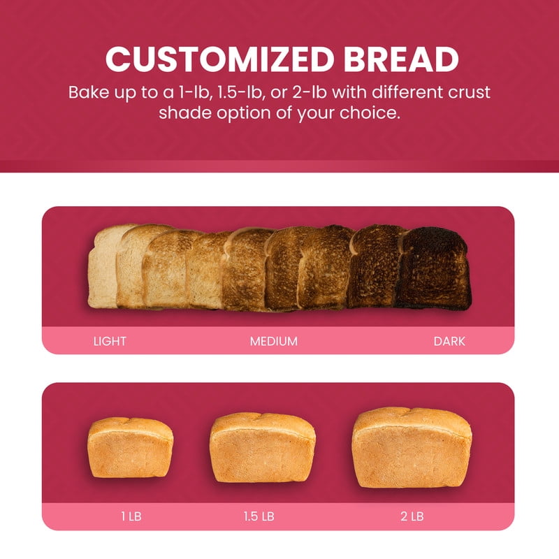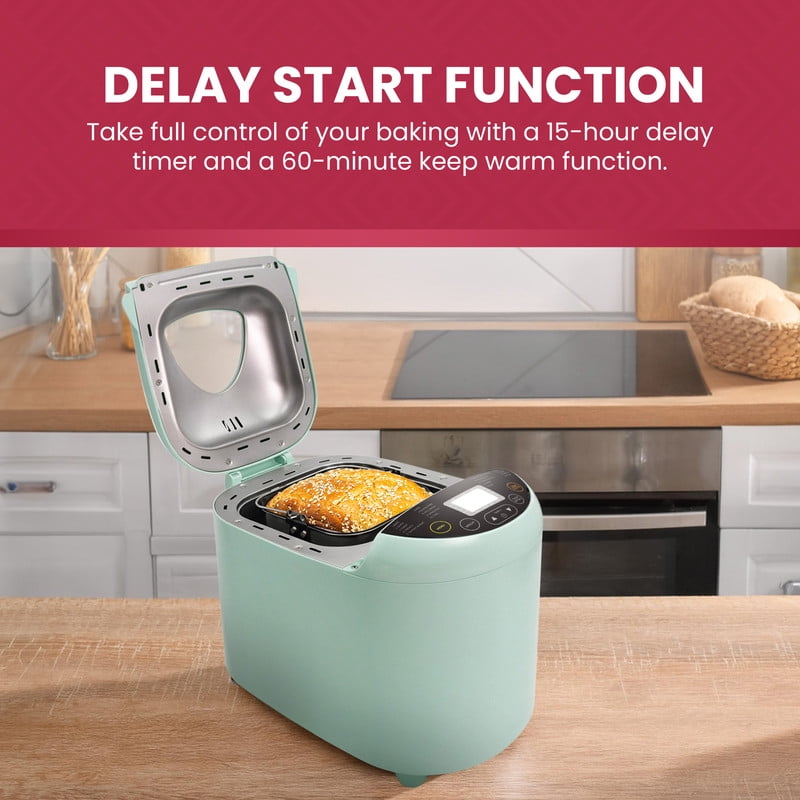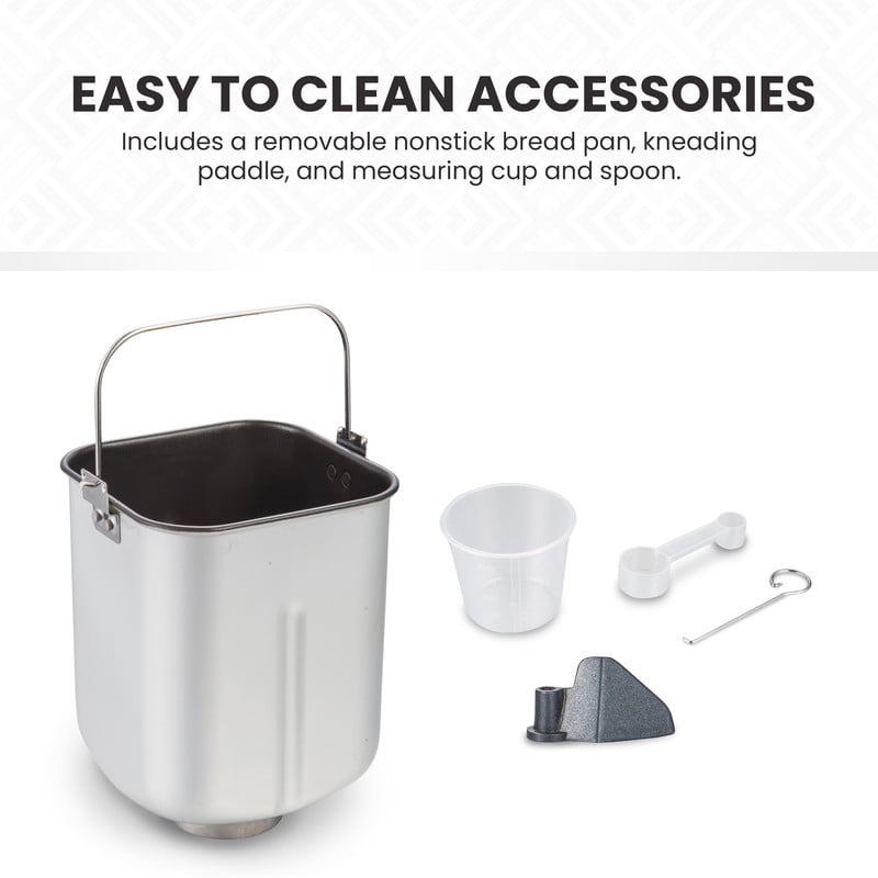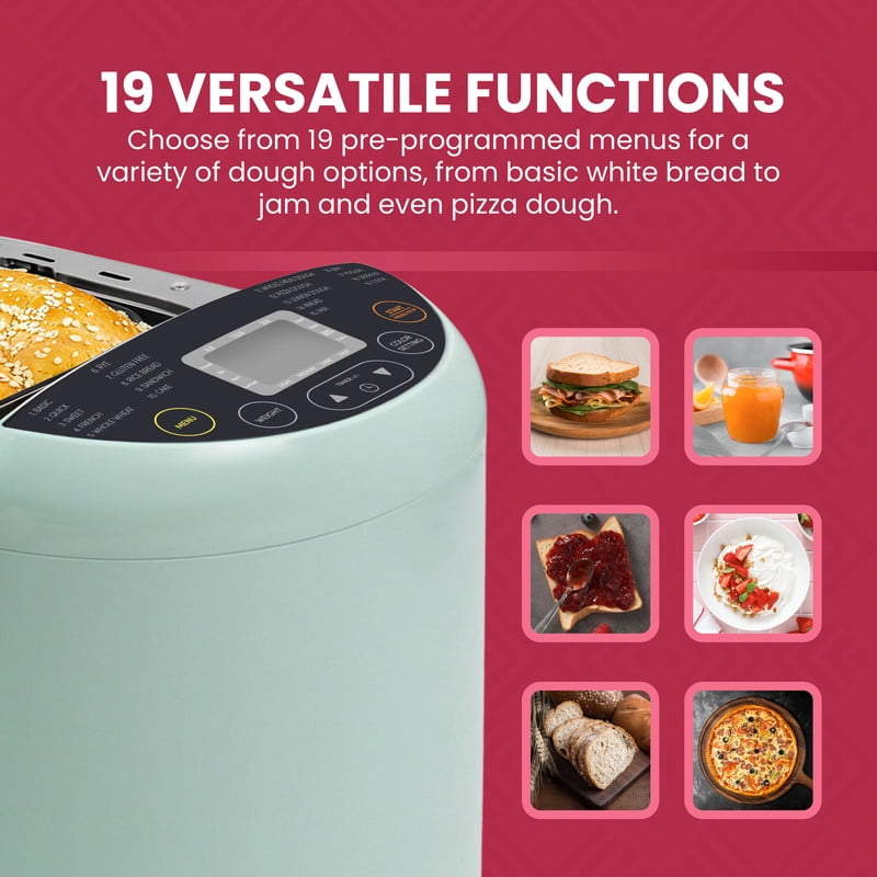 Make 1lb, 1.5lb or 2lb loaves of bread Large LCD display with 19 digital preset functions 60-minute keep warm function Up to 15-hour delay timer Non-stick dishwasher safe loaf pan for easy cleaning Cool-touch body Glass viewing window Adjustable crust control: light, medium, dark Includes measuring cup, spoon, mixing paddle & loaf pan hook 10-minute electric power cut off memory function Anti-slip silicone feet 550 watts Enjoy fresh bread without preservatives. Make Gluten-free breads Don’t spend all day in the kitchen. Just add ingredients, select your cycle and press start. Prepare doughs, jams (fresh fruit), yogurt and other quick meals It’s not just a bread maker but a “Meal Maker!