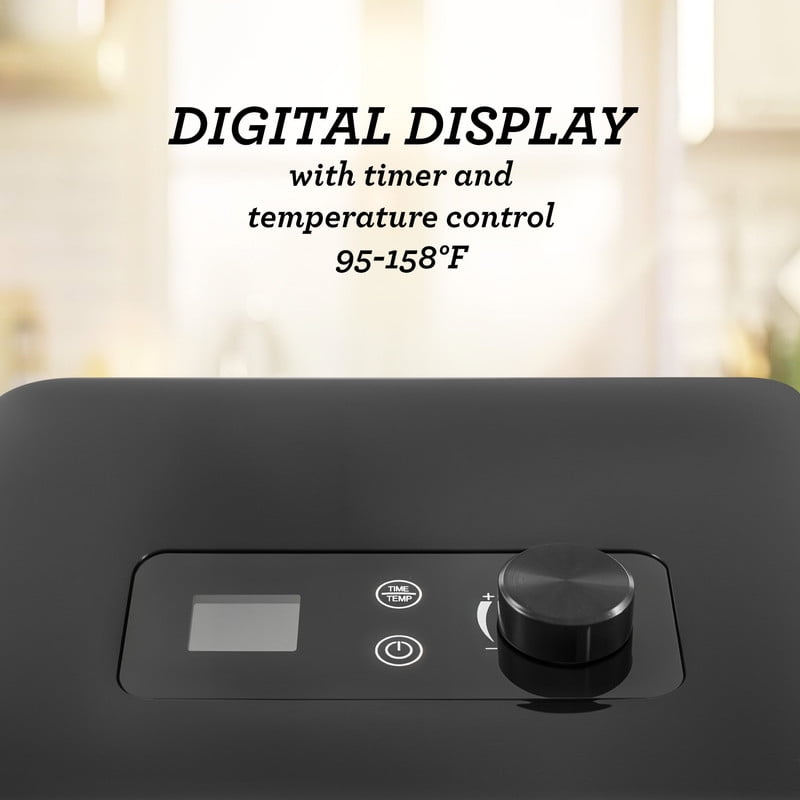 4 stainless steel mesh dehydrating trays for dehydrating foods at a fraction of the cost of commercially dehydrated foods with no additives or preservatives Each drying tray measures 9.3″ x 7.1″= 264 square inches of drying space Dry a variety of foods: fruits, vegetables, meats and more as healthy snacks. Trays are fully immersible and dishwasher saf Lightweight, counter-top design Horizontal air flow. No tray rotation needed. Ultra-quiet fan Digital control panel with LED display Adjustable temperature from 95-158°F Adjustable timer from 0-24 hours 350W Manufactured in Chin ETL approved The trays are dishwasher-safe