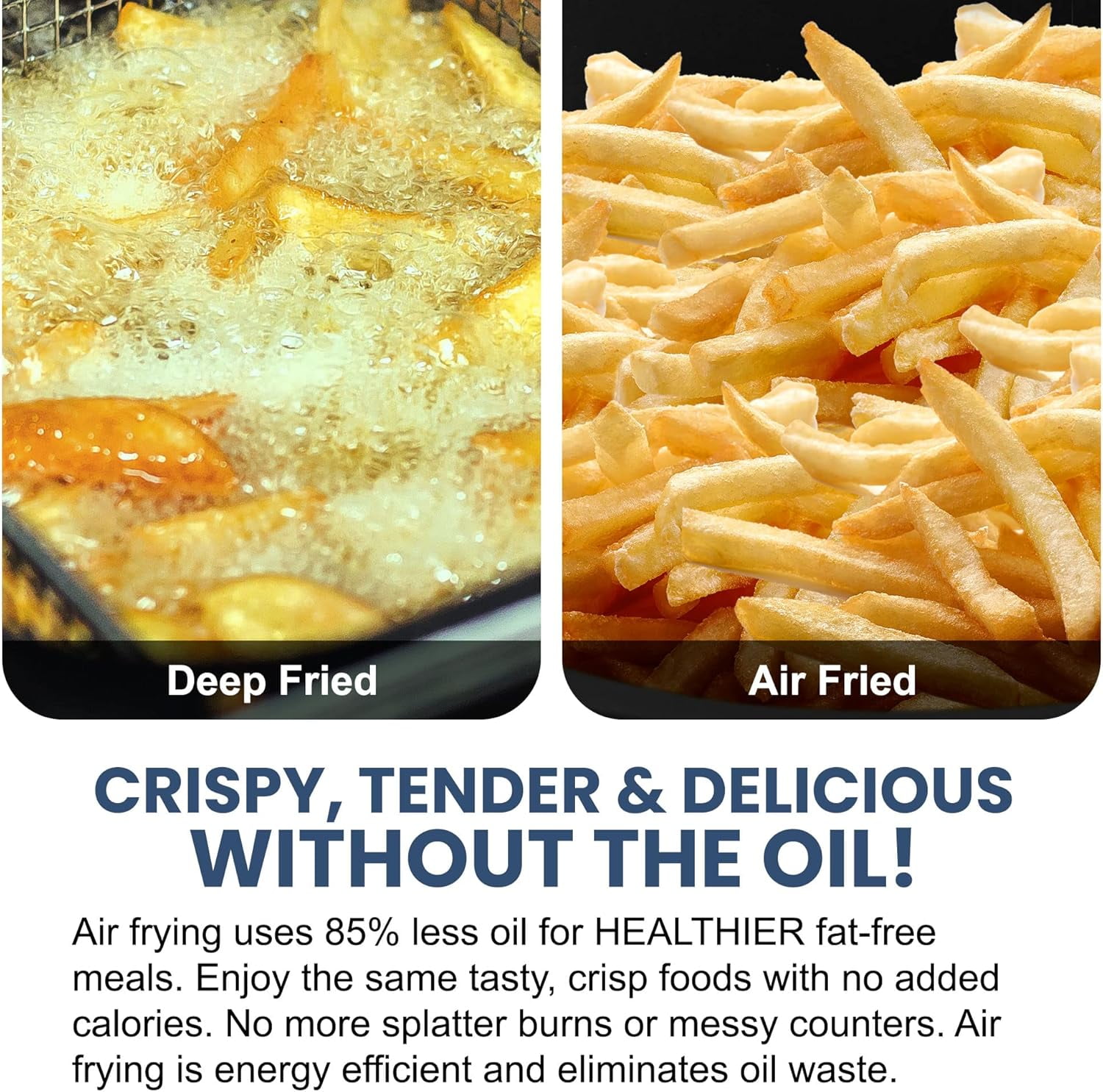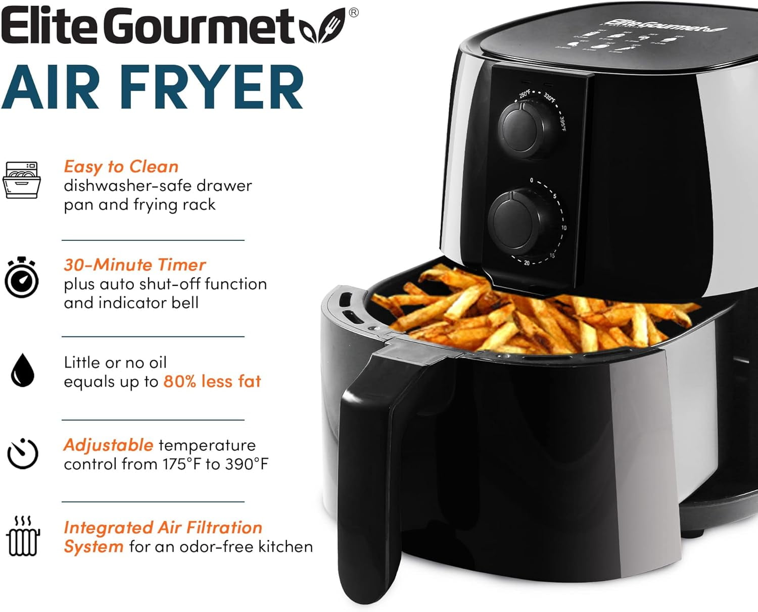 The Elite Gourmet Oil-Free 4 quart Digital Air Fryer can handle a wide array of cooking tasks. With its easy to use dial controls for setting temperature & time, you can fry, cook, or even bake your favorite family meals and snacks with ease! Not only can you cook foods without the mess of oil but you can cook UP TO 85% faster than traditional cooking methods which saves you time and energy. Unlike most conventional deep fryers, the Elite Gourmet Oil-Free Air Fryer’s unique vapor system combined with circulating hot air will automatically make foods crispier and of course healthier without oil.