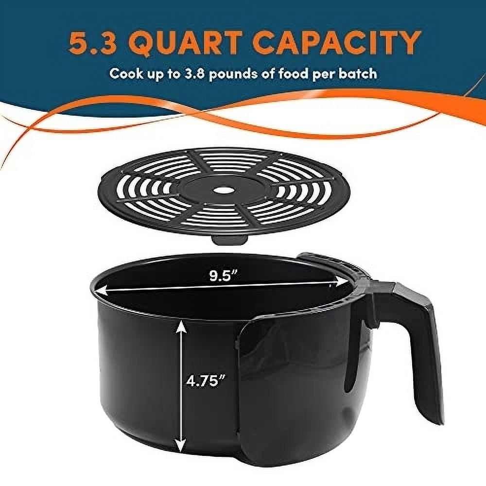 Unlike conventional deep fryers, the Oil-Free Rapid Air Fryer’s unique heating system combined with circulating hot air will automatically make foods crispier and of course healthier without oil. Large capacity 5.3 quart frying tank with non-stick coating. Digita l control panel with LED display & heating indicator. Air fries food without oil, Adjustable Timer (60 minutes) & Temperature control (176-392 °F). 304 stainless steel heating element, Automatic shut-off with ready alert. Cool-touch frying tank handle, Non-slip feet, Powerful 1350 watts for great air frying results.