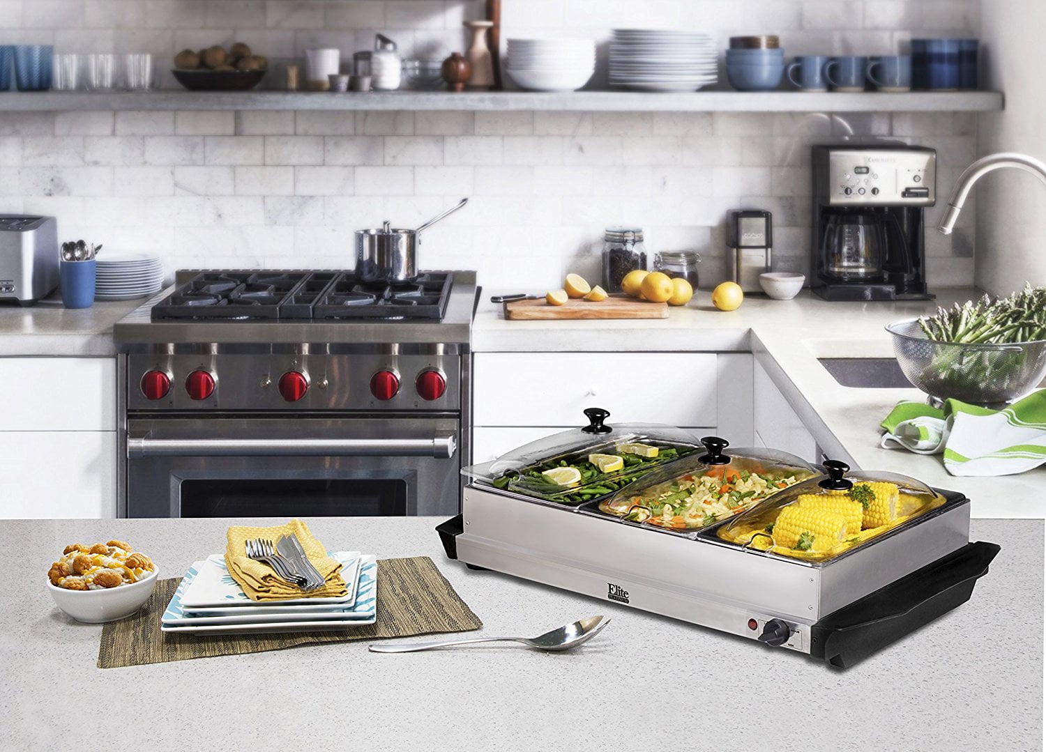 Present a variety of different dishes in an elegant display with the Elite Platinum 3 x 2.5-quart Buffet Food Server. This classic set features three covered compartments that are ideal for hot and cold foods. The stainless steel buffet server comes with three slots, each with clear dome lids and cool touch handles. Each one has adjustable settings and a flat warming surface that is ideal for keeping foods at optimal serving temperature. Each unit has a capacity of 2.5 qts, making them ideally suited for storing hors d’oeuvres, sauces and sides. The Elite buffet server includes lids are designed with slots for utensils for added convenience. The lids have large top knobs for effortless placement and removal. The set is ideal for entertaining, catering or restaurant use. It’s covered under a 1-year warranty for added ease of use.