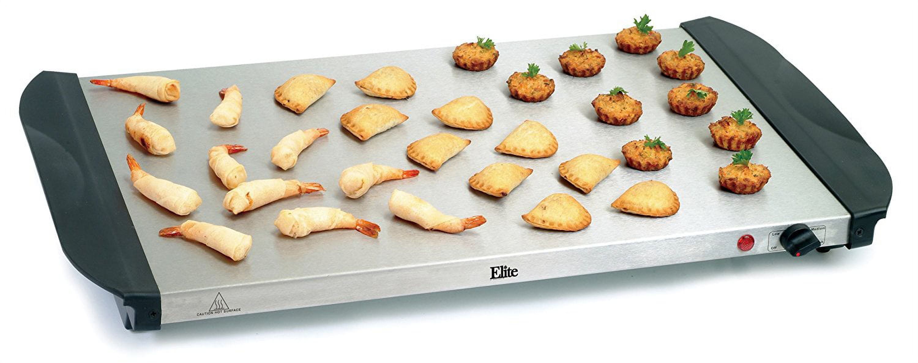Includes 3 buffet trays with lids Each tray has a capacity of 2.5 qt 2.5 qt capacity is ideal for serving hors d’oeuvres, sauces and sides Stainless steel buffet server with clear dome lids Cool-touch handles Elite buffet server has a flat warming surface that is just right for hors d’oeuvres Adjustable settings in each tray with a power indicator Dimensions: 26″ L x 13.3″ W x 7.3″ H Weight: 10 lbs Model number: EWM-6171 Keep your food continuously hot and fresh Lids come with slots for utensils Ideal for use at parties, restaurants or catering