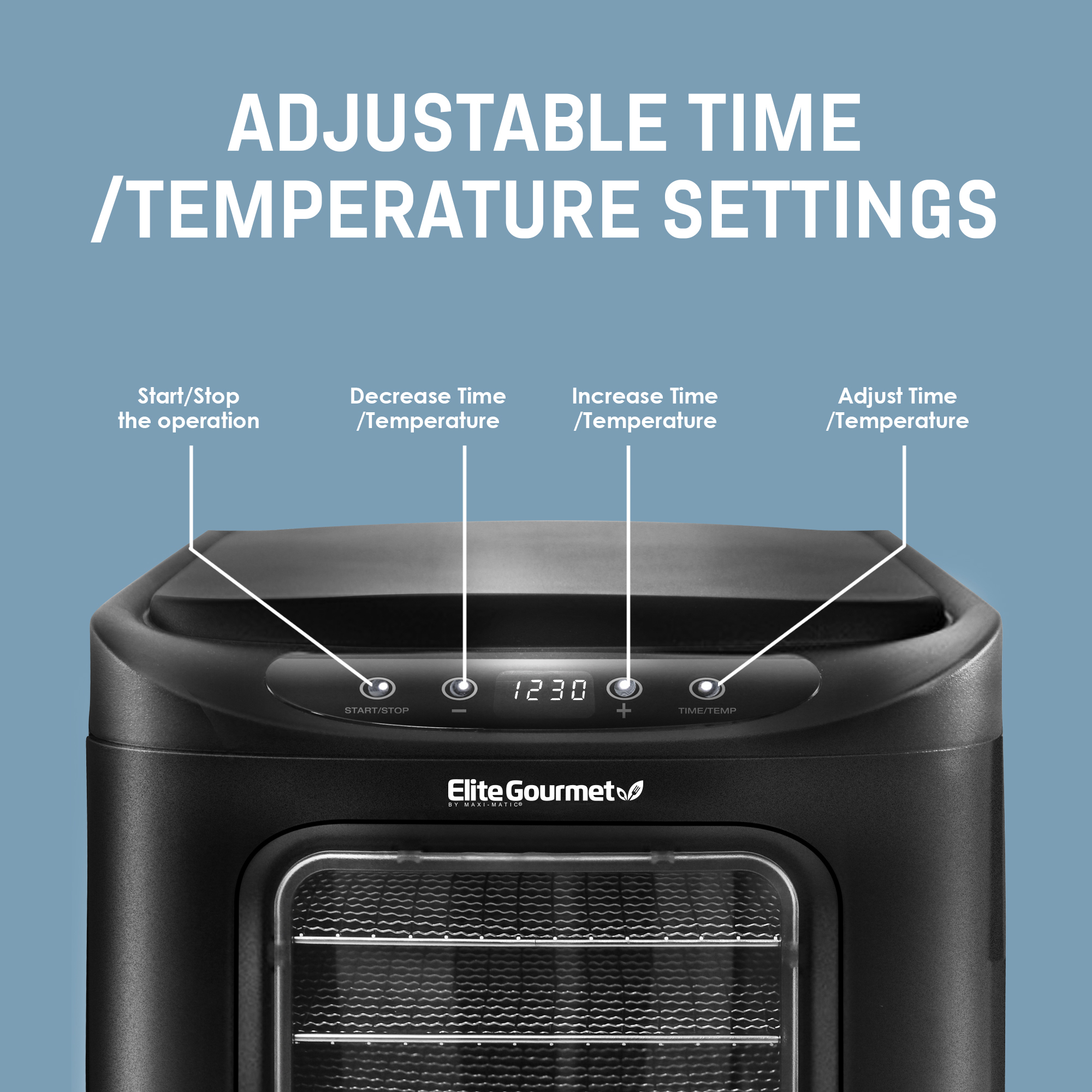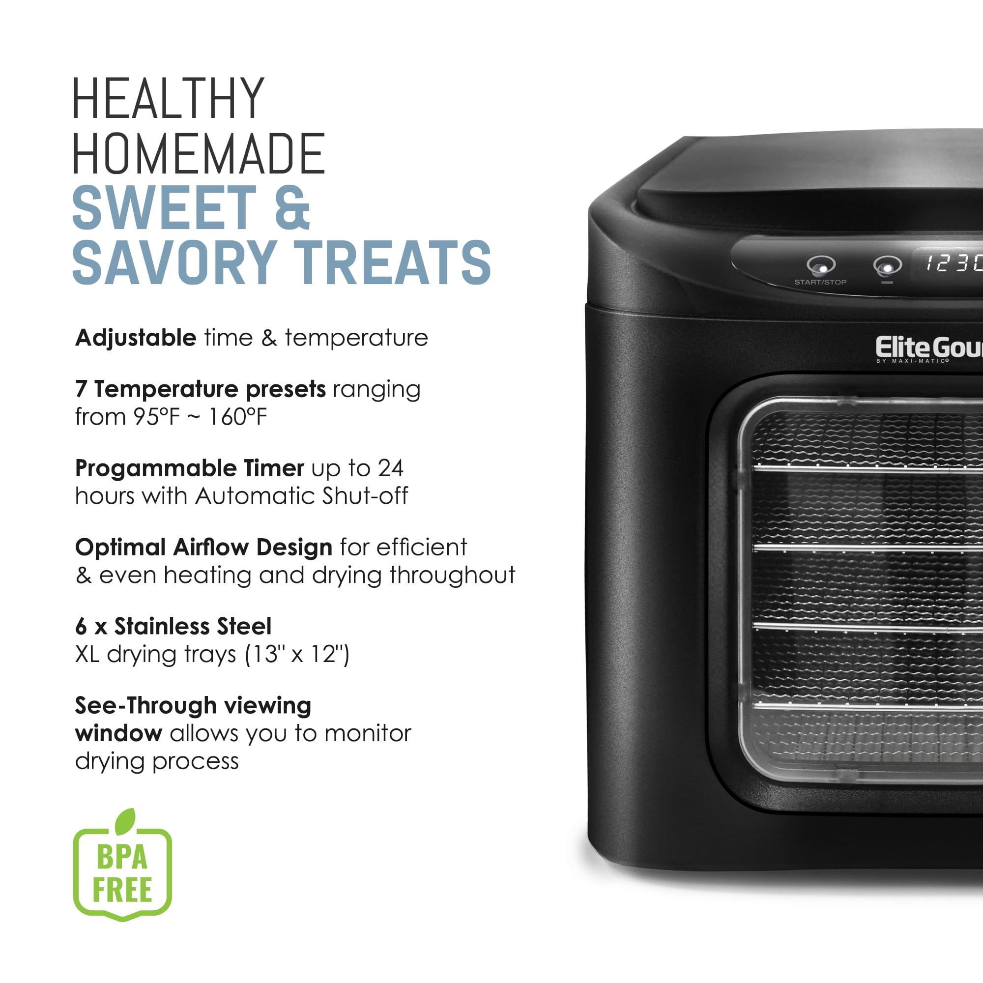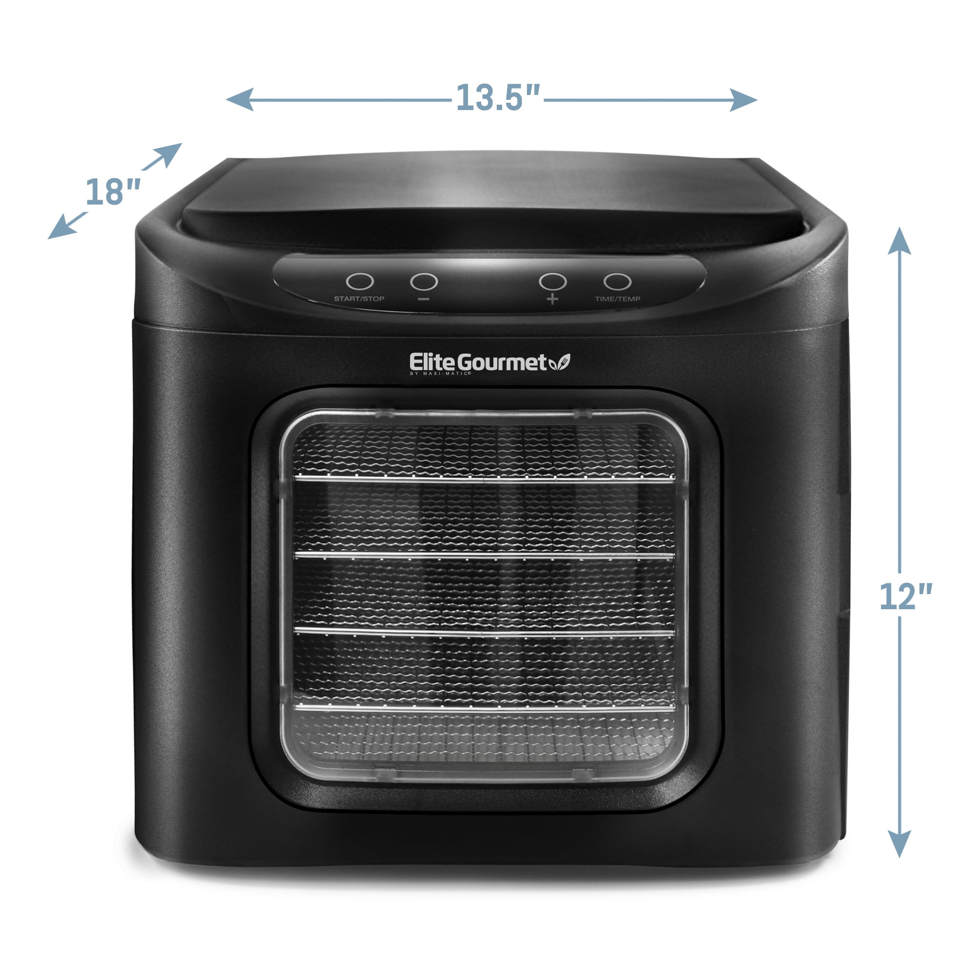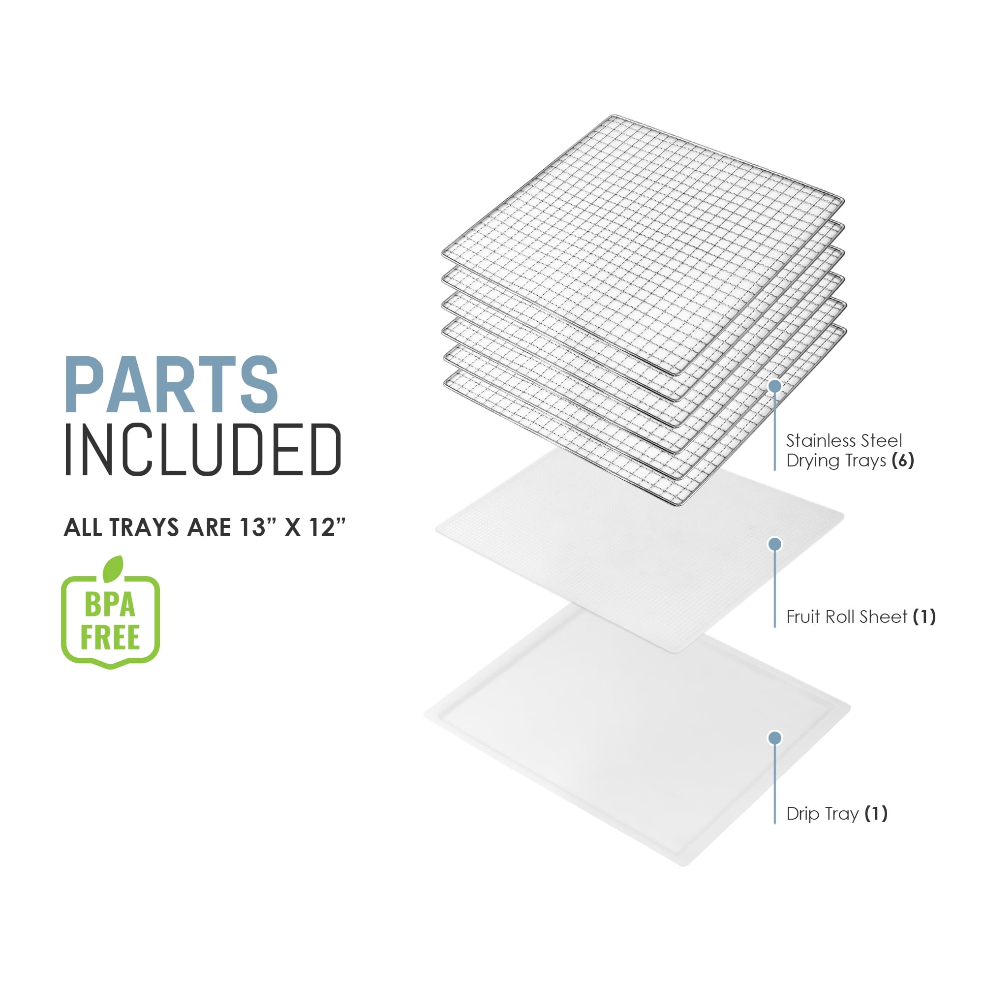 Six stainless steel mesh racks accommodate a wide variety of fruits, herbs, vegetables, meats, and more Adjustable timer up to 19.5 hours with automatic shutoff Stainless steel trays, fruit roll-up sheet Horizontal airflow distributes heat evenly and efficiently