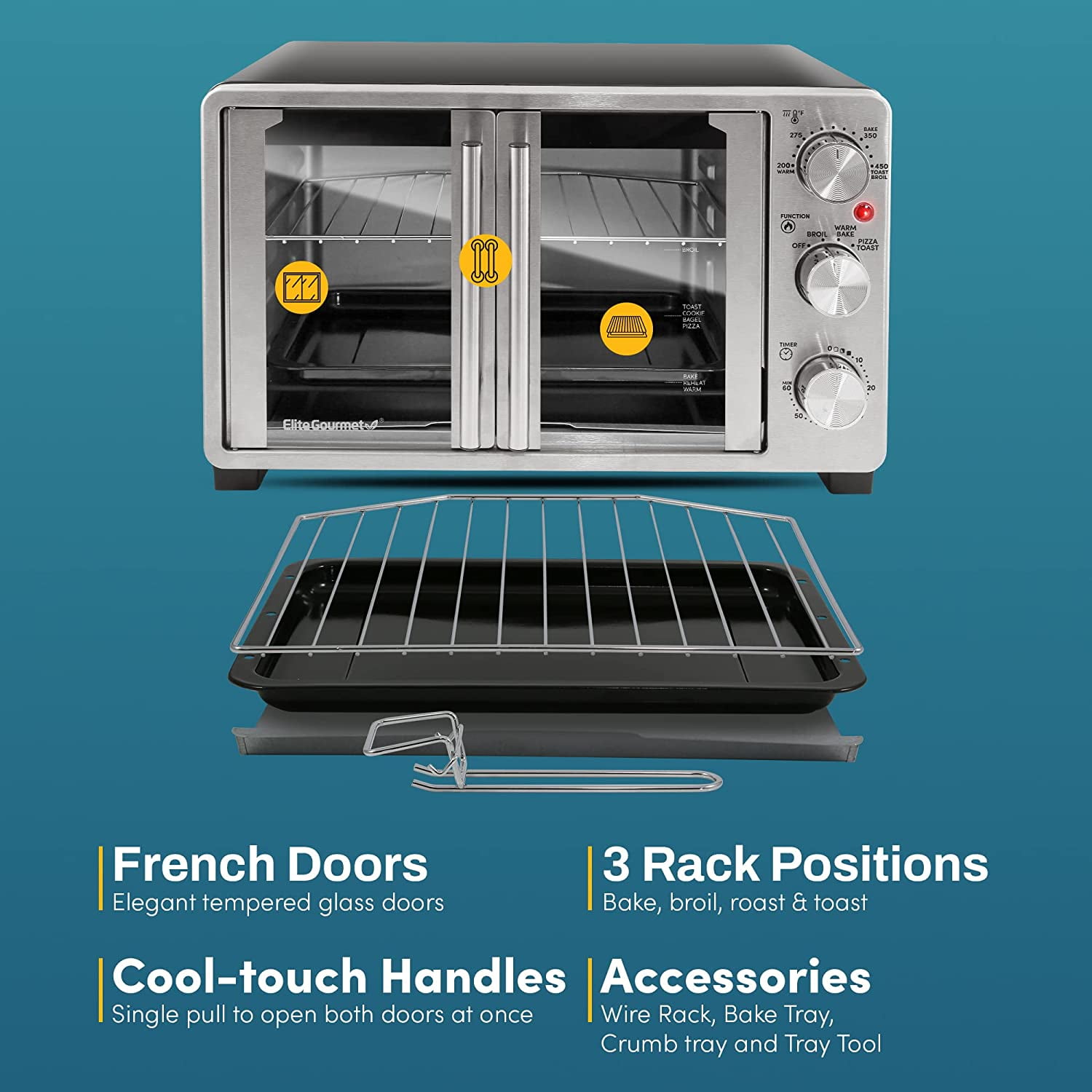 Introducing the Elite Gourmet ETO2530M New double French door 25l countertop oven. The perfect stand-in or supplement to conventional ovens. This dual door convection oven will have you forget about your traditional oven altogether. Toast, bake, broil, and roast your way to delicious, hearty meals and decadent desserts – this oven can do it all. The spacious interior boasts 3 rack positions so you can bake a 12inch pizza, warm dinner rolls, and broil a casserole all at Gourmet double door countertop oven. Includes French-style doors, 1 wire rack, 1 enamel bake tray, crumb tray and a tray removal handle. Removable parts are all dishwasher safe. Avoid heating up your kitchen with a big conventional oven, save time and use less energy with the Elite Gourmet double French door countertop oven, the perfect supplement for the holidays when your kitchen needs goes on double duty.
