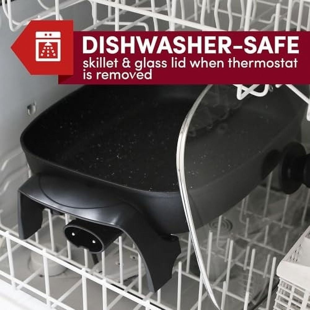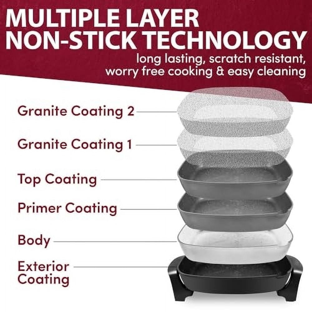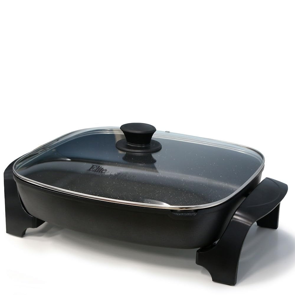 The Elite Platinum 16” x 13” Jumbo Electric Skillet sears, fries, grills, roasts, stews, and more making it easy to cook your favorite food in just one appliance. With its heavy duty non-stick stone finish, clean up is easy. The fully embedded M-Shaped heating elements are superior in heating faster and more evenly. Use it to cook anything from eggs and sausage to hamburgers and steaks, even sauté your favorite vegetables.