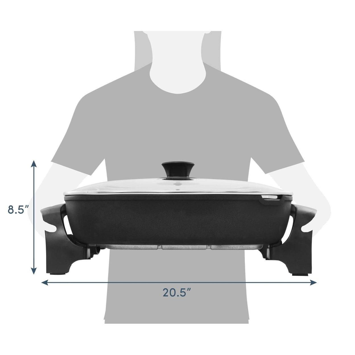 The Elite Platinum 16” x 13” Jumbo Electric Skillet sears, fries, grills, roasts, stews, and more making it easy to cook your favorite food in just one appliance. With its heavy duty non-stick stone finish, clean up is easy. The fully embedded M-Shaped heating elements are superior in heating faster and more evenly. Use it to cook anything from eggs and sausage to hamburgers and steaks, even sauté your favorite vegetables. Features a tempered glass lid and cool-touch handles for safe and easy serving…cook and serve directly out of the skillet! Designed for both style and function, the heavy durable cast aluminum base prevents any warping from high temperatures and the high side walls prevent food spillage. Using the Easy-Pour spout, you can easily pour contents out of the skillet for serving sauces or soups without having to use a ladle or spoon. 3.25″ extra deep pan with 8Qt. capacity provides ample room for preparing a range of dishes 16″ x 13″ cooking dimensions Tall, straight sides prevent splatters; heavy duty nonstick coating with stone finish releases food easily and cleans up quickly Unique Fully Embedded/Cast-in M-shaped heating elements for faster, even heating Easy-pour spout Tempered glass lid retains food moisture and flavors Extra large size, thick cast aluminum body Fully immersible dishwasher safe with probe removed Trigger release temperature control probe up to 400°F Cool touch knob & handles 1500watts