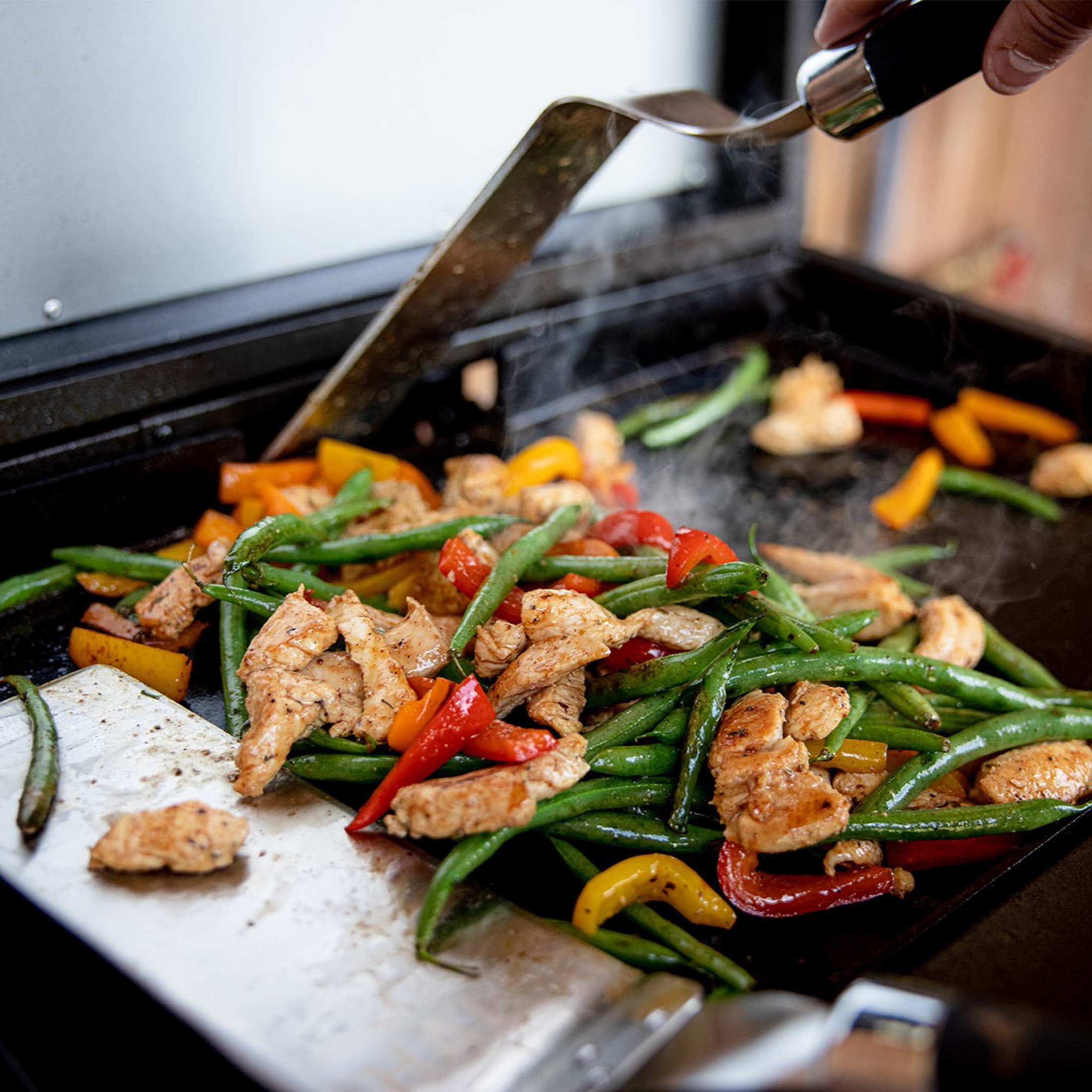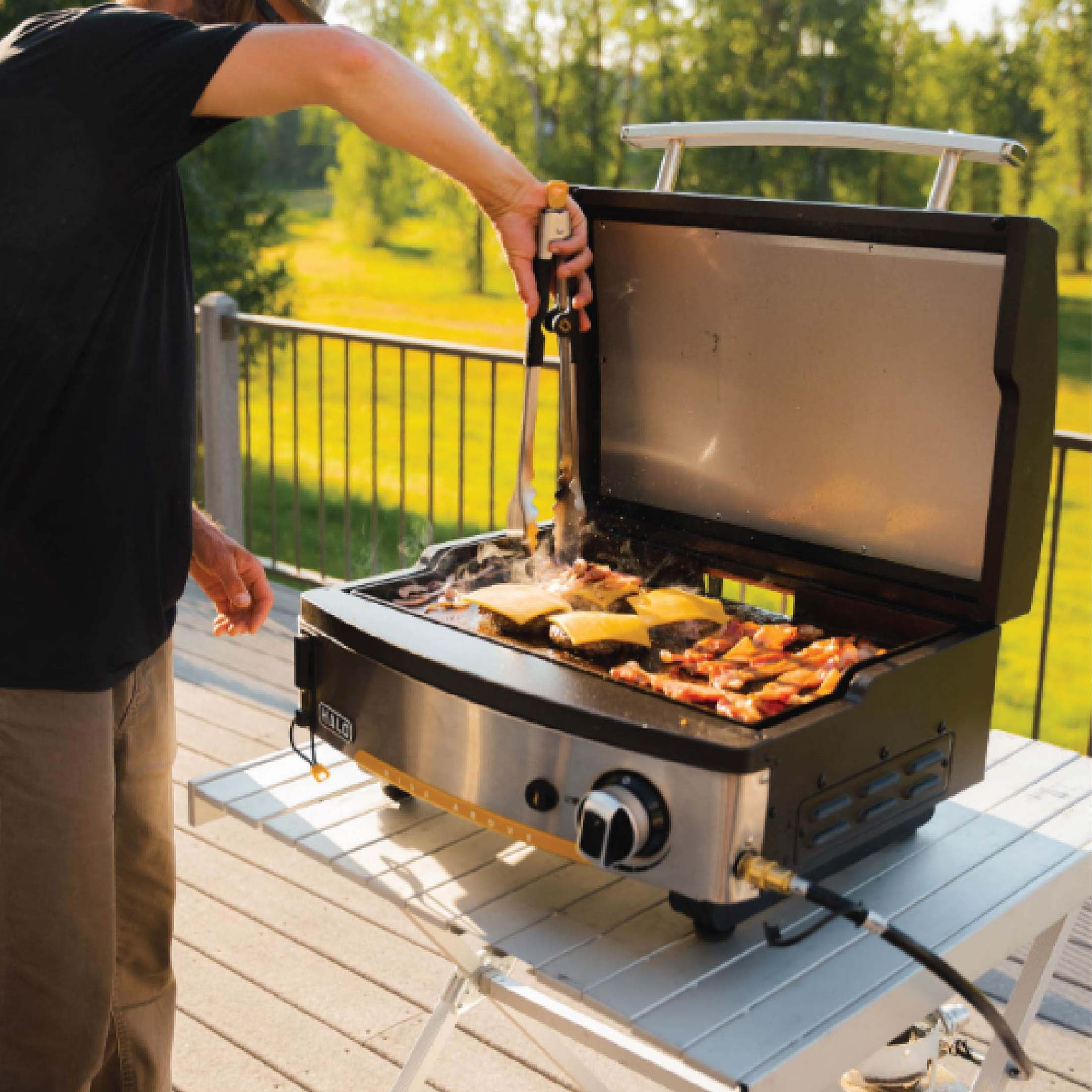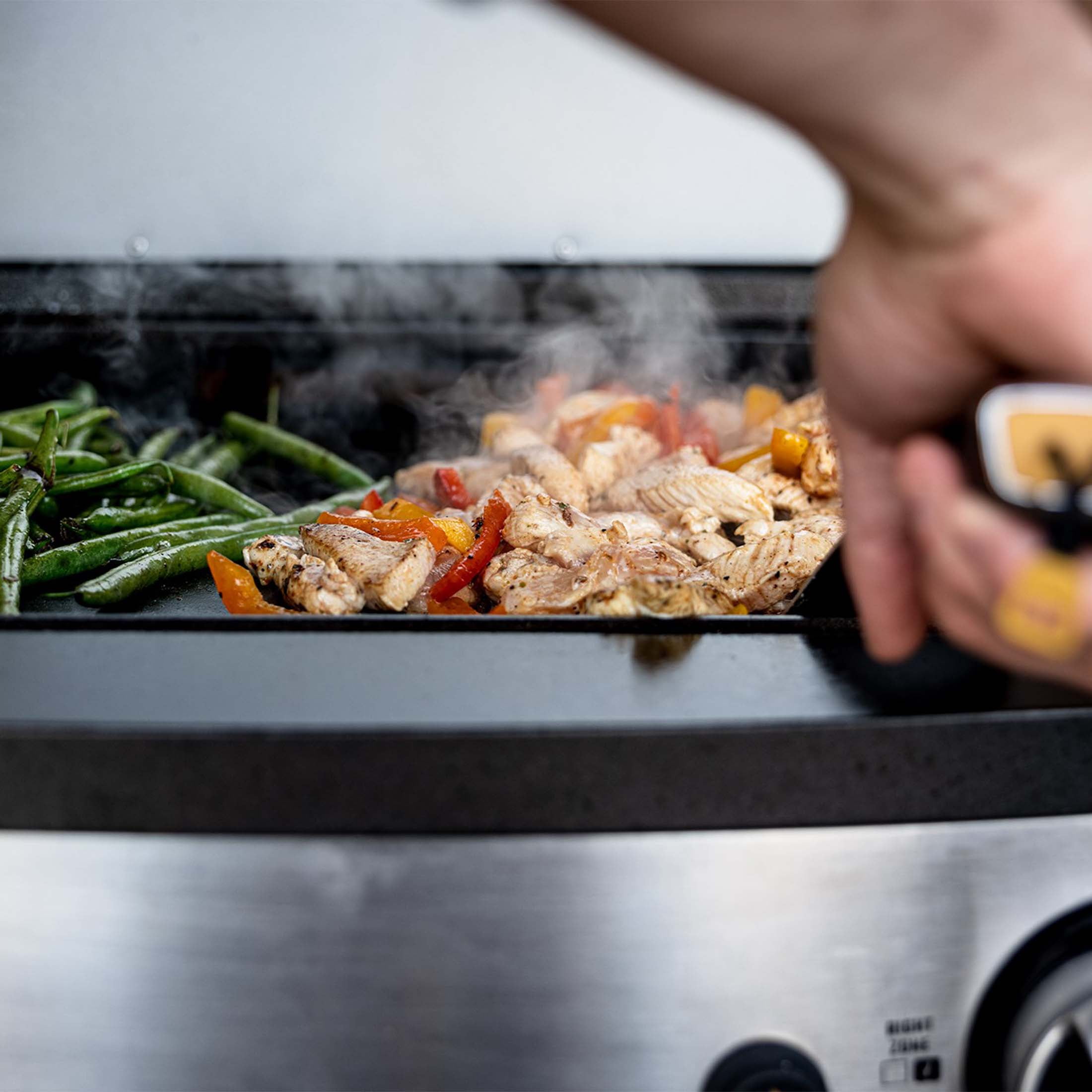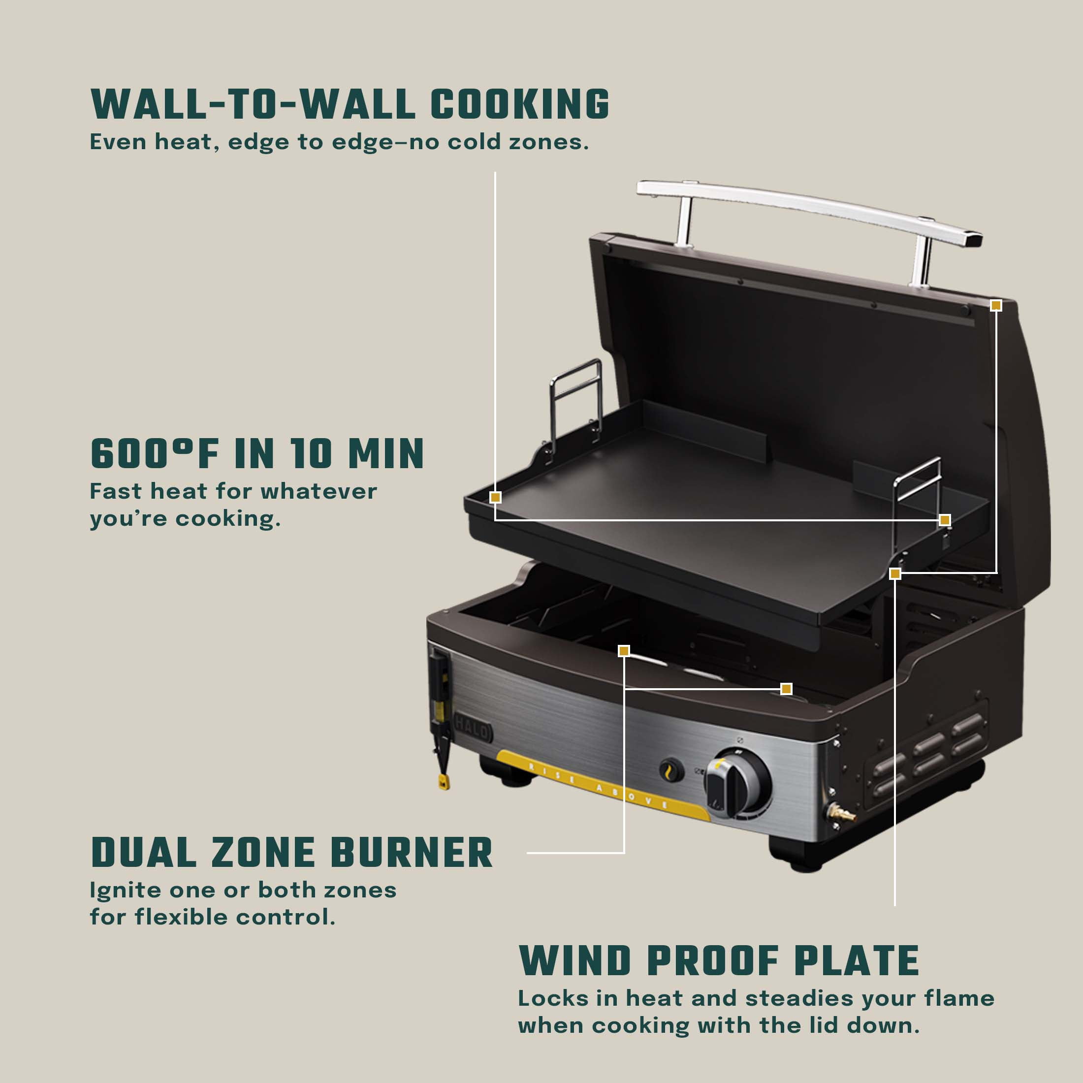 Patent-Pending Dual Zone Burner System Inset 284in² griddle plate for wind-proof wall-to-wall heat XL Rear Grease Management Patent Pending Squeegee Utensil Clean-Off Connect a 1lb or a 20lb propane tank Adjustable regulator of either 9.5″ or 11″ WC for more temperature control 300°F To 600°F Temperature Range 10 Minute Warm Up Time Natural Gas Compatible Shop NG Kit Durable Lid that can be closed while cooking