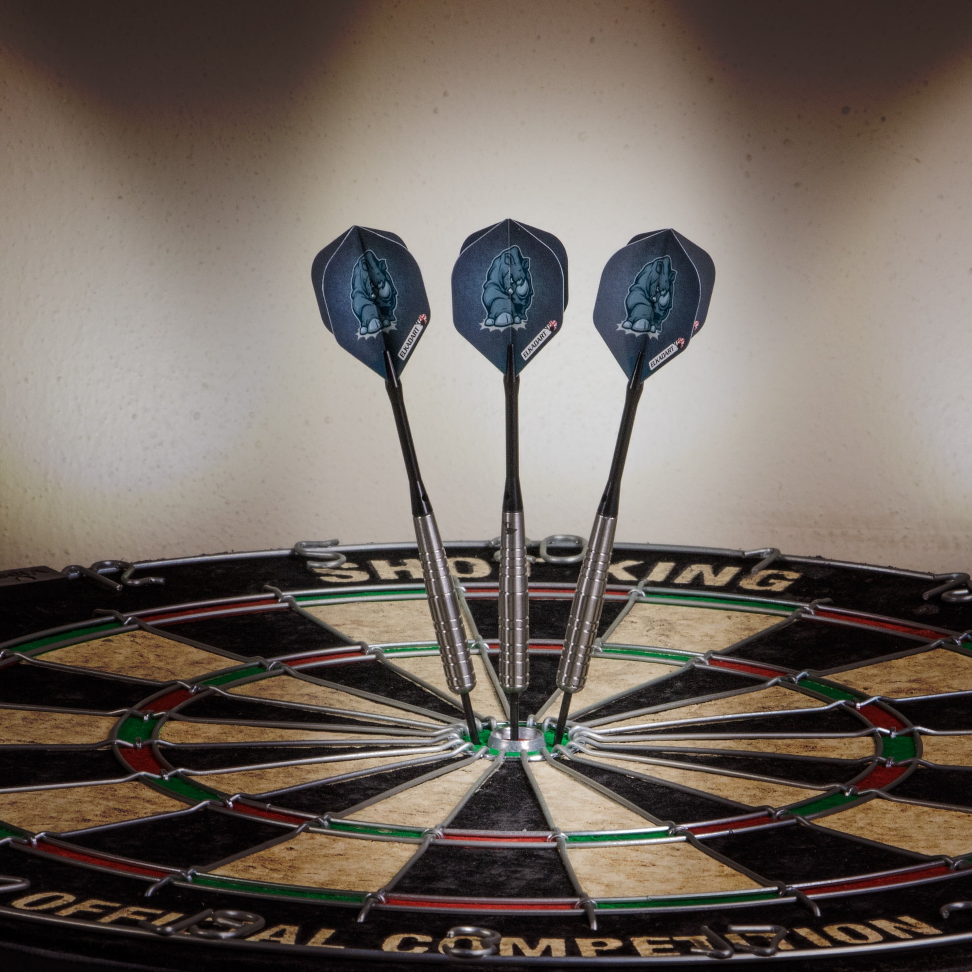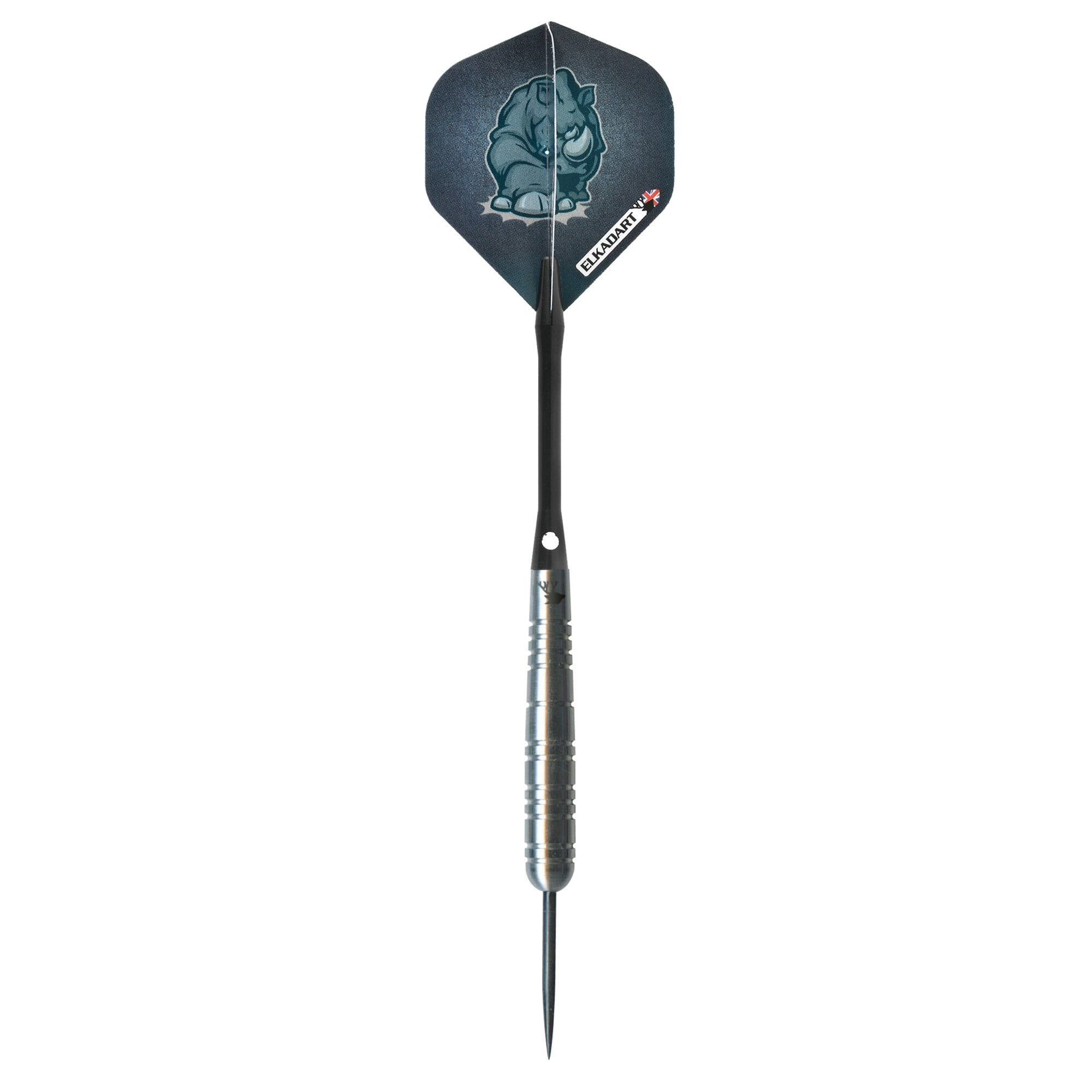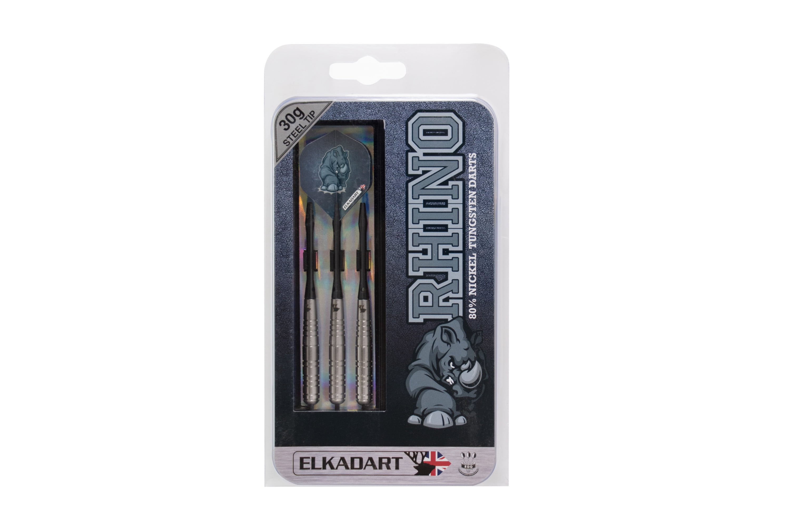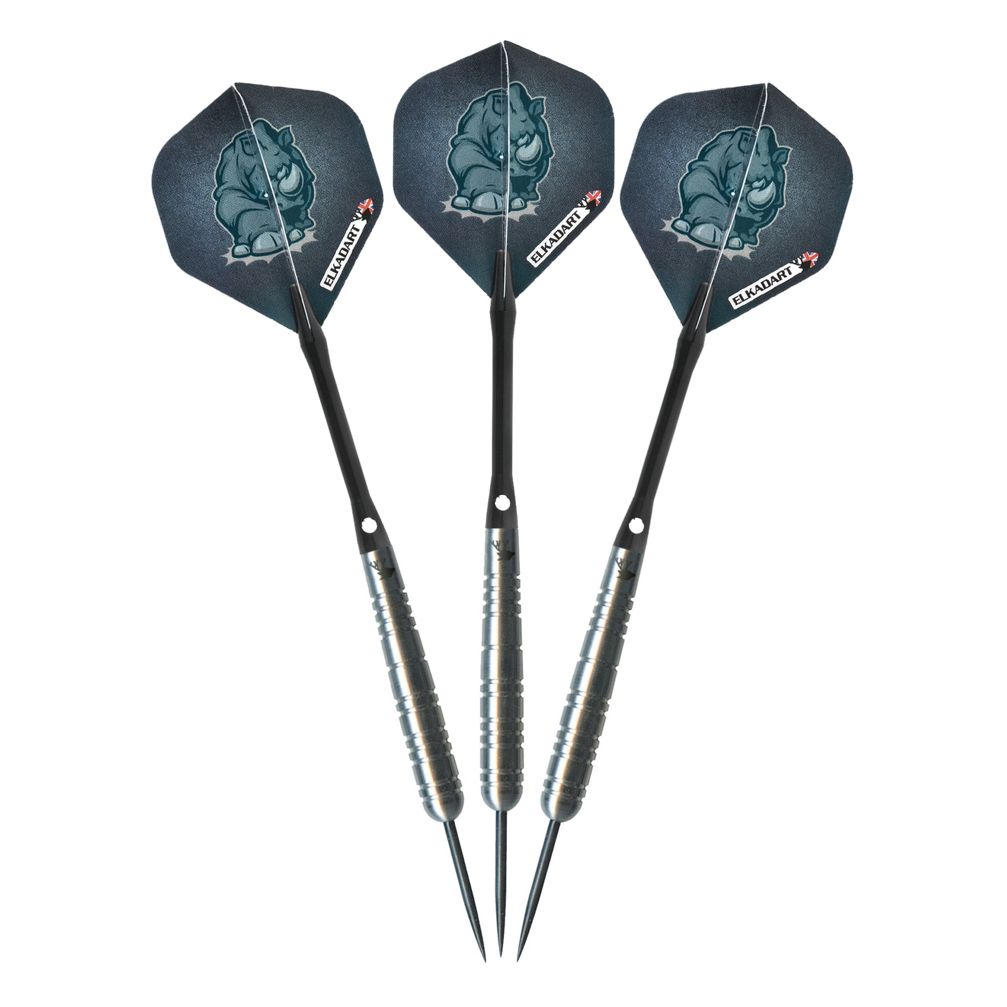 Charge ahead and trample over the competition when you bring the Elkadart Rhino Steel Tip Darts designed for use with sisal dart boards. These darts are packed with features starting with the barrel, fashioned from 80% Tungsten and 20% Nickel. Tungsten is a very dense metal, able to create slimmer darts with the same weight as lighter metals; this allows for tighter shot groupings without sacrificing control, increasing your scores. Tungsten is a sign of quality and durability as well because of its density. A higher tungsten content will produce a slimmer dart profile than one with less and 80% is among the highest you’ll find in dart set. More tungsten in the dart increases the price as tungsten is a rare metal and its density takes more effort to machine. The increased price gives a higher quality barrel and can improve performance, increasing scores. These darts are heavy duty, with extra weight across all barrel styles. Each barrel enjoys knurled bands and deep grooves, allowing your grip to remain consistent throw after throw. The Rhino Darts feature tough, Nylon Shafts that properly distribute the massive weight of these darts for optimal flight trajectory. Finally, each dart is finished off with intimidating Rhino graphics adorning each wide glide flight, for a menacing look. Each set includes three wide glide flights, and a slim dart case. Made in England.