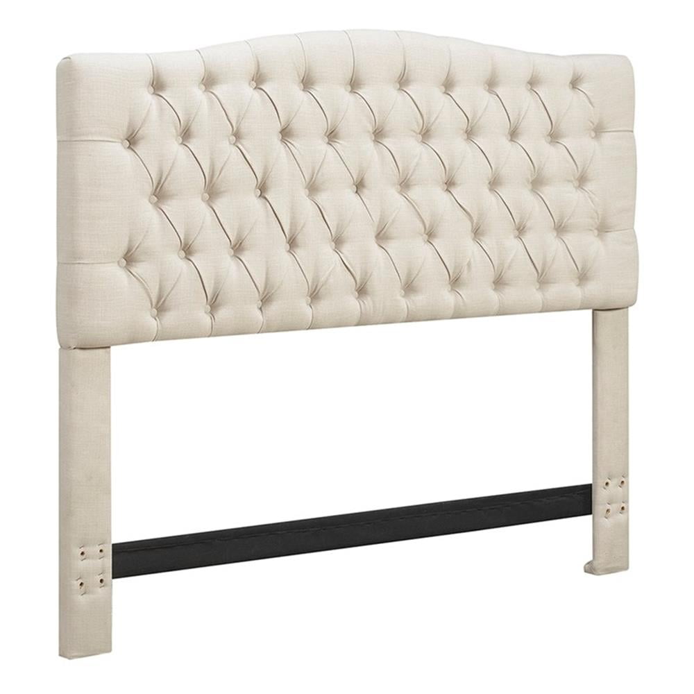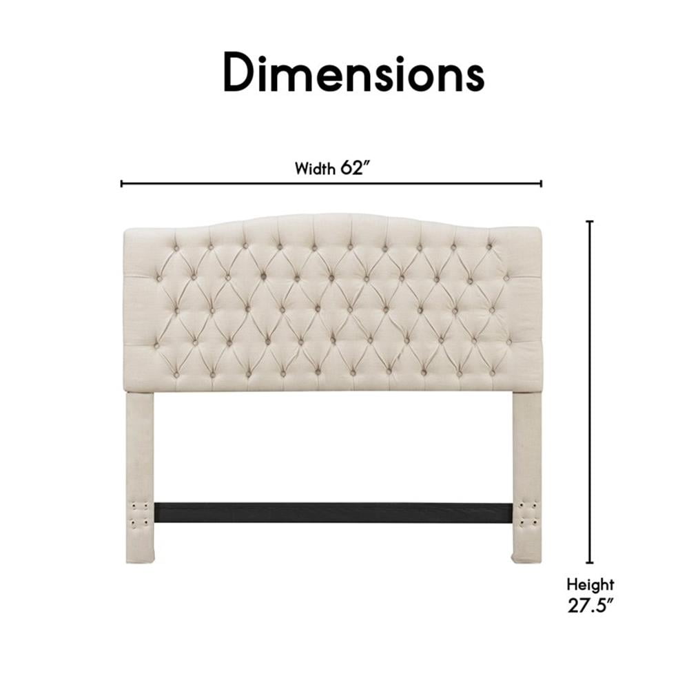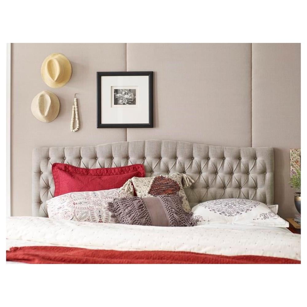 This plush tufted headboard anchors your bedroom in royal style. Designed with both classic and contemporary spaces in mind, the tufted headboard attaches easily to almost any king or queen size bed frame. Available in a variety of colors and fabrics, the unique design of the plush upholstery is every bit as comfortable as it is posh, and it brings a touch of Parisian glam to your bedroom. Pair your easy-chic new headboard with a set of vintage-inspired nightstands and a luxuriously upholstered bench to create the attractive and eclectic bedroom of your dreams. Constructed from sturdy wood and high-quality fabric, this fabric upholstered headboard features stylish button-tufted tailoring, a wide frame, and a subtle top curve for a luxe look. Features: Give your boring bedroom a luxe refresh with a tufted upholstered headboard that combines style with practical comfort. Button tufted stitching and soft coloring create sophisticated glamour that elevates your bedroom. The sturdy, hardwood frame and high-quality upholstery ensure durability over the long term. Soft, padded headboard provides a comfortable lounging spot when you want to watch TV or read a good book. Assemble your tufted headboard in minutes using the easy-to-follow instructions. Specifications: Product Weight: 36 lbs
