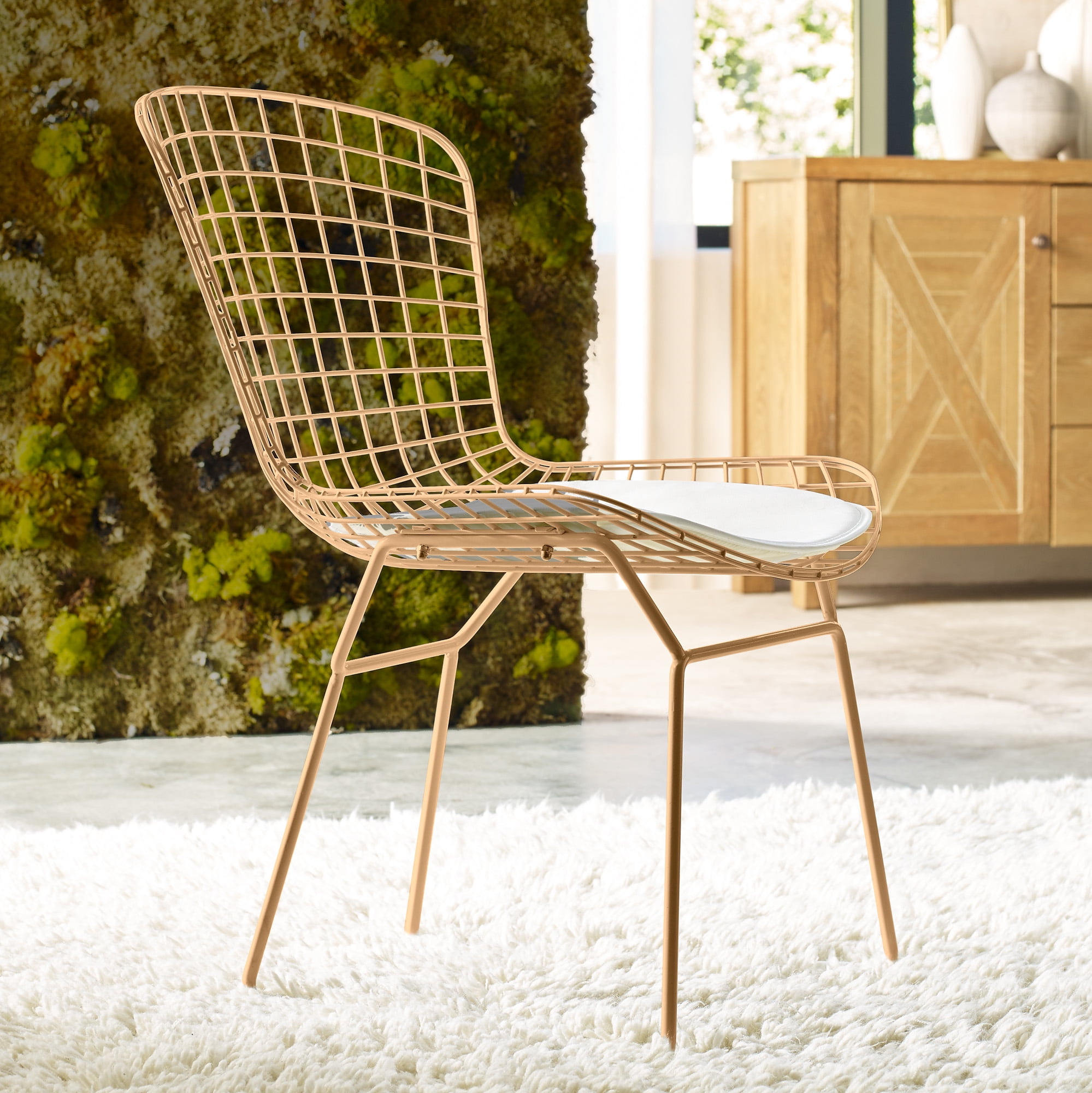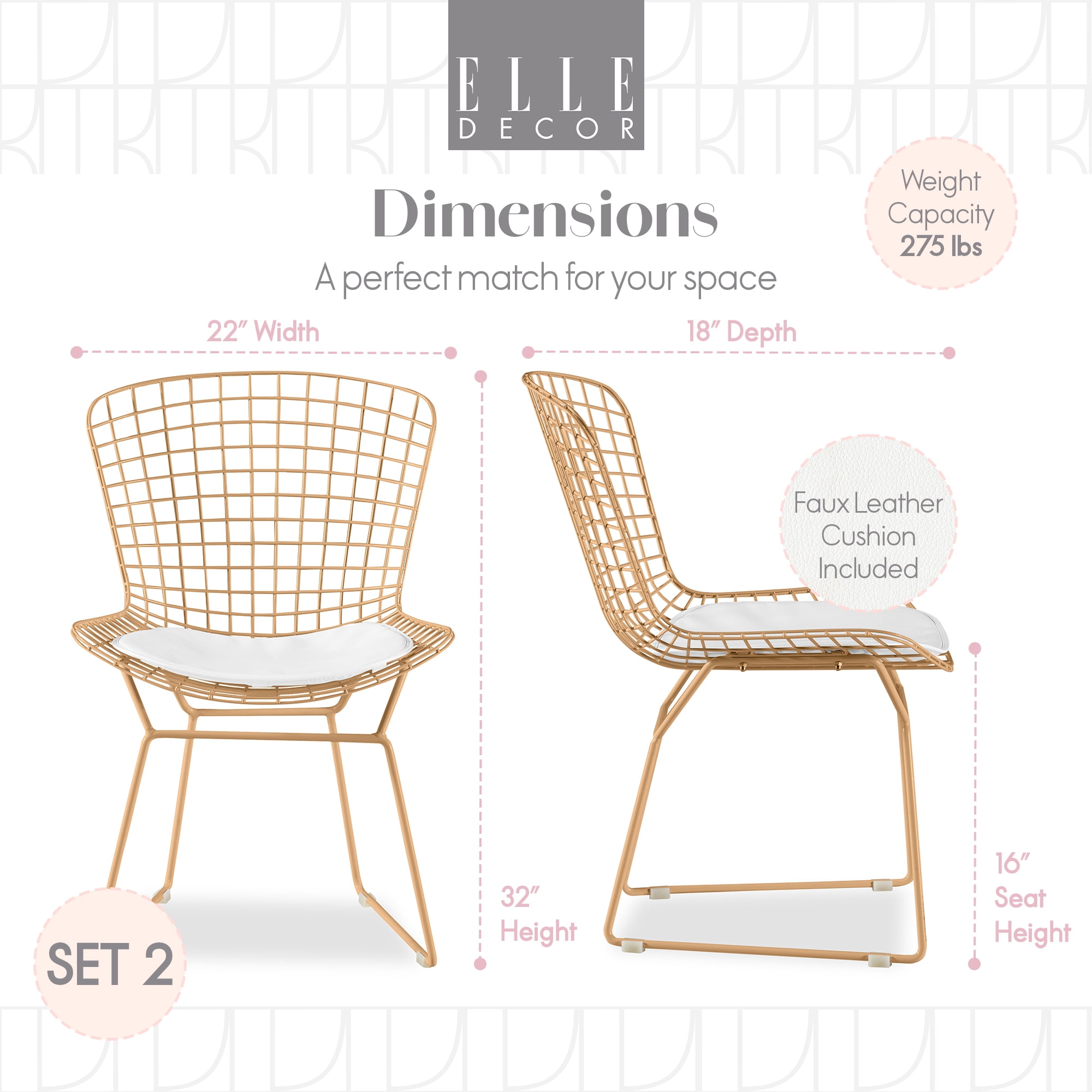The wire grid back of this midcentury chair is eye-catching and practical. A faux leather seat cushion balances the edgy metal. Sitting on this padded surface keeps you comfortable during long get-togethers while the faux leather material feels smooth against your skin. These metal dining chairs come in pairs, so they’re perfect for singles and couples. If you love entertaining or have a large family, get several pairs for your dining table. While these are sold as dining chairs, you can get creative with your placement to add a bold statement to any part of your home. The daring design makes it the ideal accent chair for your sitting room, home office or sunroom. Features: Classic midcentury design meets contemporary edge in this bold metal chair with a geometric grid back. Iron and steel construction is made tough to last. The lattice wire grid back creates a supportive surface for your comfort. Sturdy yet lightweight, this chair is easily portable when redecorating or multifunctional use. These chairs come in a set of two. Specifications: Weight Capacity: Weight Capacity: 220 lbs per chair
