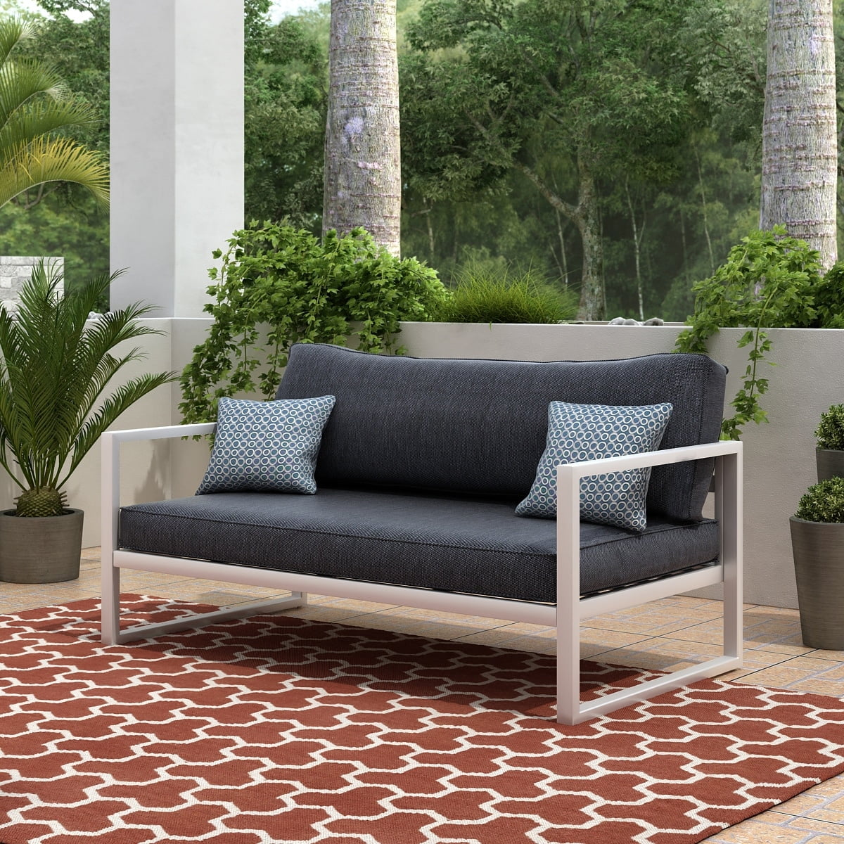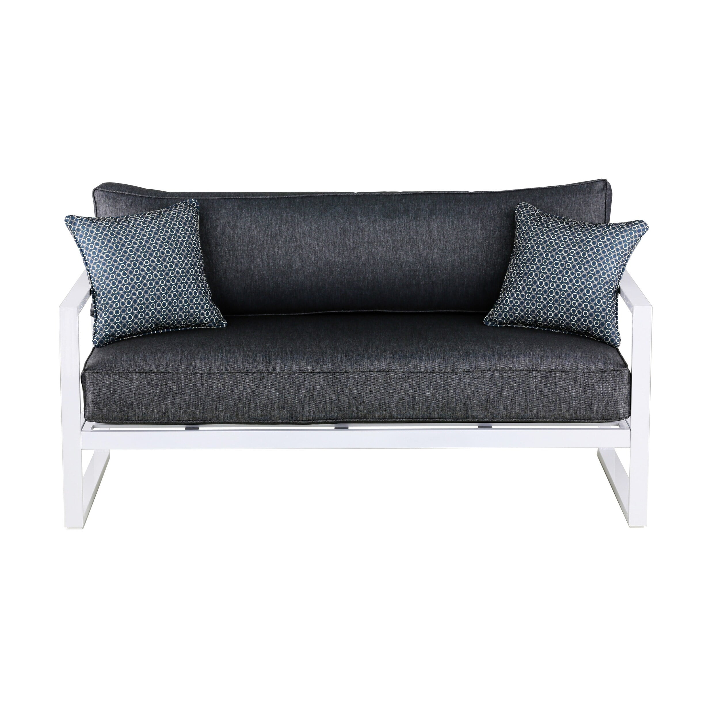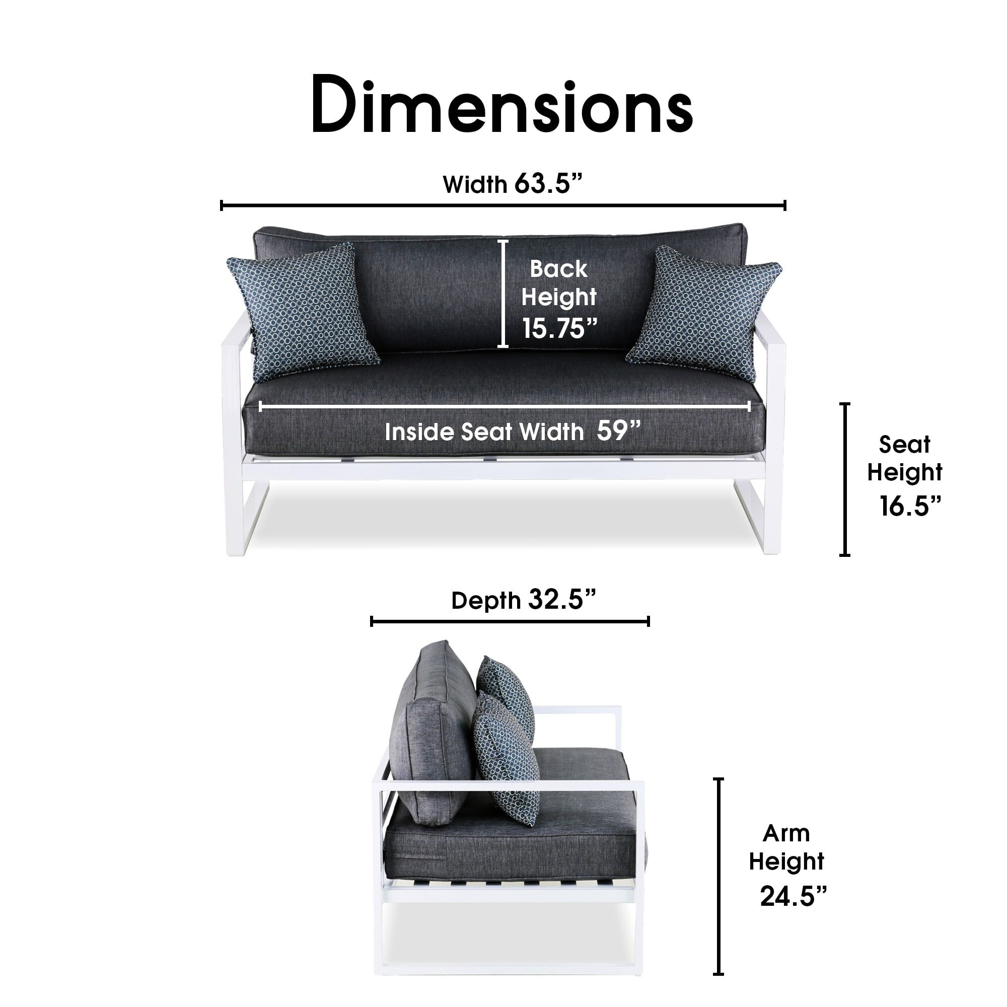 Don’t let your outdoor space go to waste. Add this simple and classic sofa to any patio set for an ideal escape in the great outdoors. The clean lines and classic design allow it to work easily with any style of decor. Sit with confidence as the metal outdoor sofa features a sturdy powder-coated metal frame that provides it with durability and stability. This outdoor modern sofa is designed for weather resistance with a rust-resistant frame and fade-resistant fabric. Clean the cushions with a simple wipe down. They are easy to maintain and quick drying. Relax in comfort on the high-density foam cushions and enjoy the supportive back that can allow guests to sit comfortably for hours whether they are enjoying the view or relaxing by the pool. Features : High-density foam in the seat and back cushion provides added support and comfort. Use outdoors in any weather. The sofa has fade-resistant material and a rust-resistant frame. The white powder-coated metal frame helps keep the sofa sturdy and able to withstand long-term use. The bench seat cushion is perfect to sit with guests or to stretch out and relax. Set up quickly and easily with a few simple tools. Specifications : Product Dimensions : 25″ H x 64″ W x 33″ D Product Weight : 50 lbs