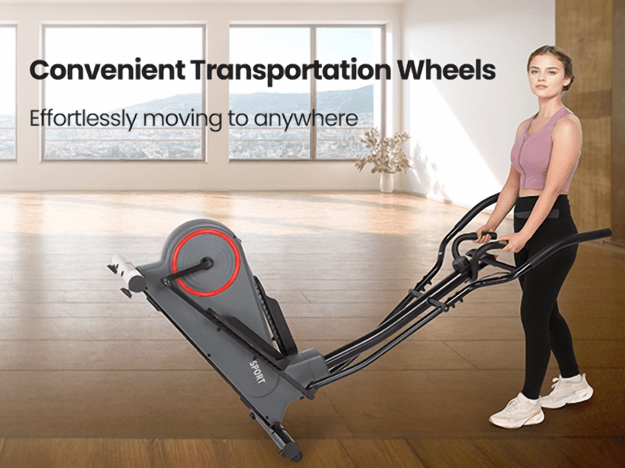Elliptical machine for home use with front flywheel magnetic resistance can help you exercise for your whole body and protect your joints, giving you a more quiet, smooth and sufficient workout experience. The elliptical machine with the water bottle holder allows you to rehydrate as you cycle. The LCD monitor tracks your exercise data, including time, speed, distance, calories burned and heart rate. Timely data feedback is beneficial to keep your motivation. The design of dual handles makes the exercise more diversified. The movable grip can drive the whole body exercise, the fixed grip can track the heart rate, as well as also carry on the anaerobic sprint training. When you want to watch videos or some programs, the elliptical machine with iPad holder can let you enjoy exercising and entertainment at the same time. The pulse grips sensor monitor the user’s heart rate. It is an effective tool to know whether your exercise is correct and sufficient. The sensor data will help you better understand your health and fitness status. Specification: Max User Weight: 264 lbs. Applicable Height: 4′ 11 – 6′ 3 in. Packing Dimension: 38 In. L x 25.8 in. H x 15 in. W Package Content: 1 x Elliptical machine with accessories