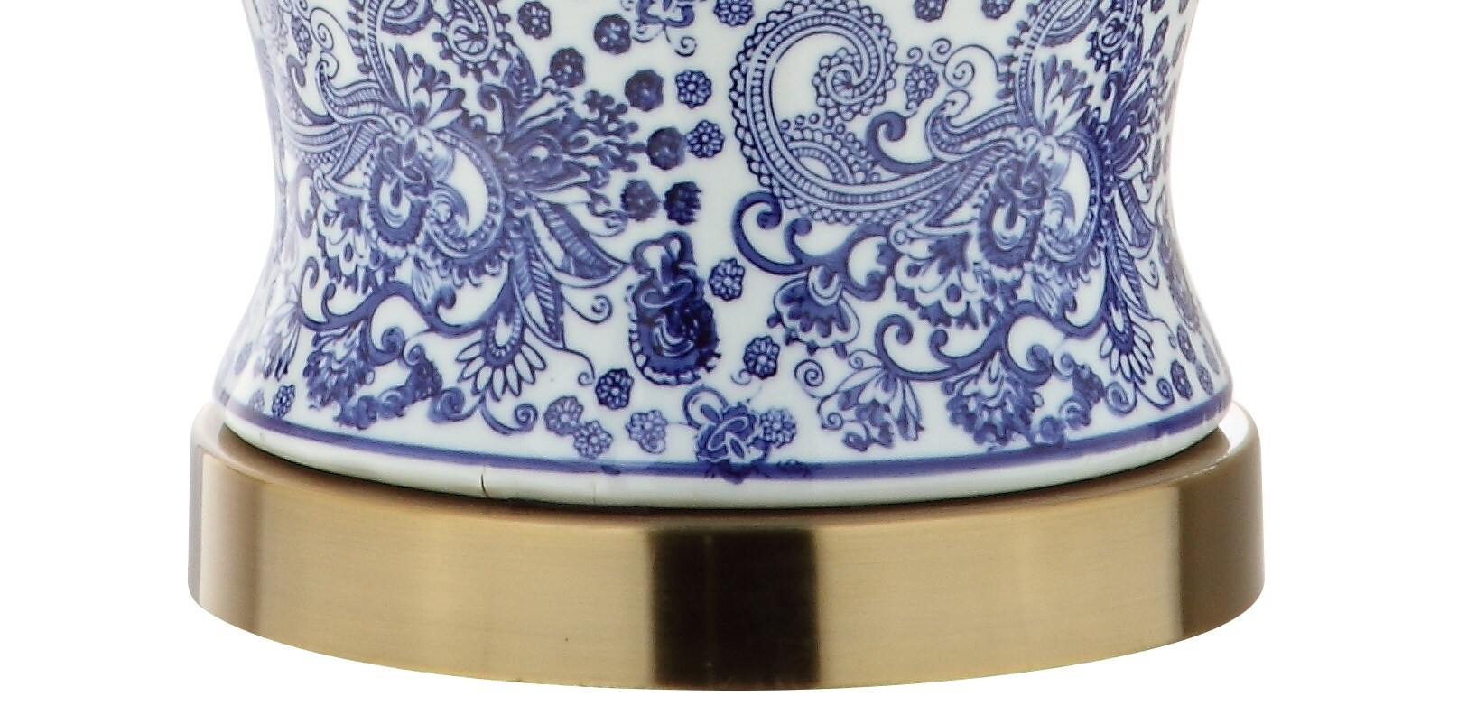 This ginger jar lamp is hand-painted and glazed with antiqued brass ornamentation. The linen hardback drum shade adds quiet grandeur to the traditional design. Finished with a brass finial on the top and a silk-wrapped cord in the back, it’s the perfect addition to your traditional space.
