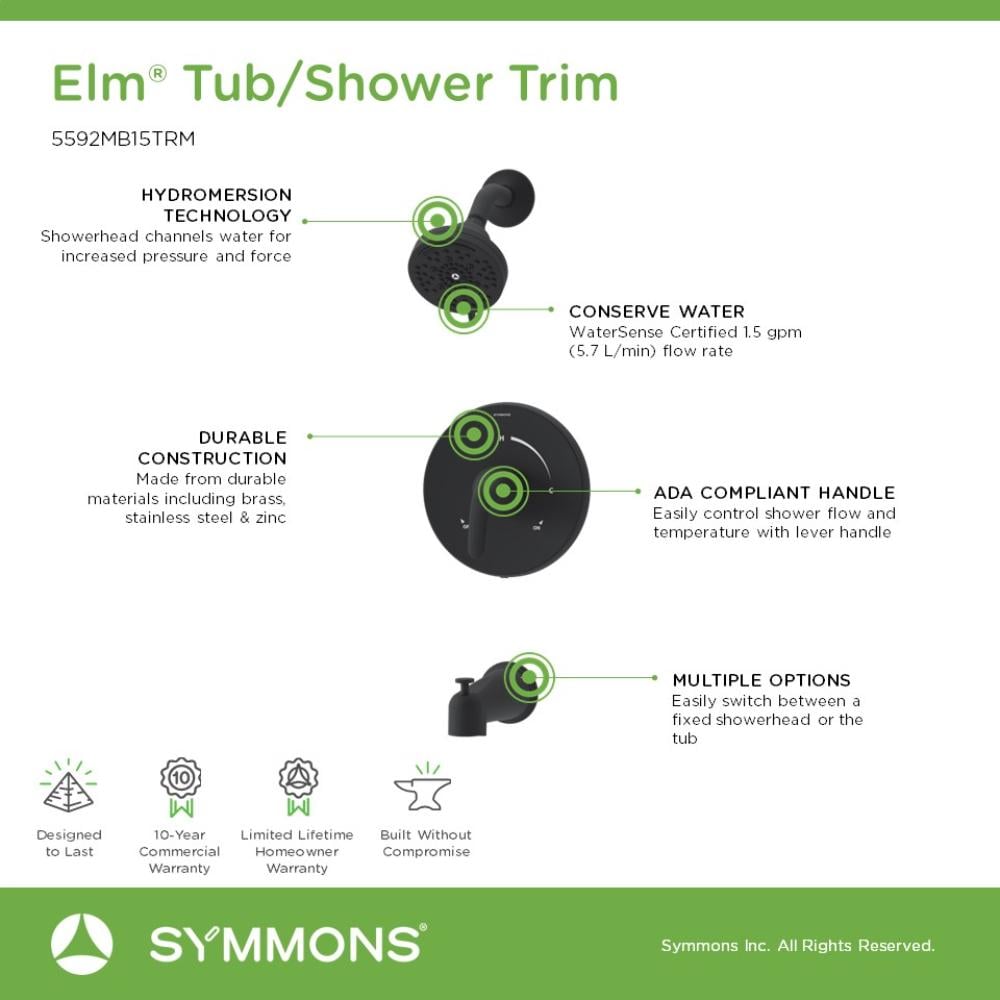 With many finishes to choose from, the Elm Collection from Symmons is a natural fit with most bathroom interiors. Constructed of high quality materials and plated in an abrasion resistant finish over solid metal, this tub and shower trim kit from the Elm suite will last a lifetime. This kit includes a shower arm, low flow showerhead, diverter tub spout, brass escutcheon and shower lever handle. With an ADA compliant adjustable lever handle design, the solid brass valve cover plate features hot and cold indicators to ensure custom water temperature setting and ease of use. This tub and shower trim kit features a 4 inch multifunction showerhead with HydroMersion technology, which channels water for increased pressure and force. The showerhead offers various modes, including full, massage, waterfall, spa, and pause. The showerhead is WaterSense certified and runs at an eco friendly low flow rate of 1.5 GPM, allowing you to conserve water and save money on your water bill, without affecting the shower’s performance. This kit is backed by the Symmons Lifetime Limited Warranty and its technical support team. It includes everything needed for installation, meaning you can update your bathroom without replacing your valve.
