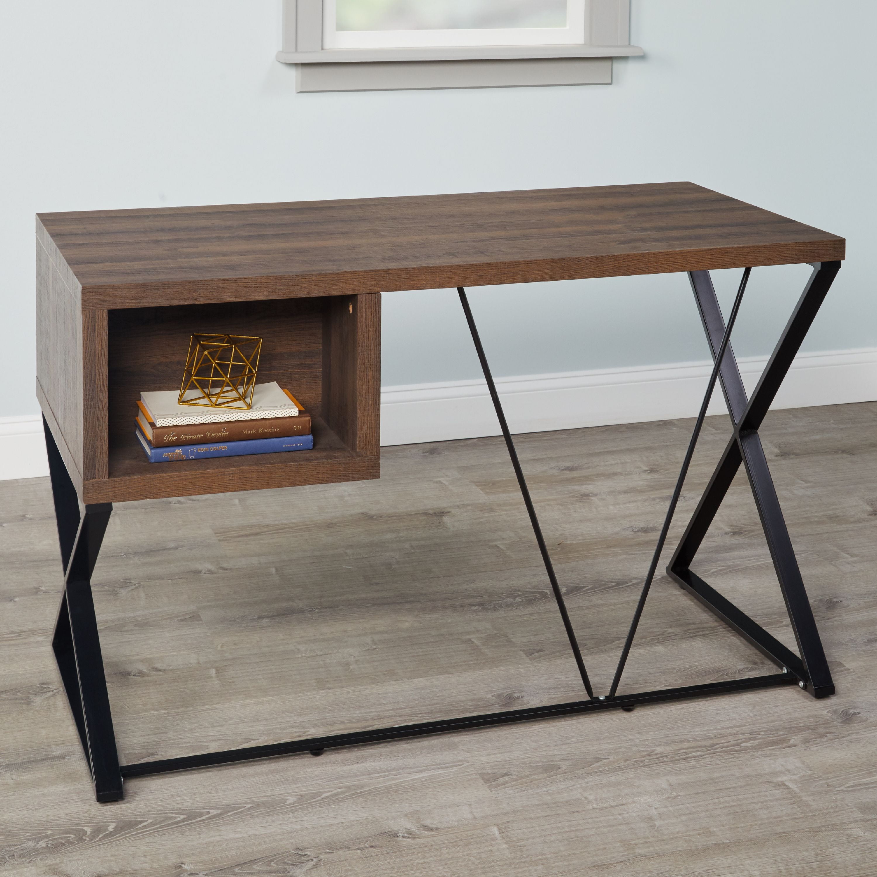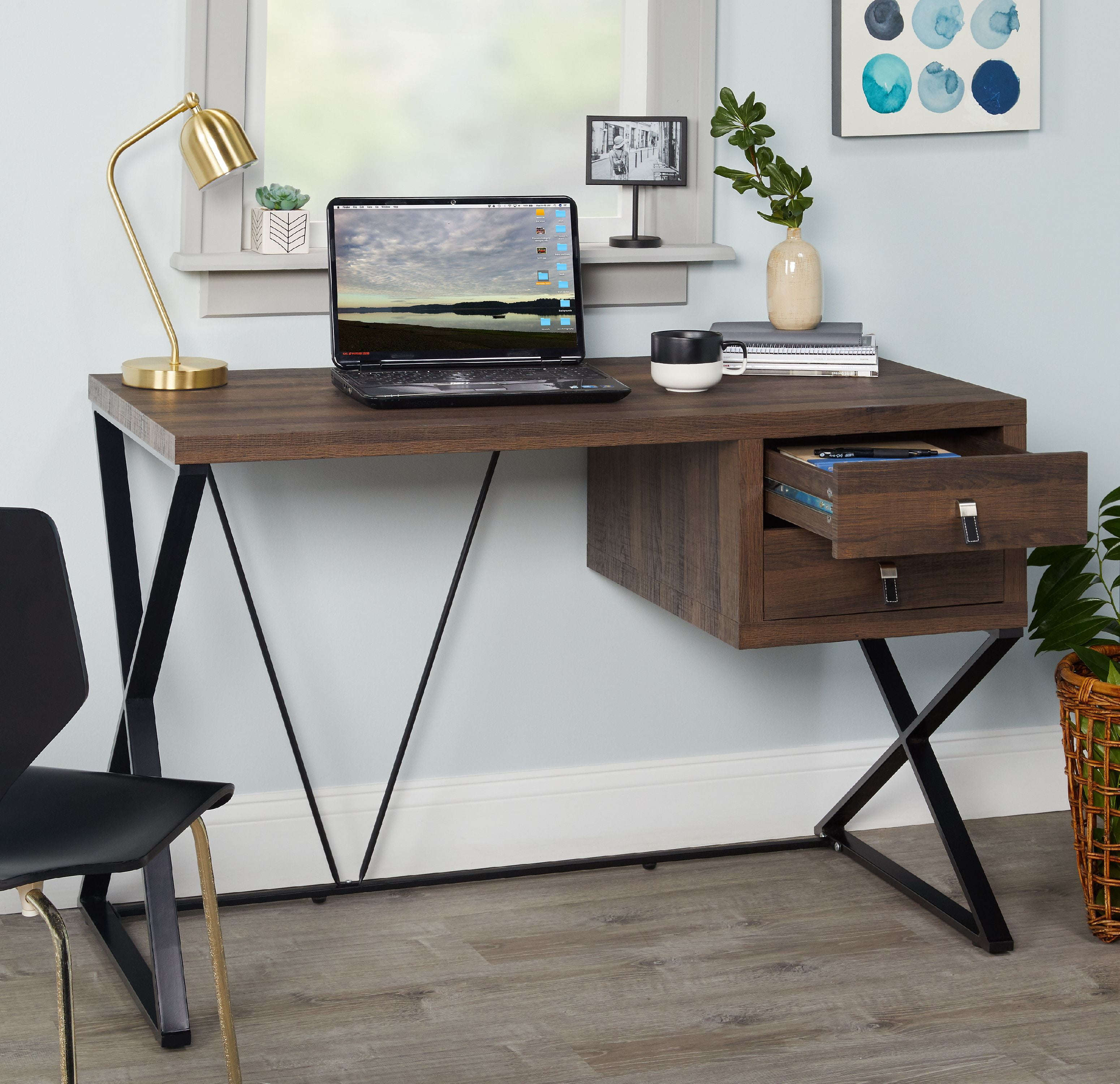 Add a pop of modern style to your workspace with this Desk. This desk features a sleek design making it easy to use in almost any room, while still providing plenty of space to work. Two drawers allow space for storing away notebooks, pens and other items in your work space. Metal “X” shaped legs provide a sturdy build and a stylish appearance. Tabletop comes in two finish -Natural and Brown, making it compatible with almost any interior.