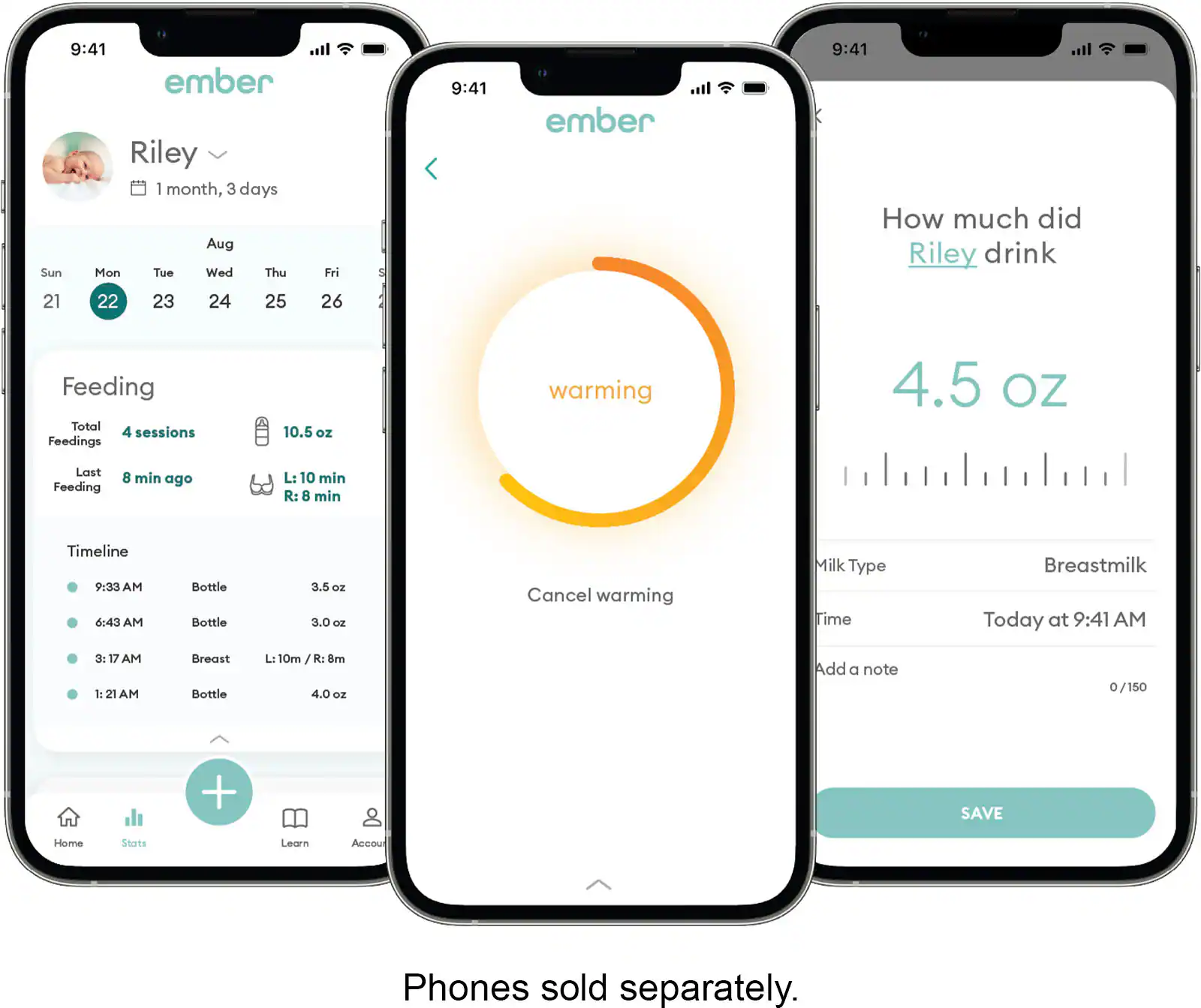 The Ember Baby Bottle System warms milk or formula with the touch of a button and keeps it cool until you need it. Finally, feedings only require two things: a bottle and milk. With both convenience and precision at the heart of what we do, the Ember Baby Bottle System ensures safe and even warming using convection current technology and our triple-check safety features. Multiple sensors detect temperature and liquid levels, so every Bottle is warmed precisely and at just the right heat to preserve nutrients while eliminating hotspots. With the Ember Baby Bottle System, each feeding is warmed perfectly for anyone, anywhere – every time. Either tap the Smart Warming Puck or use the Ember Baby app to start a warming cycle remotely from another room, then track each feeding, log weight, and time spent breastfeeding, so you’re always on track. You can even get the latest information on feeding, health, and sleep all at your fingertips in the Learn Center of the app.