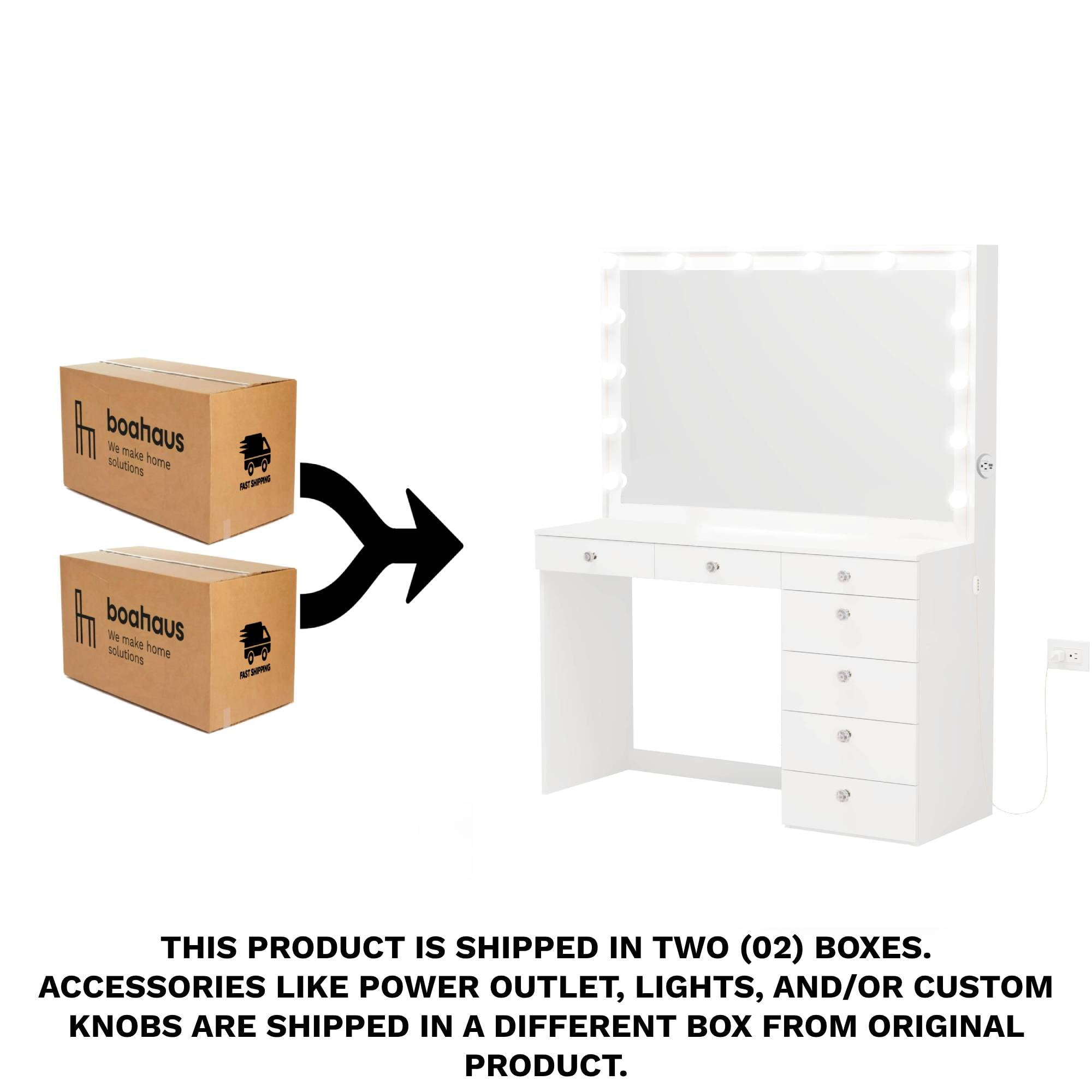Transform your beauty routine with the Ember Interiors Caris Modern White Vanity Table, a premium centerpiece for your bedroom. Featuring a set of 14 Hollywood-style light bulbs as an add-on, this vanity provides customizable and professional lighting for flawless makeup application, perfect for your Get Ready With Me moments. This elegant vanity offers a built-in charging station with USB Type-C, USB Type-A, and power outlet, making it convenient to charge your devices while you prepare. Designed with seven spacious drawers adorned with crystal knobs, it provides ample storage for makeup, skincare, and accessories, ensuring a clutter-free setup. Measuring 58.2” H x 47.2” W x 17.7” D, its sleek white finish adds a modern, sophisticated touch to any decor. Crafted from high-quality materials, the Caris Vanity combines durability and style, creating a functional yet aspirational space to elevate your beauty experience. With its luxurious features and thoughtful design, this vanity desk is the ultimate blend of practicality and glamour.
