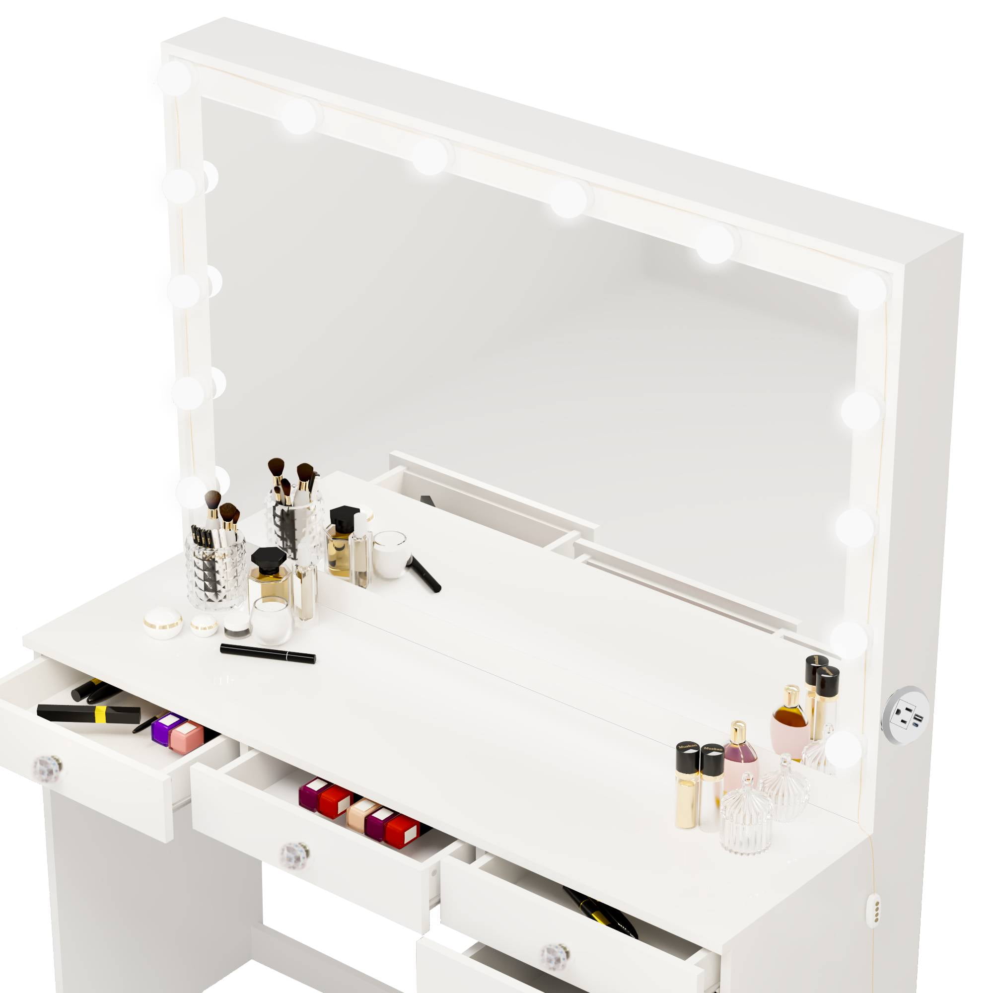 Ember Interiors Caris White Makeup Vanity Desk with Add-On Lights, Charging Station, and Mirror, for Adults