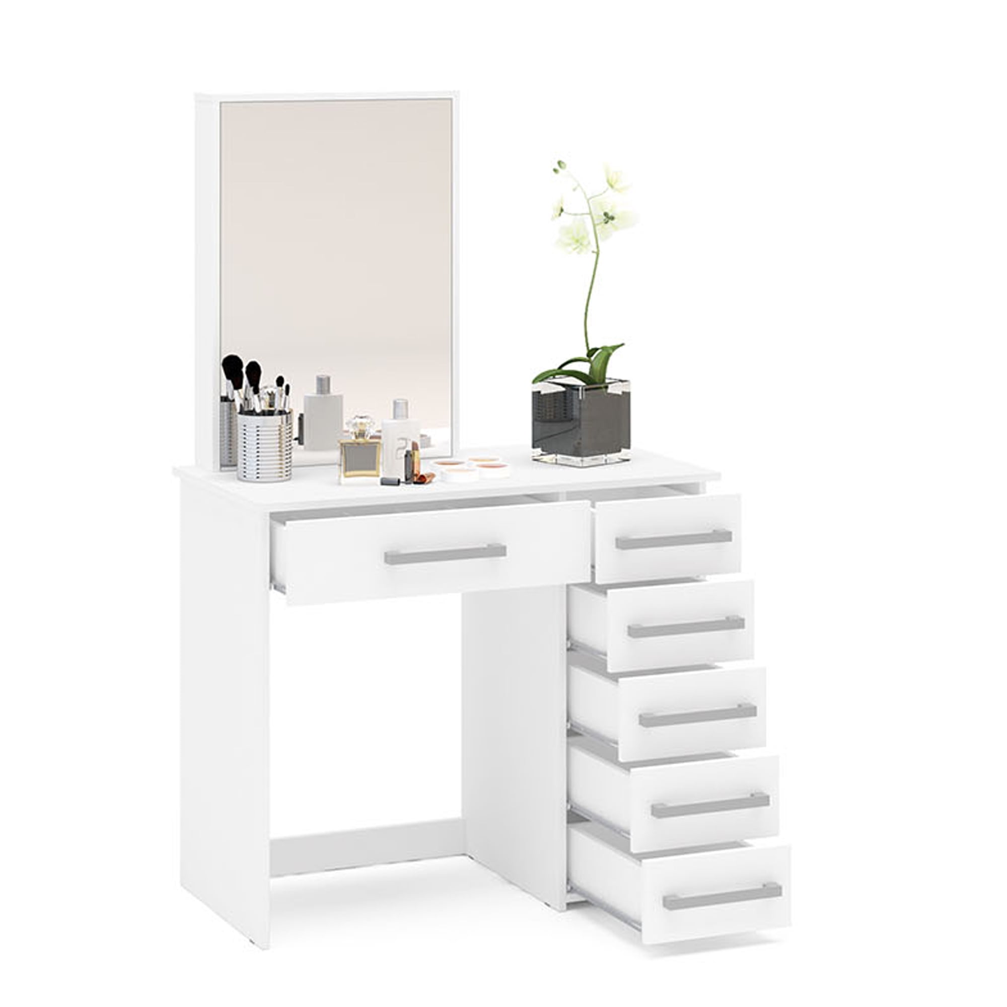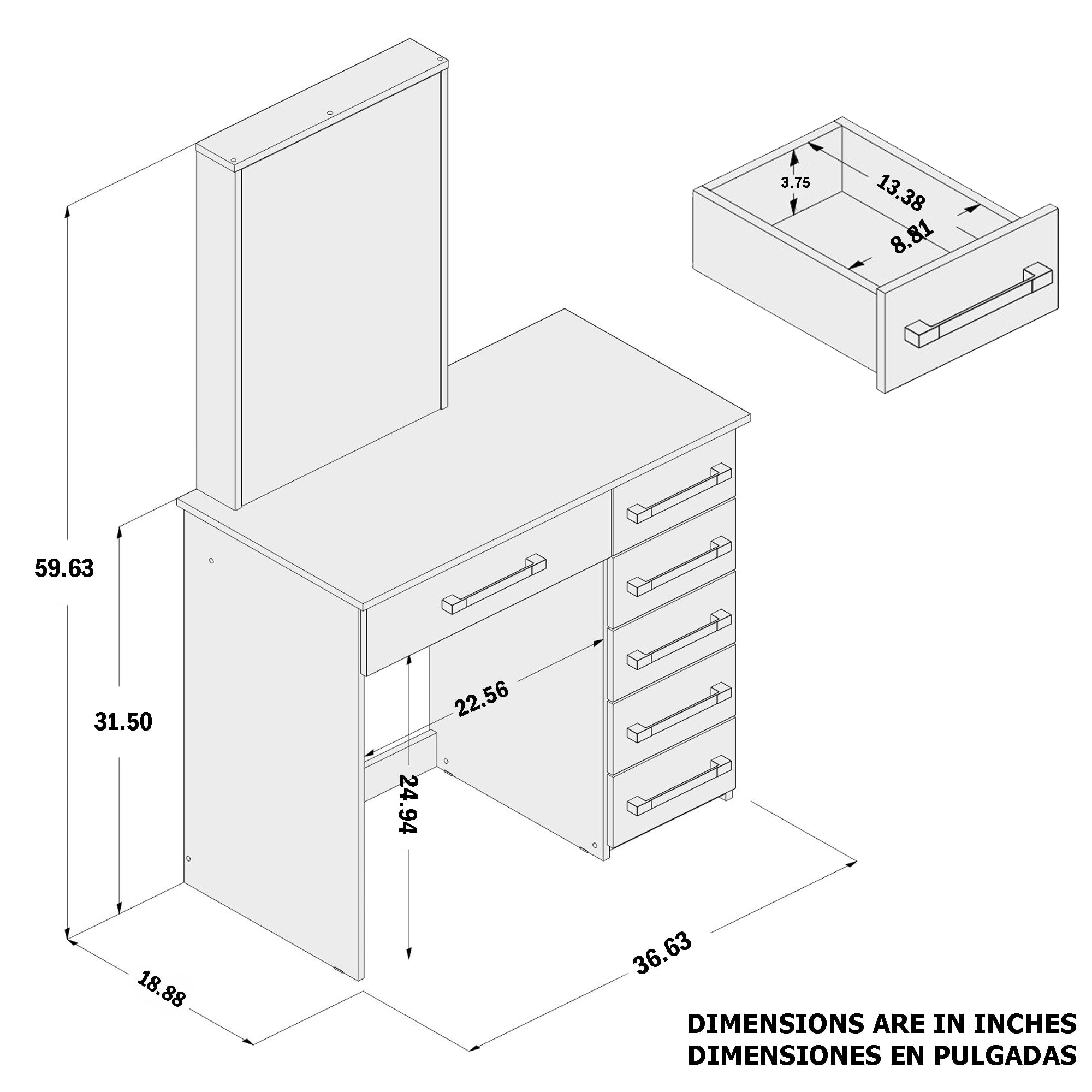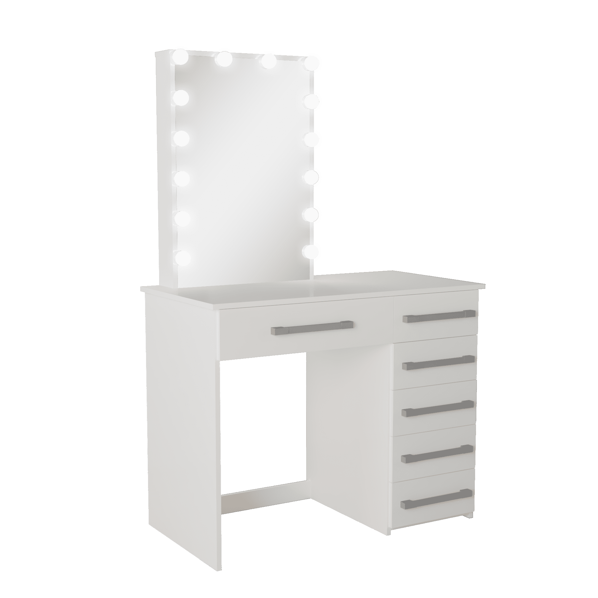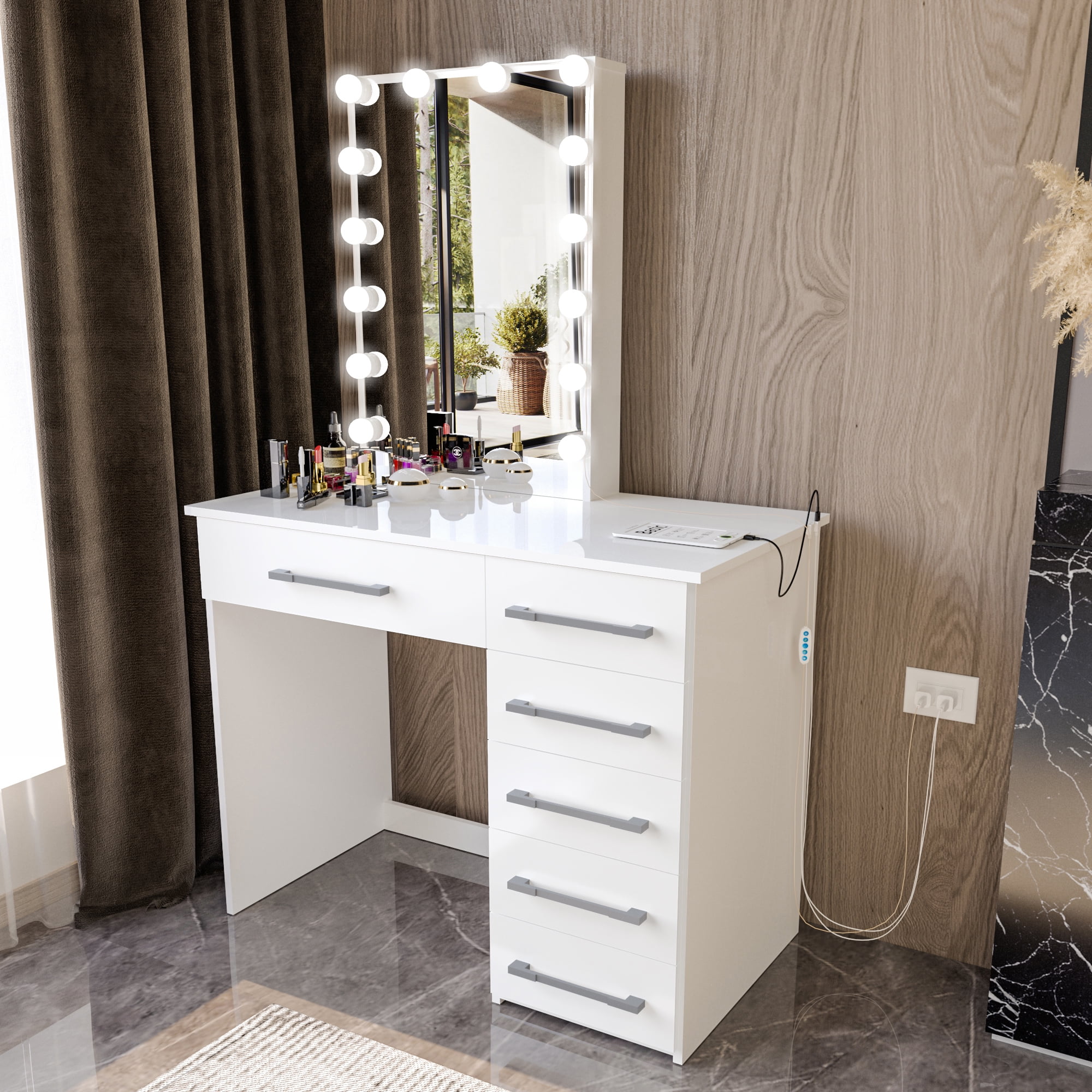 Vanity Desk Dimensions: Measures 59.63″ H x 36.63″ W x 18.88″ D, providing a spacious surface for makeup, accessories, and essentials. Lighted Mirror with Bulbs: Mirror surrounded by bright bulbs for perfect makeup lighting. 6 Drawers with Stylish Handles: Six roomy drawers offer ample storage space, helping you keep makeup, skincare, and accessories neatly organized. USB Port for Device Charging: Convenient USB port allows you to keep your phone, tablet, or other devices charged as you get ready. Modern White Finish: The sleek white painted finish complements various bedroom decor styles, adding a touch of elegance. “Become your own makeup artist. Make this incredible vanity yours today and take your beauty to the next level!”