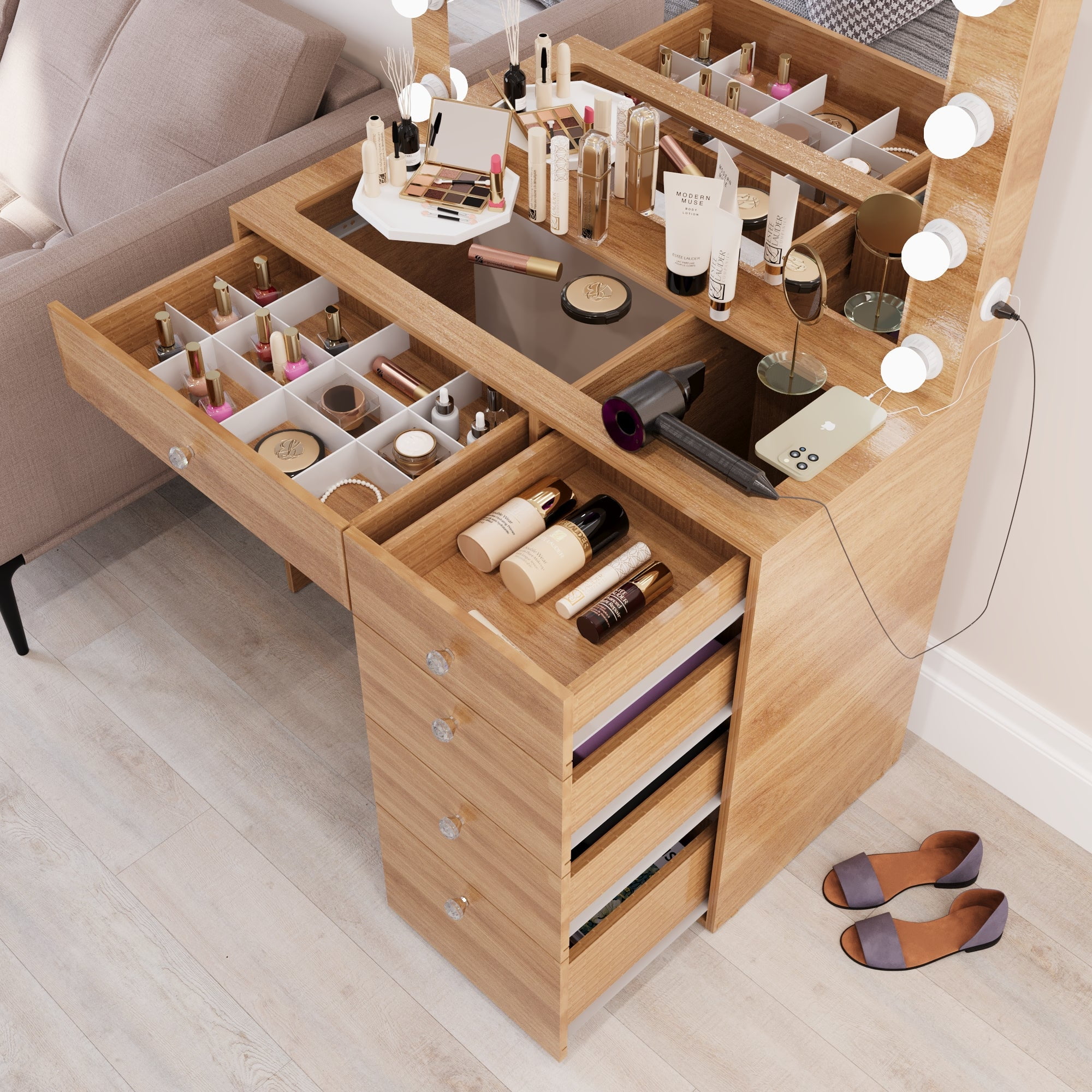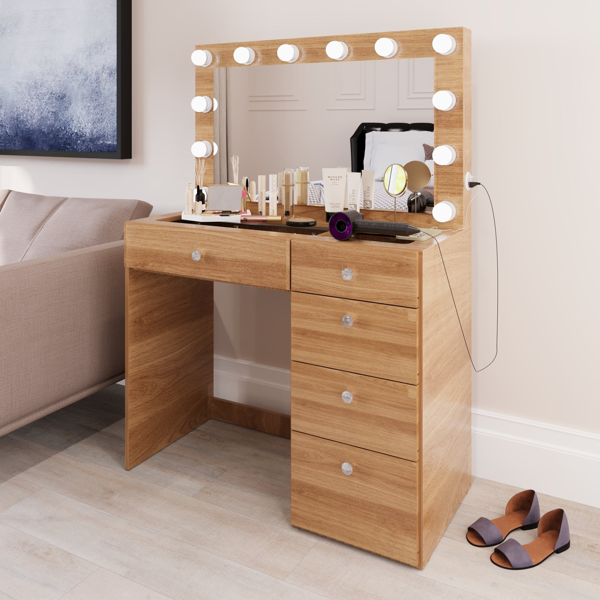 Ember Interiors Ghada Modern Brown Makeup Vanity Desk with Built-in Lights and USB Port for Bedroom