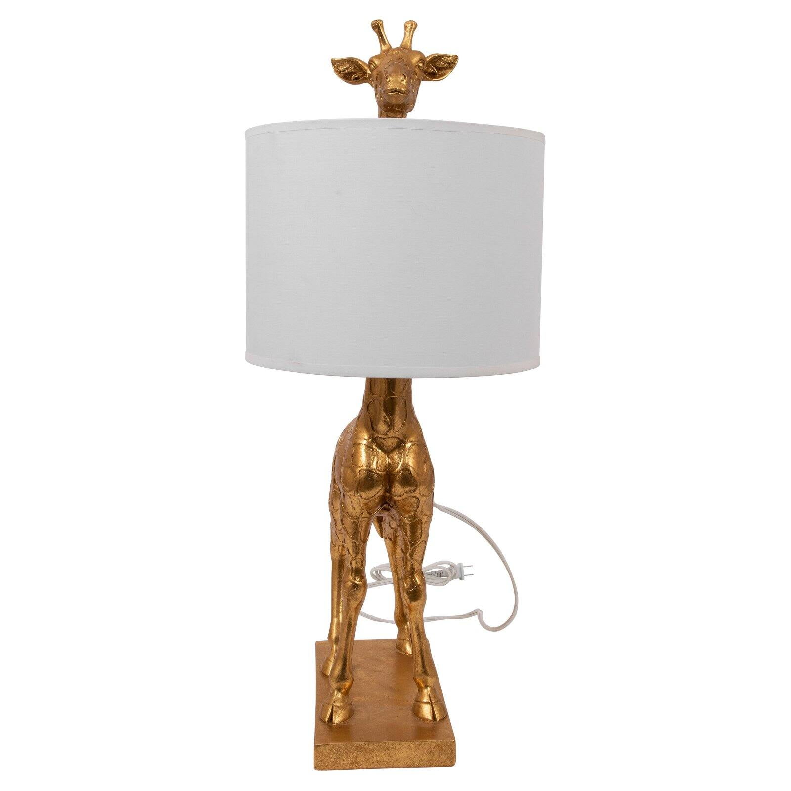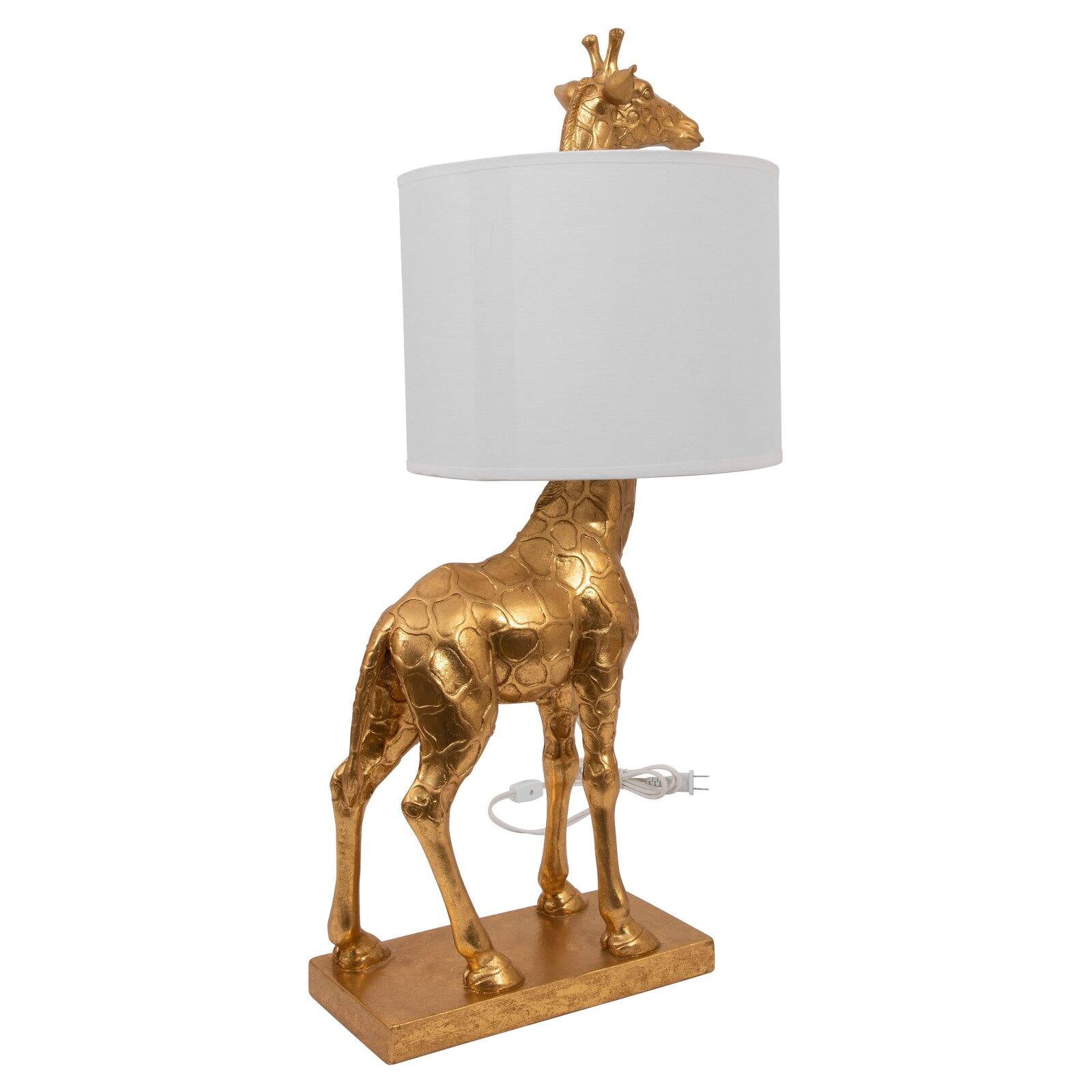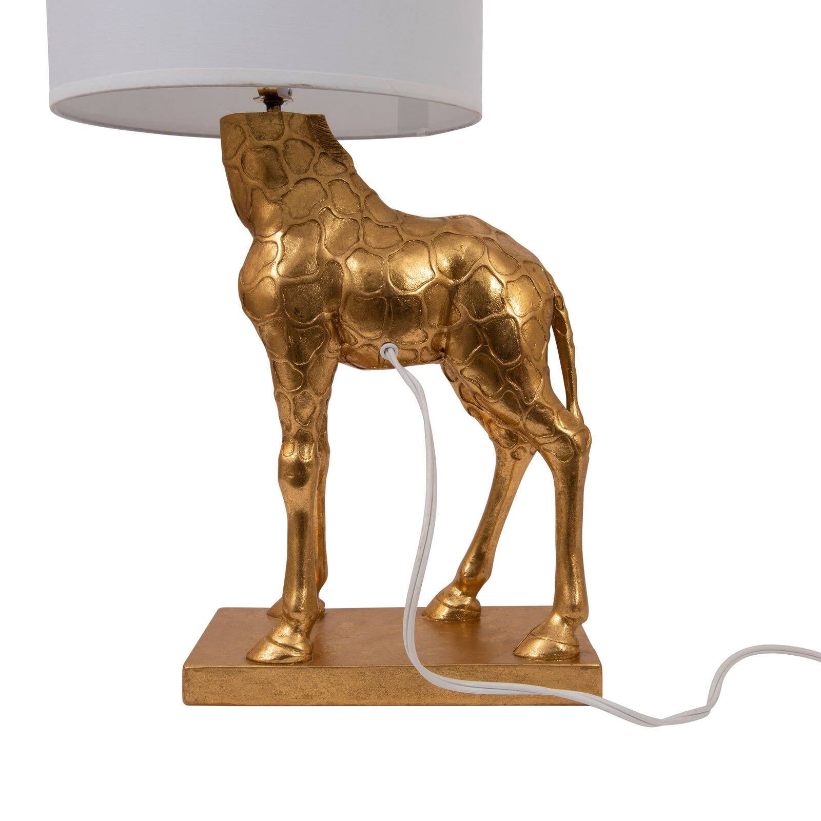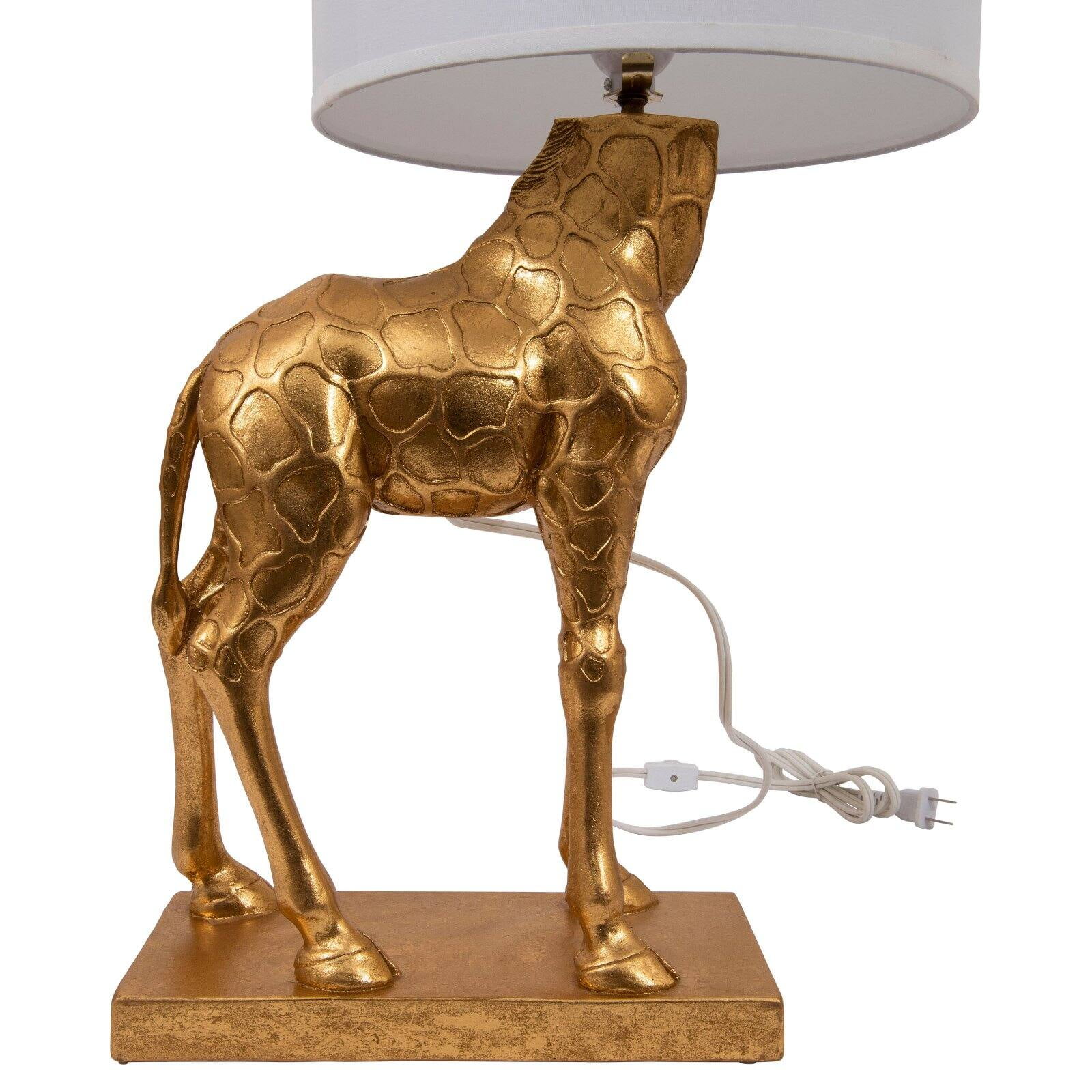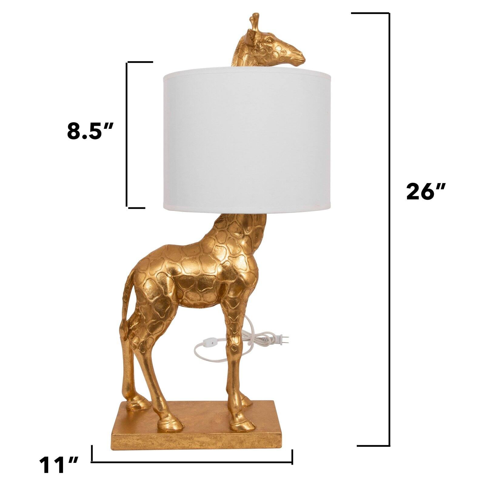 Ember Interiors Gold Giraffe Lamp with Linen Shade: Resin base & body are in the shape of a giraffe with gold finish White linen shade is 10.75″R x 8.5″H Features a generous 64″ long cord 10.5″L x 5.25″W x 27.75″H Power switch is on the cord