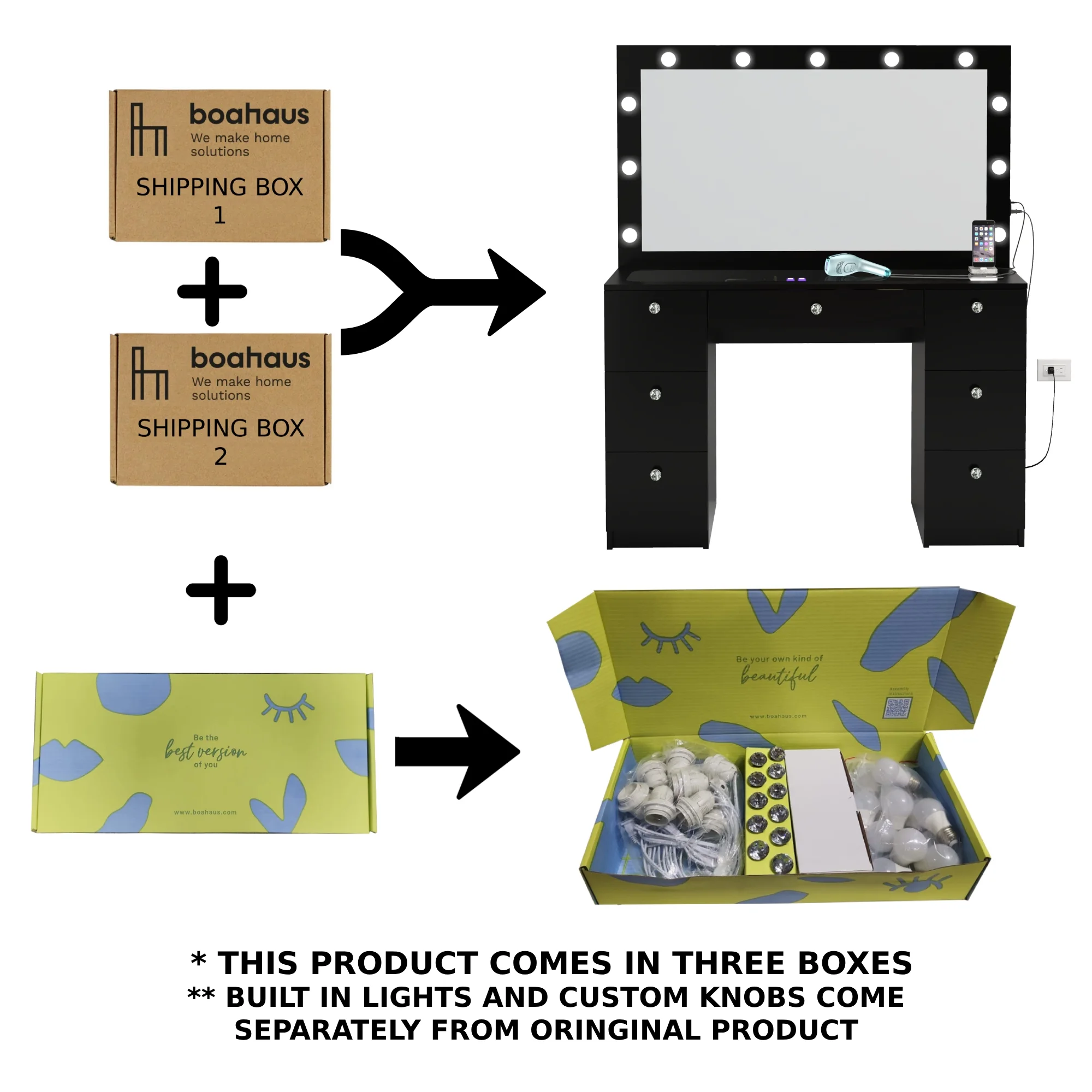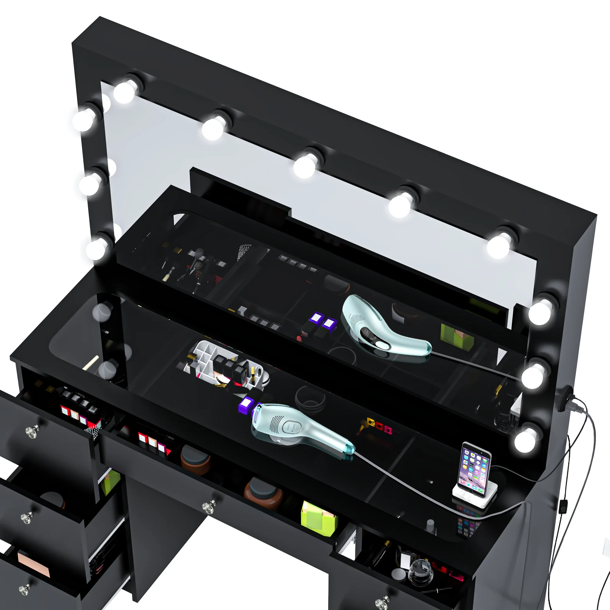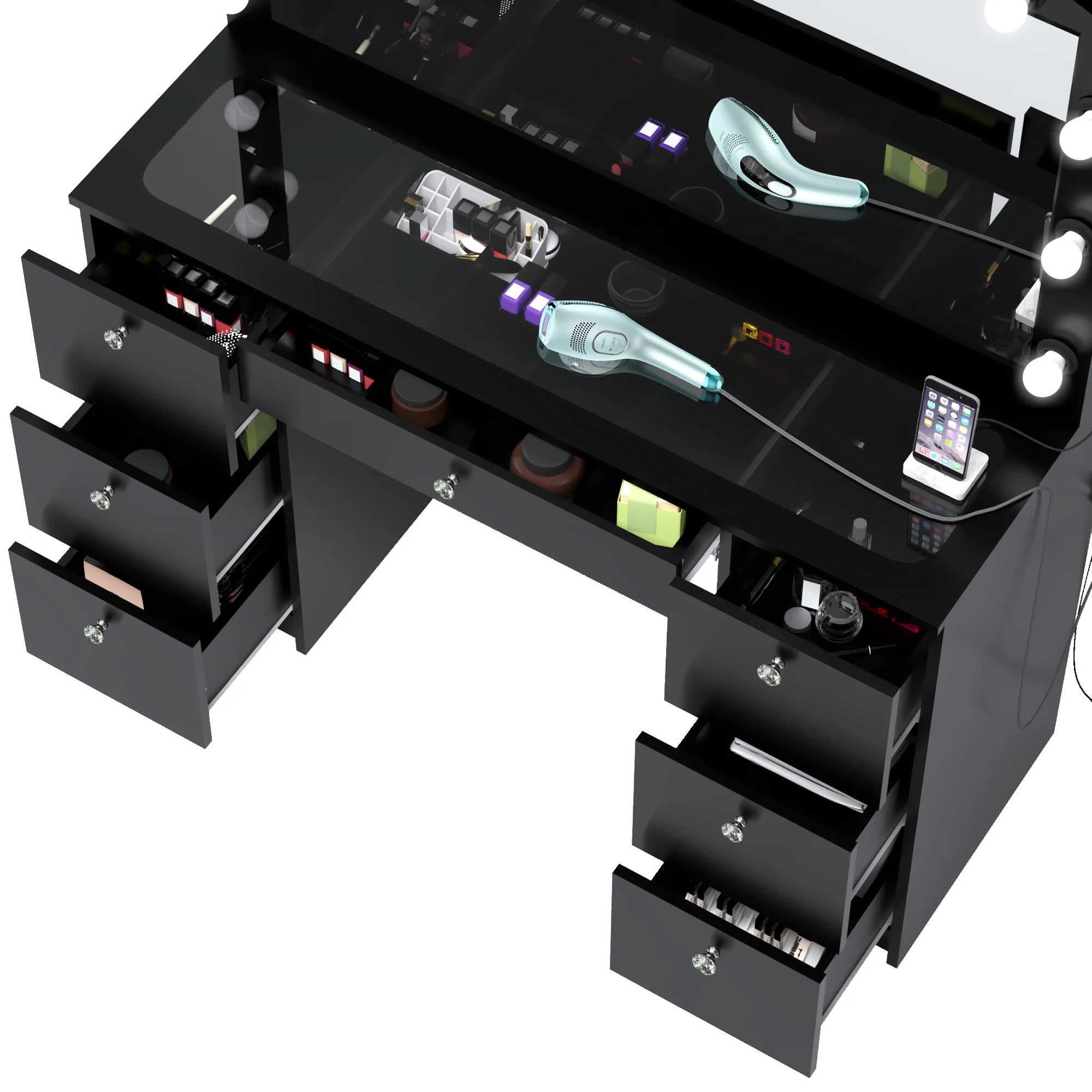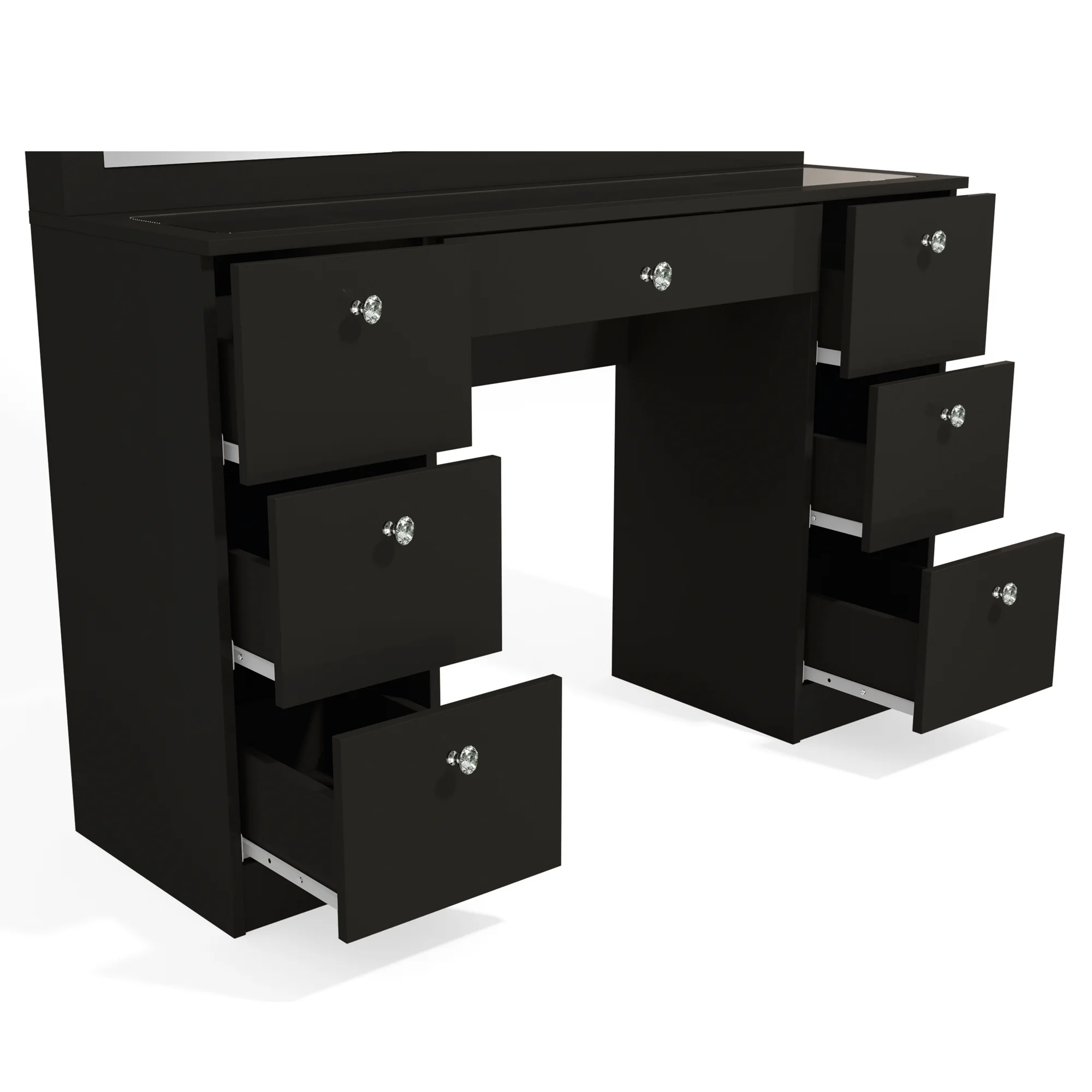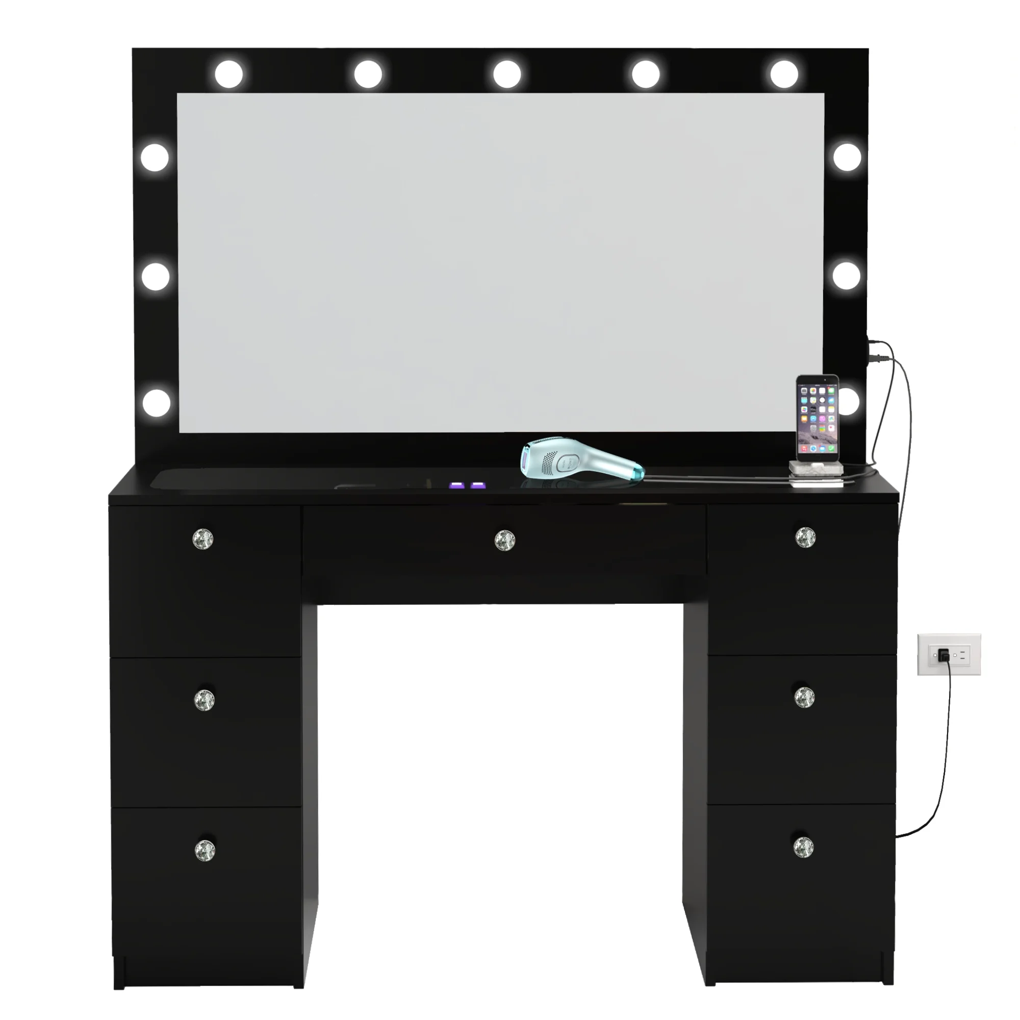 Built-In Hollywood Lights Mirror: Features 11 ultra-bright built-in lights for perfect illumination. Achieve flawless makeup application with professional-level lighting, ideal for GRWM vanity routines. Premium Glass Top: The luxurious glass top enhances the vanity’s elegant modern design while offering a smooth, easy-to-clean surface for your beauty essentials. Seven Spacious Drawers with Crystal Knobs: Designed for optimal storage, the seven large drawers keep makeup, jewelry, and accessories organized. Crystal knobs add a premium, sophisticated touch. Charging Station with Power Outlet and USB Ports: Includes built-in USB Type-A, Type-C, and a power outlet to charge devices, plug styling tools, or power accessories efficiently. Jewelry Divider in Central Drawer: Keep your rings, necklaces, and earrings neatly arranged with the central drawer’s jewelry divider. An organized solution for all your accessories. Spacious Modern Design: This vanity desk offers a large workspace while fitting beautifully into modern bedrooms. Available in sleek White or Black finishes. Crystal Clear Mirror for Glam Styling: A large, high-quality mirror provides optimal visibility for makeup and hairstyling, ensuring a flawless look every day. Premium Quality and Durable Build: Made from high-quality, durable materials, this vanity desk is designed to last, offering both stability and style for daily use. Elegant and Functional Setup: The combination of crystal knobs, sleek lines, and modern aesthetics makes this vanity a centerpiece for any beauty space. Perfect for Women & Teens: This get ready with me vanity caters to women and teens looking for a premium space to create stunning looks. Organized Beauty Station: Spacious storage and a thoughtful design ensure all your makeup essentials, styling tools, and accessories are within reach and clutter-free. Easy Assembly: Comes with detailed instructions and tools for a hassle-free assembly process, making setup quick and simple. Modern Color Options: Available in timeless White and elegant Black, perfectly matching any decor style in bedrooms or dressing rooms. Luxurious Glass Finish: The polished glass top enhances your vanity space, offering a clean, sleek, and elegant design for modern homes. Compact Yet Spacious: Designed to maximize storage without taking up too much space, making it ideal for smaller bedrooms or apartments. Perfect Gift Choice: A thoughtful and premium gift for birthdays, holidays, or special occasions, appealing to beauty enthusiasts of all ages. Dimensions: Ideal for any bedroom, this masterpiece measures are 56” H x 46.30” W x 15.60” D.
