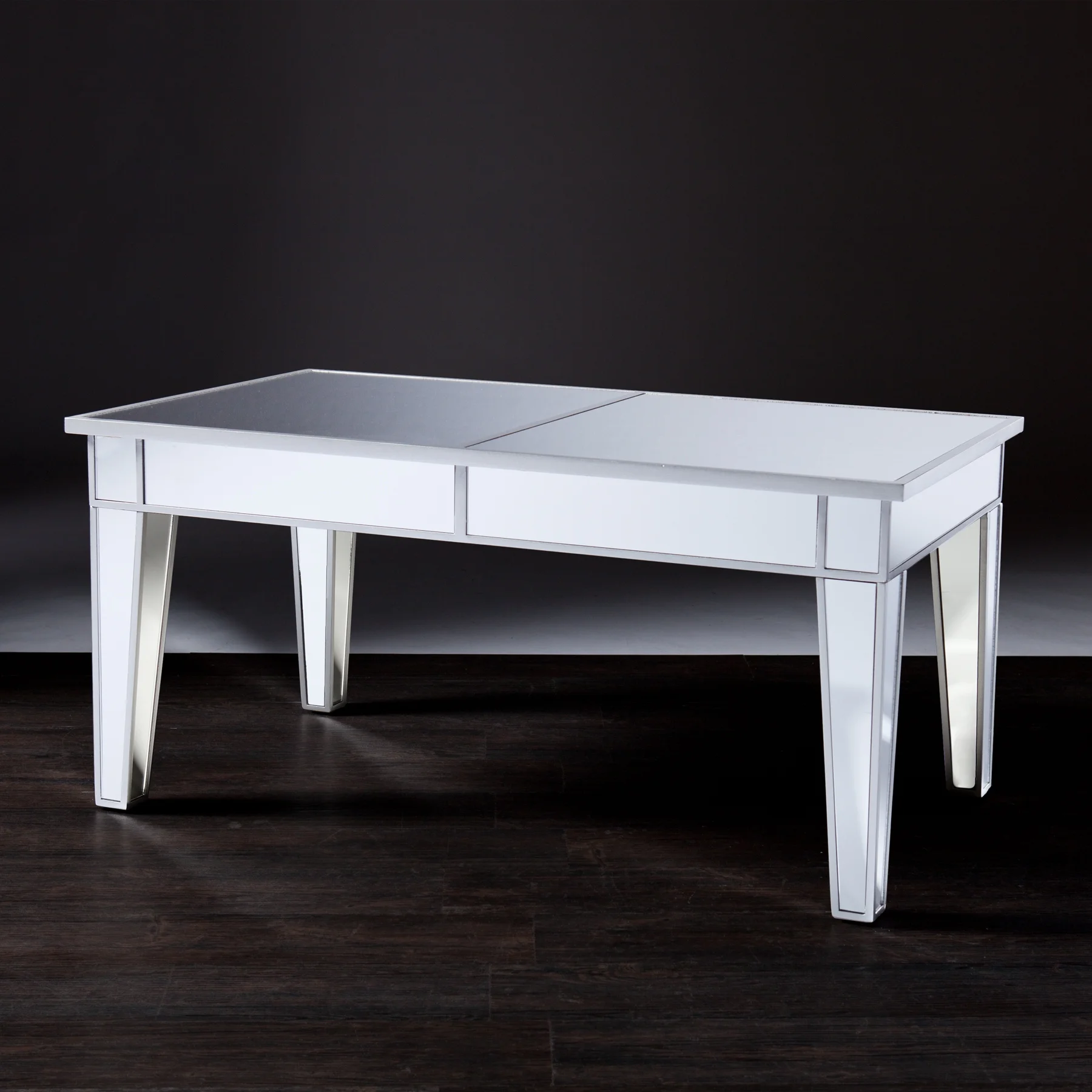 Ember Interiors Illusions Mirrored Cocktail Table: Sophisticated, mirrored table The glimmering finish on all sides Glam style Mirrored finish with metallic silver trim Overall: 42.25″ L x 23.75″ W x 20″ H Assembly Required Tabletop mirrors: 20″ W x 22.5″ D Clearance: 36.75″ W x 18.5″ D x 15.5″ H Approx. weight: 45 lbs Supports up to 25 lbs (per tabletop side) Materials: MDF, fir, 4 mm mirror, 3 mm mirror Model# WM857145