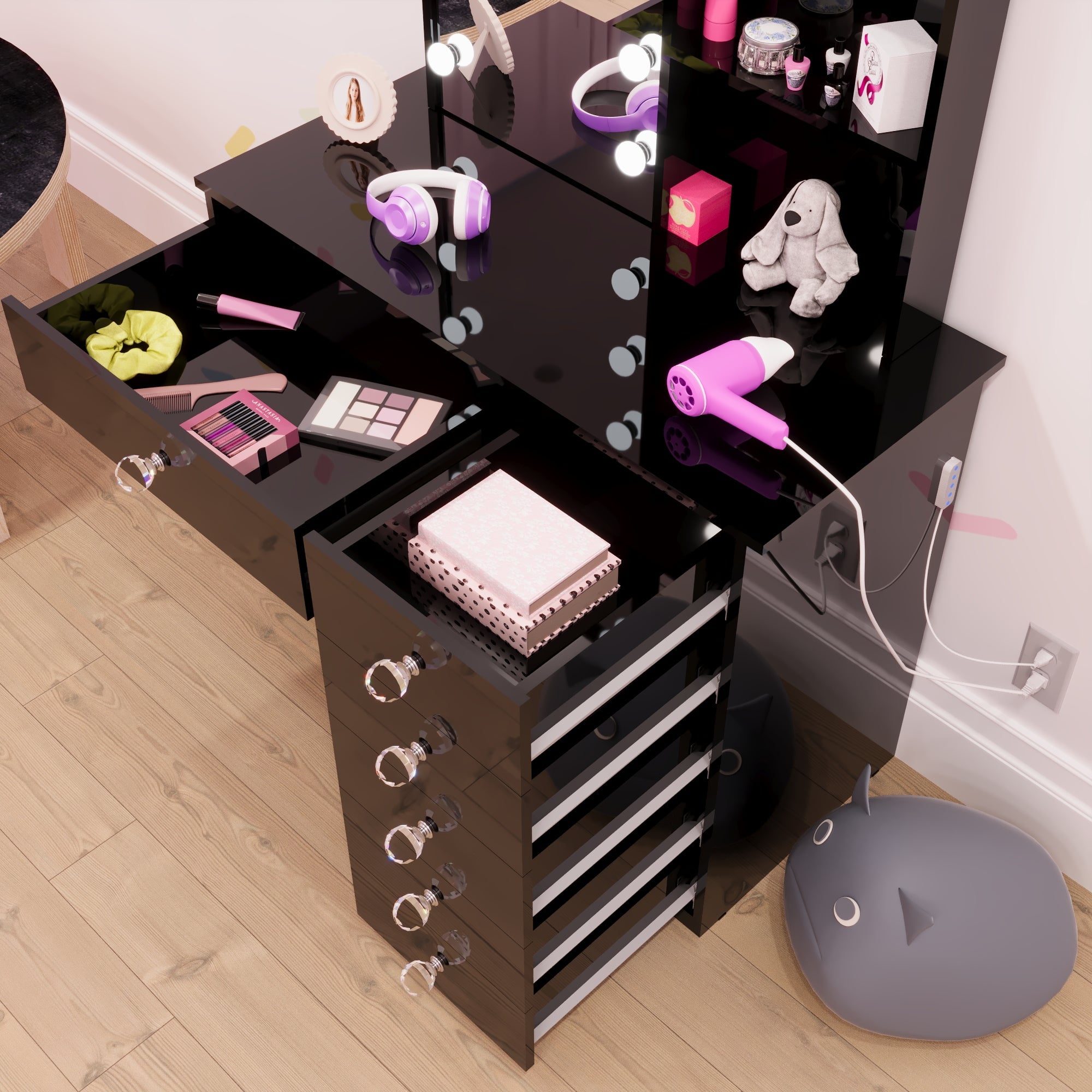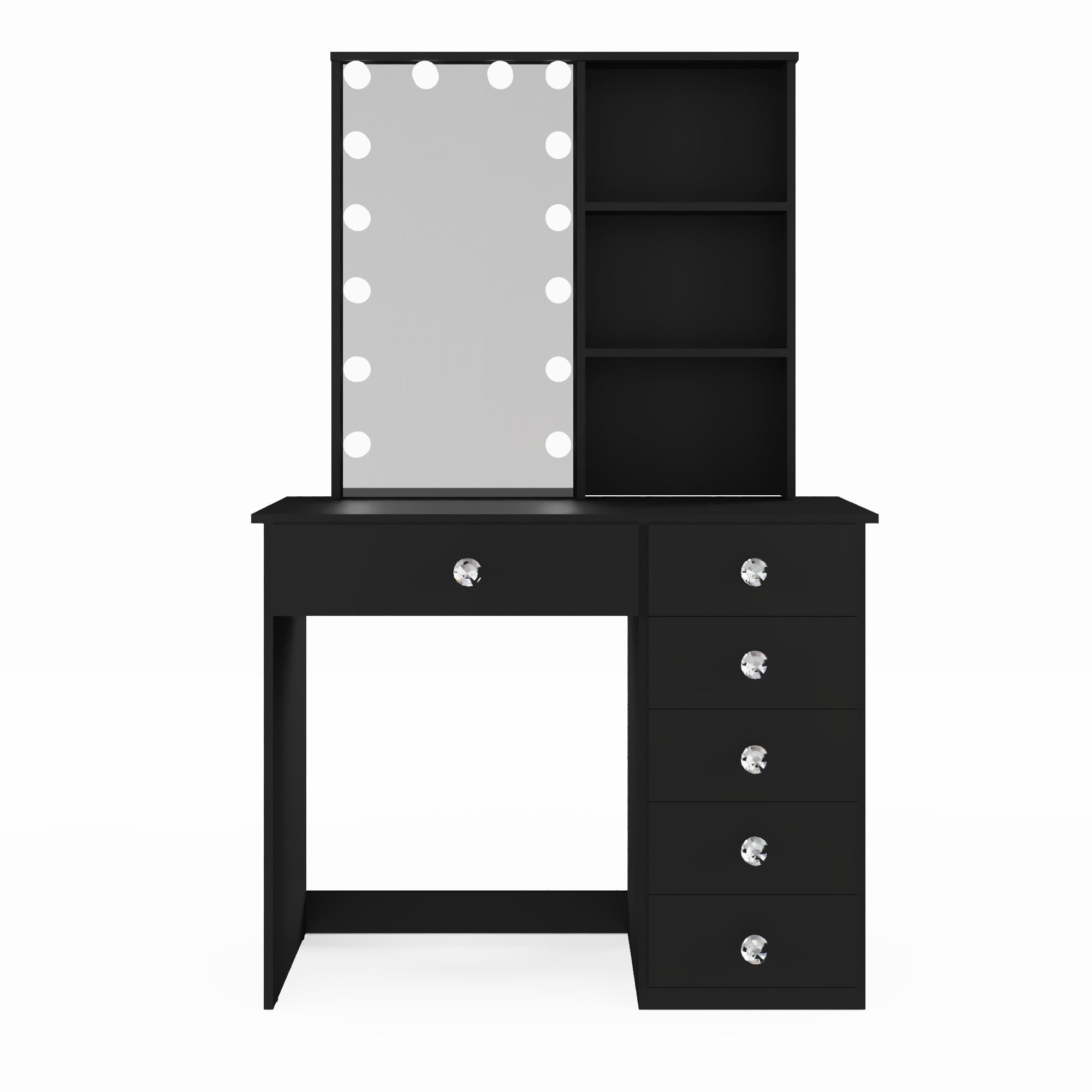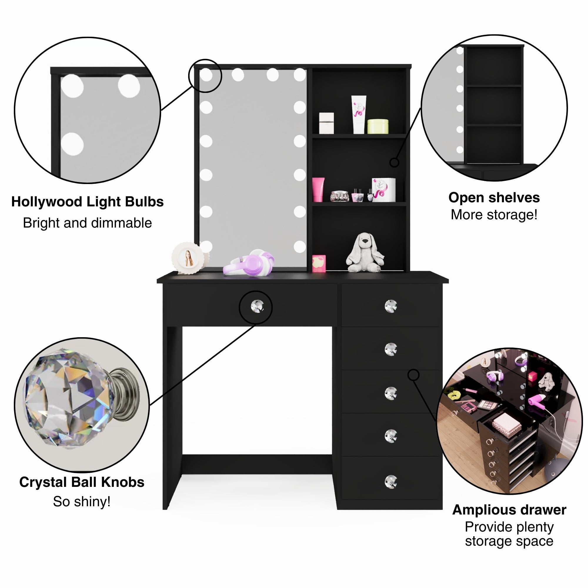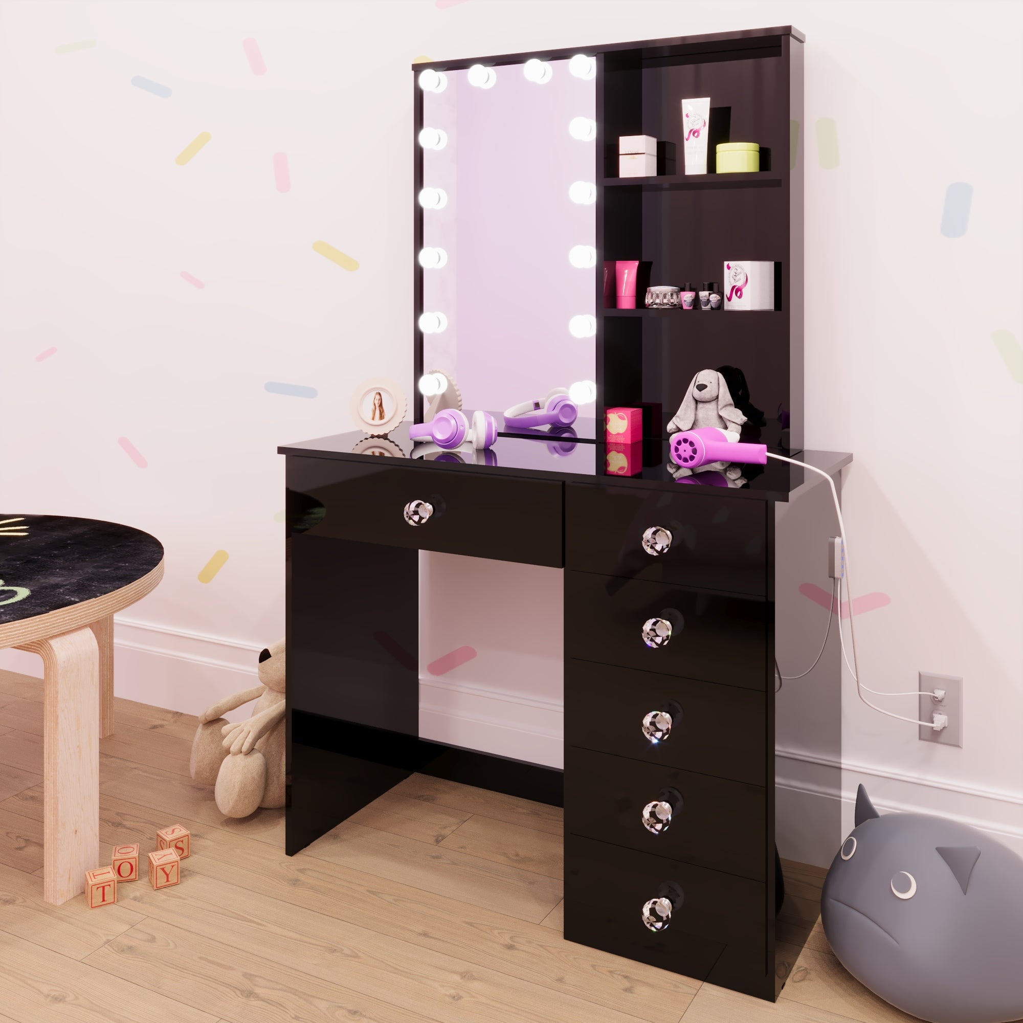 Ember Interiors Kids Vanity Desk with Mirror and Lights – Black Makeup Table with 6 Drawers & Crystal Knobs for Girls’ Bedroom or Playroom