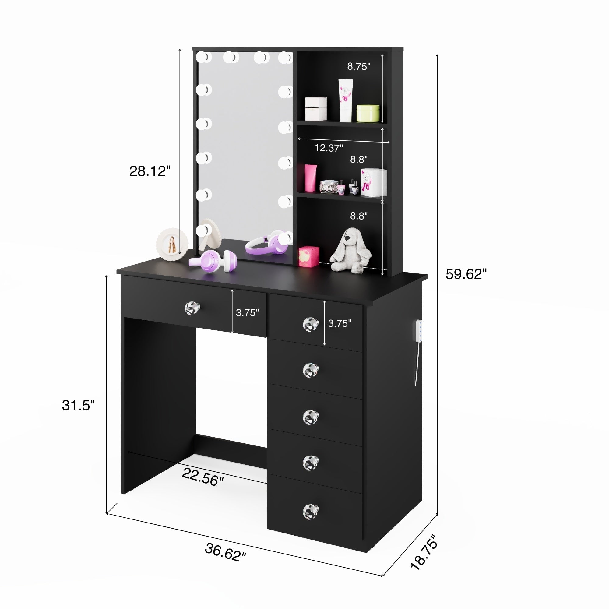 Perfect Size for Kids: Compact yet spacious, this vanity is designed for children, providing the perfect height and space for little ones to play, apply makeup, or enjoy dress-up sessions in their bedroom or playroom. Bulb Add on: Featuring an integrated mirror with lights for bright, even illumination, this vanity ensures your child can see clearly while playing, applying makeup, or experimenting with their look. Ample Storage Space: The vanity offers plenty of room with multiple drawers and compartments for organizing makeup, jewelry, and hair accessories, teaching kids how to stay organized and keep their space neat. Crystal Ball Knobs: Elegant crystal ball knobs make this vanity even more charming, adding a playful yet sophisticated touch that is perfect for a child’s room. Kid-Friendly Design: Safety is a priority with smooth edges and durable materials, ensuring a sturdy and safe environment. The design is fun, simple, and perfectly suited for any child’s room theme. Great Gift Idea: This vanity makes a fantastic gift for birthdays, holidays, or special occasions. Perfect for kids who love playing dress-up or participating in beauty routines, it brings both fun and function to their space.