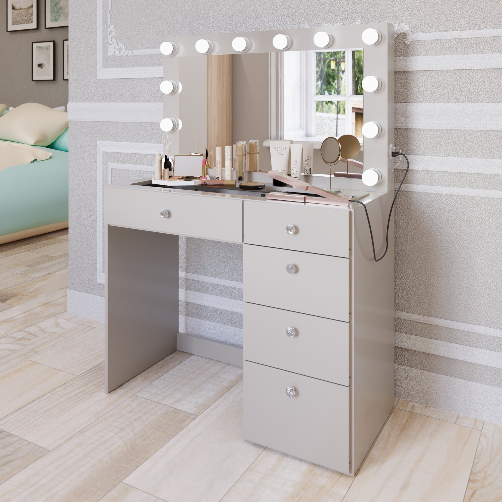 Upgrade your beauty space with the Ember Interiors Modern Greige Makeup Vanity Desk. This stylish vanity features a built-in mirror with 12 bright bulb lights, ensuring perfect lighting for makeup application and grooming. With a convenient USB Type-C power outlet, you can charge your devices while getting ready, making this vanity desk a tech-friendly addition to any bedroom. Designed with five spacious drawers adorned with crystal knobs, this vanity offers ample storage for all your makeup, skincare, and accessories. The warm Greige finish adds a sophisticated touch, blending beautifully with various decor styles. Crafted for durability, this vanity desk is both practical and elegant, creating the ideal setup for your daily beauty routine.