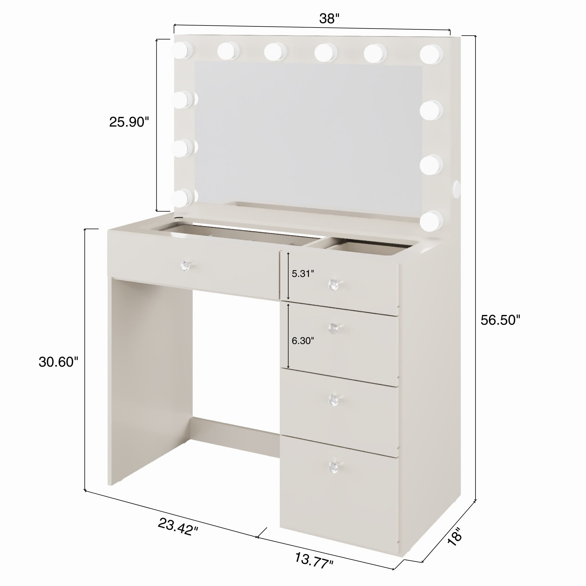 Vanity Desk Dimensions: Measures 56.5” H x 38” W x 17.5” D provide a spacious and stylish with ample tabletop space for beauty essentials. 12 Built-in Bulb Lights: Provides bright, even illumination, ideal for flawless makeup application Power Outlet with USB Type-C: Convenient for charging devices while you prepare for the day 5 Drawers with Crystal Knobs: Elegant crystal knobs add a touch of glamour, providing organized storage for beauty products. Modern Greige Finish: Warm Greige color enhances any bedroom decor with sophistication. “Become your own makeup artist. Make this incredible vanity yours today and take your beauty to the next level!”