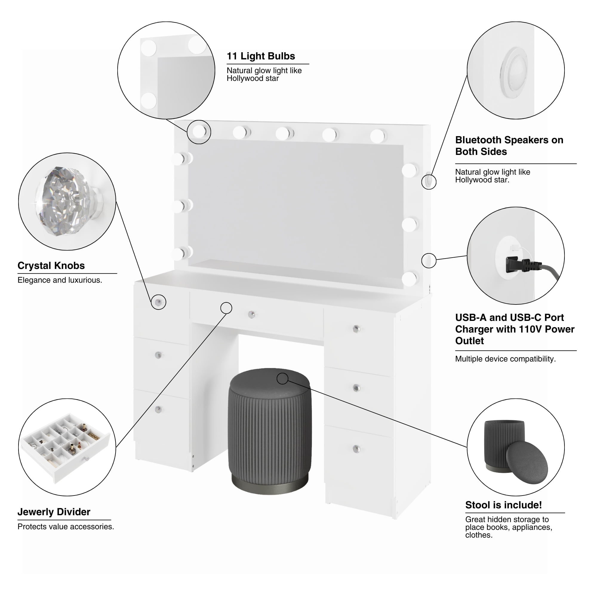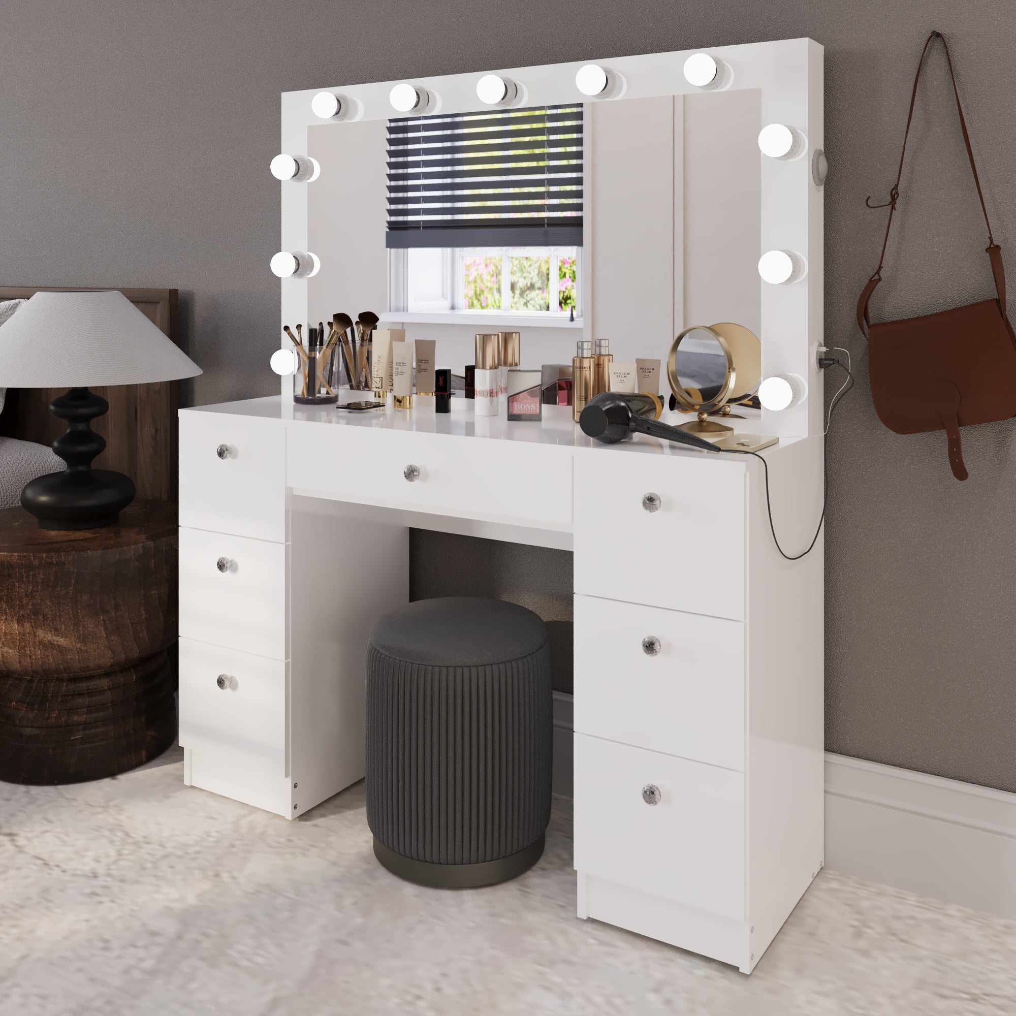 Seven Spacious Drawers: Effortlessly organize your makeup, skincare, and accessories with seven spacious drawers. From palettes to jewelry, everything has its place, helping you stay clutter-free and focused on your routine. Built-In Lights for Flawless Application: Surrounding the wide mirror, the built-in lights provide professional-grade illumination, ensuring consistent and flattering lighting for precise makeup application every time. Versatile Tabletop and Generous Leg Space: The large top offers ample space for your essentials and can double as a workspace. Convenient Power Outlet and USB Ports: Stay connected with the built-in 110V power outlet and two USB ports, perfect for powering your hairdryer, straightener, or charging your devices—all within arm’s reach. Upgrade your beauty space today—stay organized, illuminated, and connected!