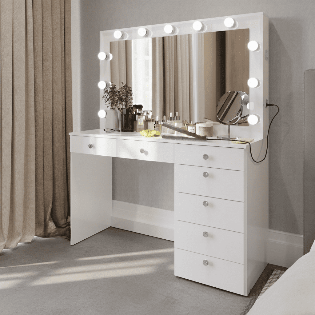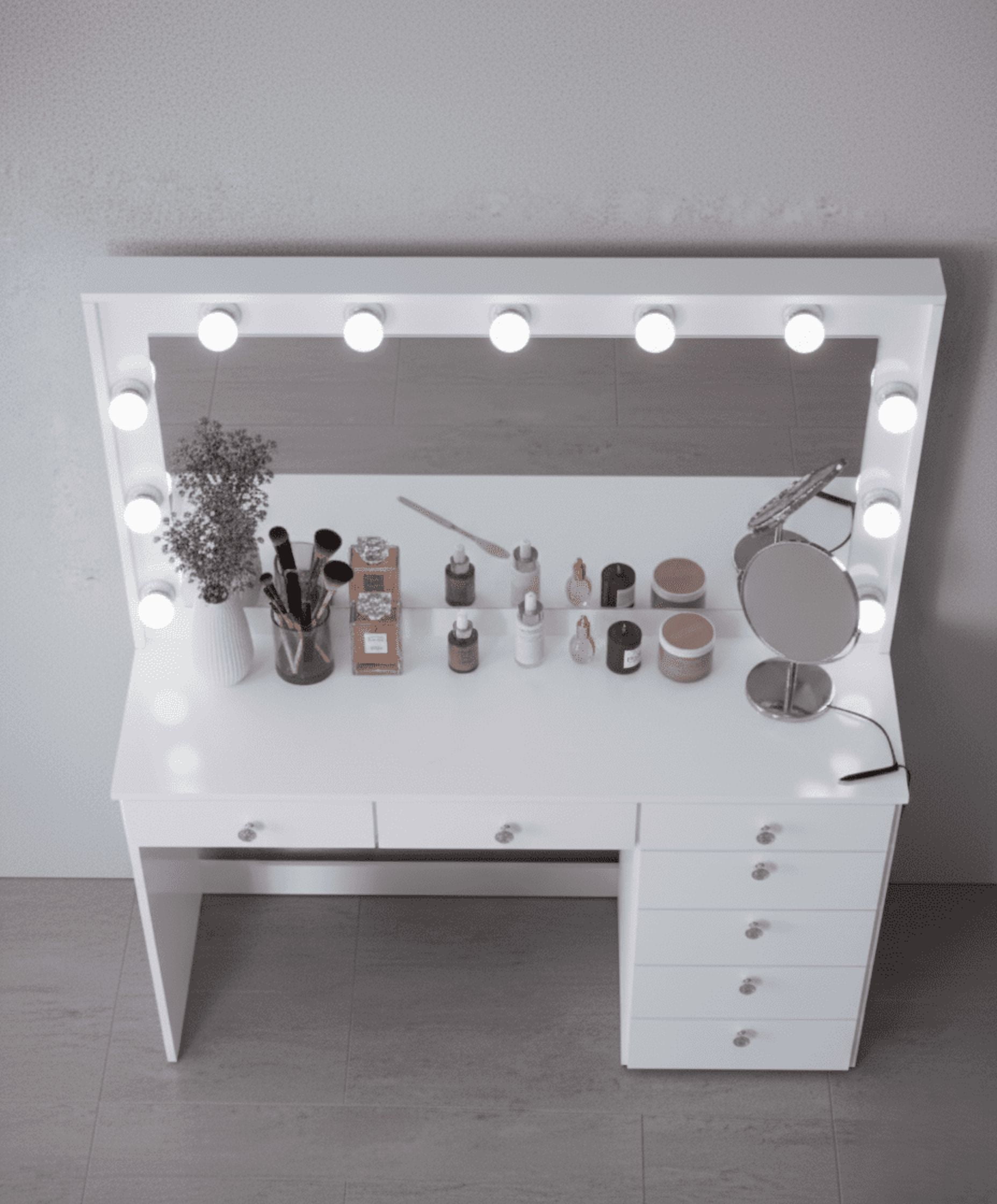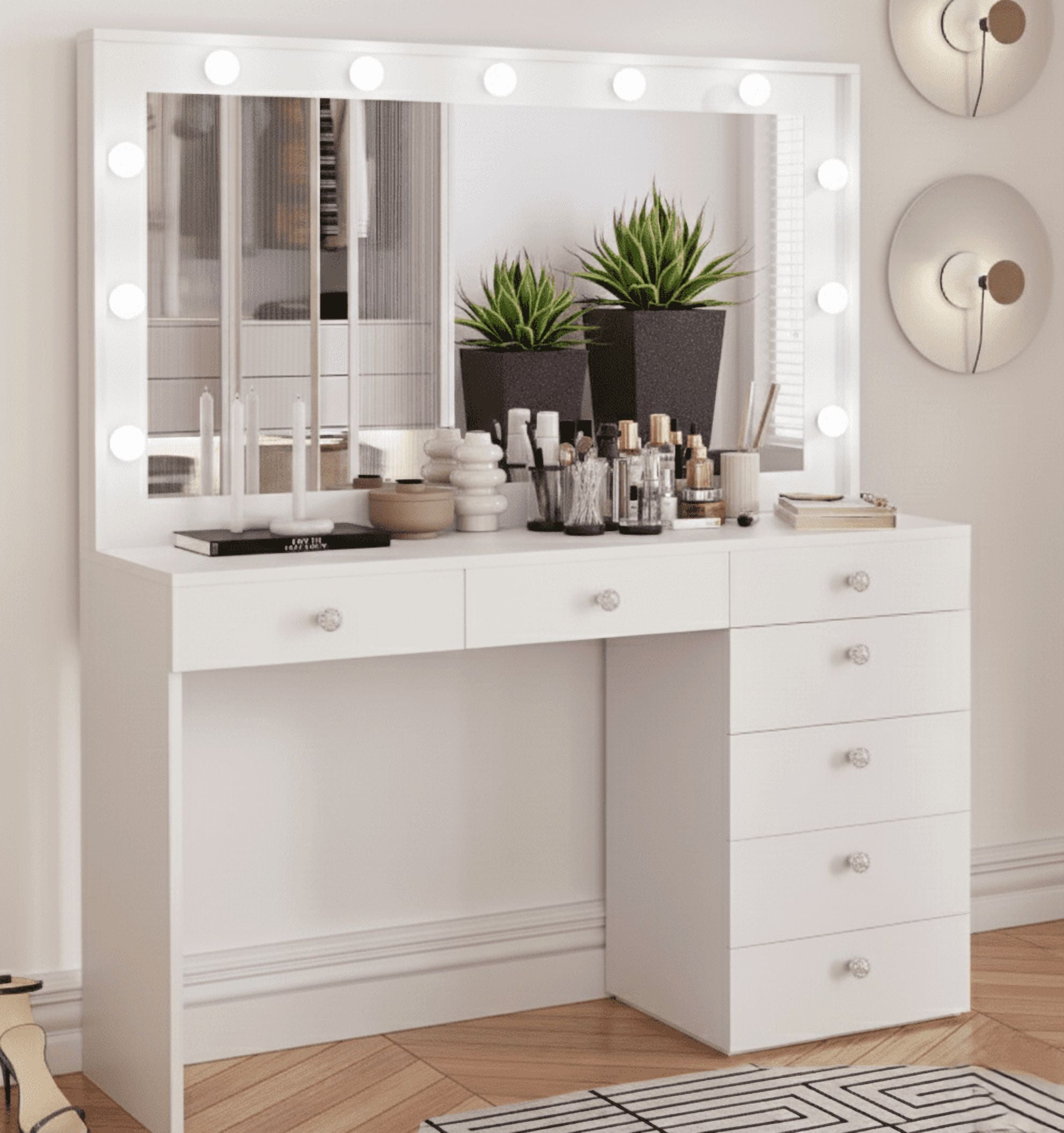 Spacious Vanity Dimensions: Measures 57.88” H x 47.25” W x 18.31” D, providing an expansive tabletop that is perfect for your daily beauty routine or doubling as a workspace. Bright Lighted Mirror: Built-in mirror with 6500K lighting delivers even, natural illumination for a professional touch during makeup application and grooming. Seven Large Drawers with Crystal Knobs: Organize your beauty essentials, skincare, and accessories effortlessly in elegant drawers that combine practicality with a glamorous design. Built-In USB Type-C Charging Station: Conveniently located charging port for your phones, tablets, or other devices, ensuring you’re always connected during your GRWM sessions. Sleek White Finish with Premium Materials: Crafted from durable manufactured wood with a chic white finish that complements any bedroom decor and provides lasting stability. Compact Yet Functional Design: Perfect for smaller spaces, this vanity brings maximum utility without sacrificing style, making it a versatile addition to your room. Versatile and Aspirational Setup: Ideal for creating your personalized get ready with me vanity space, combining practicality with a touch of luxury. Easy and Stress-Free Assembly: Comes with detailed instructions and all the tools you need for quick and effortless assembly, so you can start using it right away.