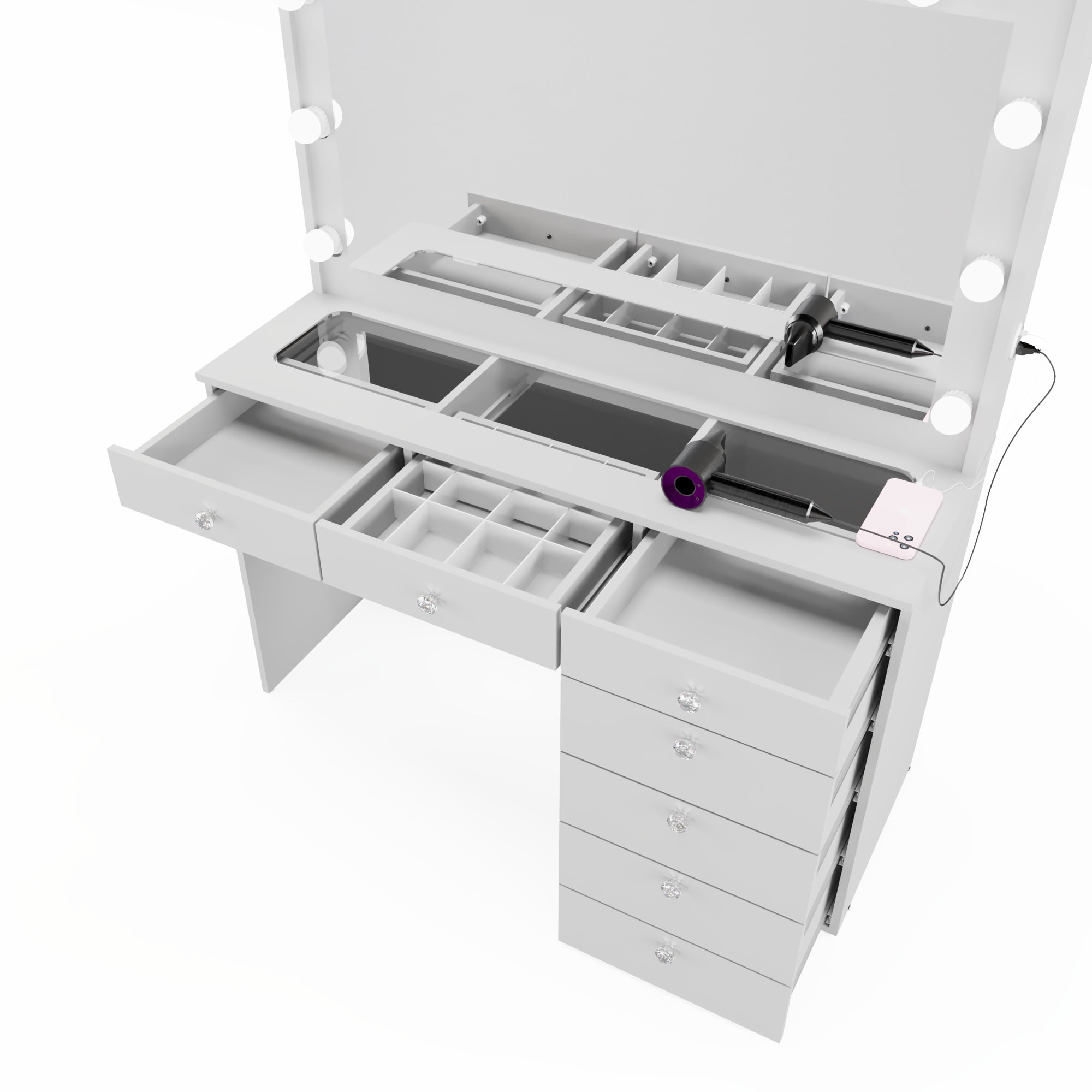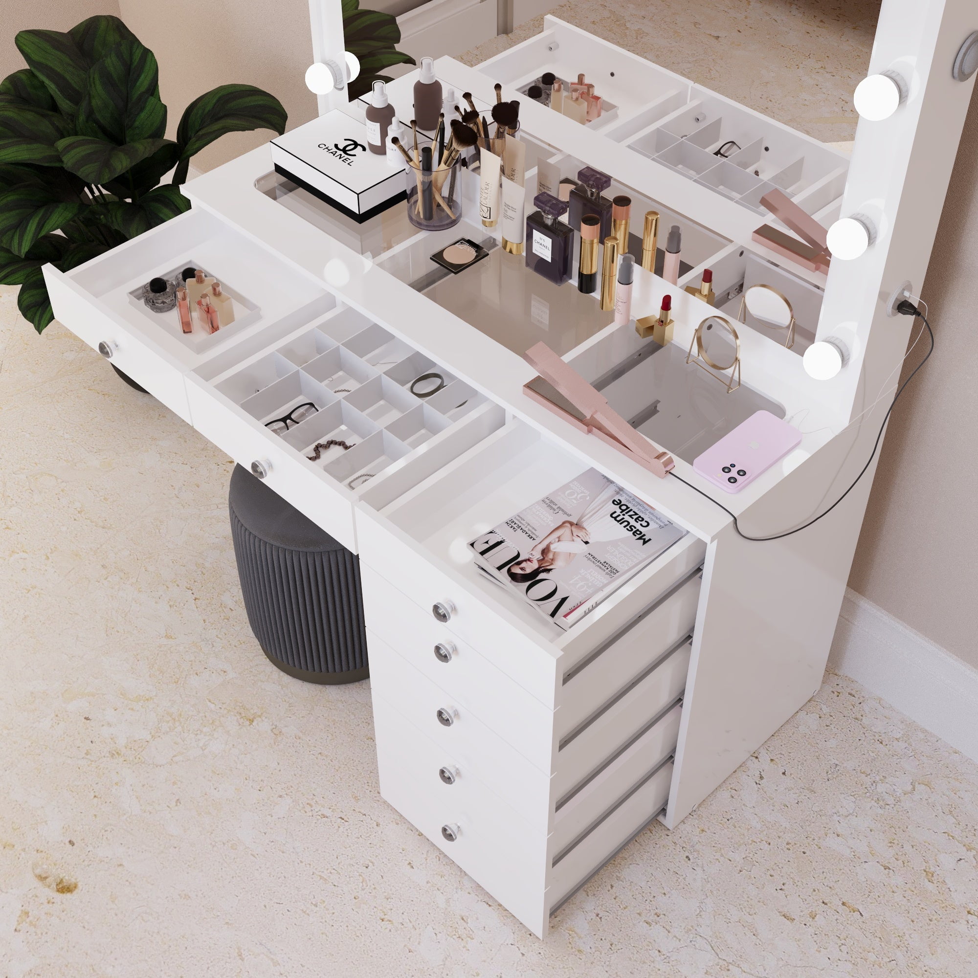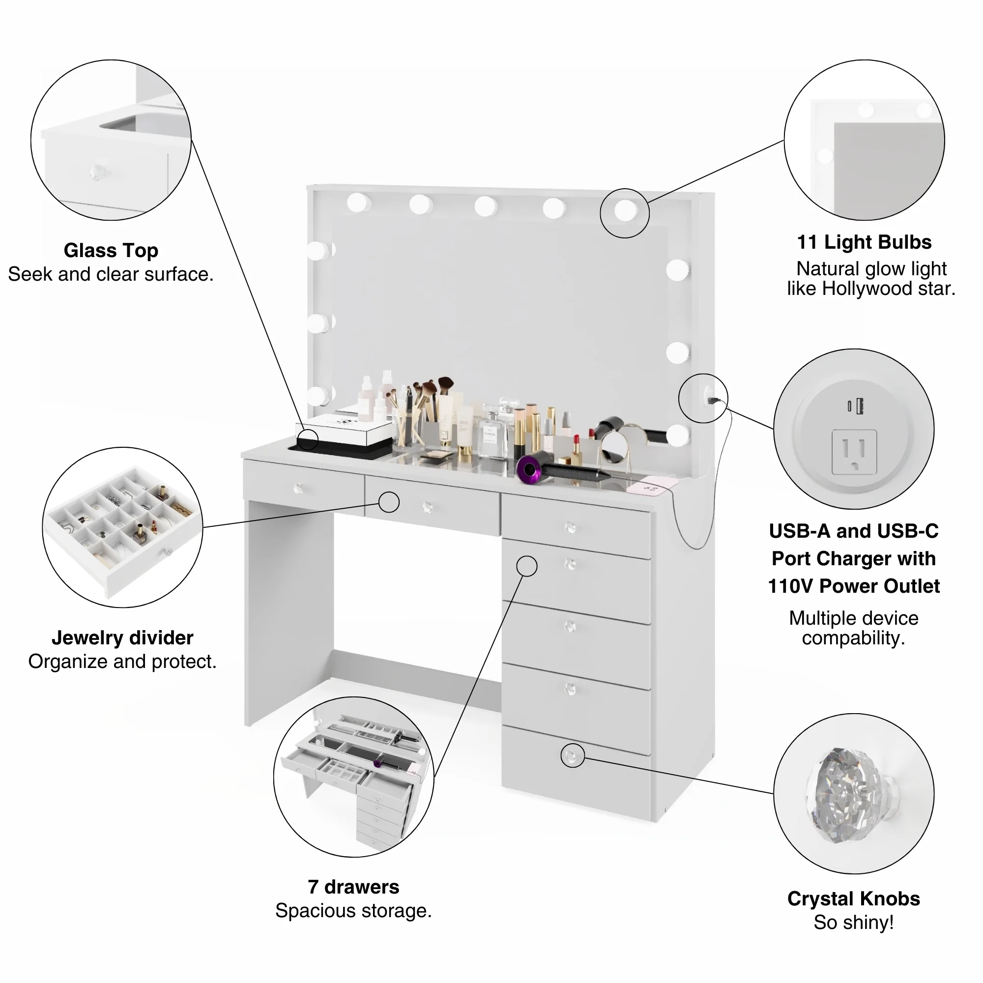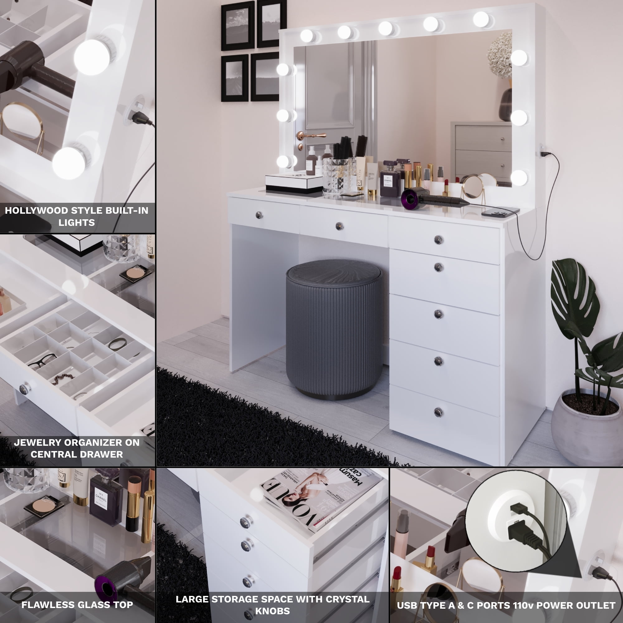 Vanity Desk Dimensions: Measures 58.2″ H x 47.3″ W x 16.9″ H provide spacious and functional, providing a large surface area for all your beauty essentials. Built-In Lights: Integrated lights around the mirror offer bright, even illumination for flawless makeup application. Power Outlet with USB Type-C: Convenient power outlet with USB Type-C for charging devices as you get ready. 7 Drawers with Crystal Knobs: Generous storage with crystal knobs, perfect for organizing makeup, skincare, and accessories. Sleek Glass Top: Adds a touch of elegance while providing a durable and easy-to-clean surface. Modern White Finish: Sophisticated White finish complements any decor style, making it a stylish addition to any bedroom. “Become your own makeup artist. Make this incredible vanity yours today and take your beauty to the next level!”
