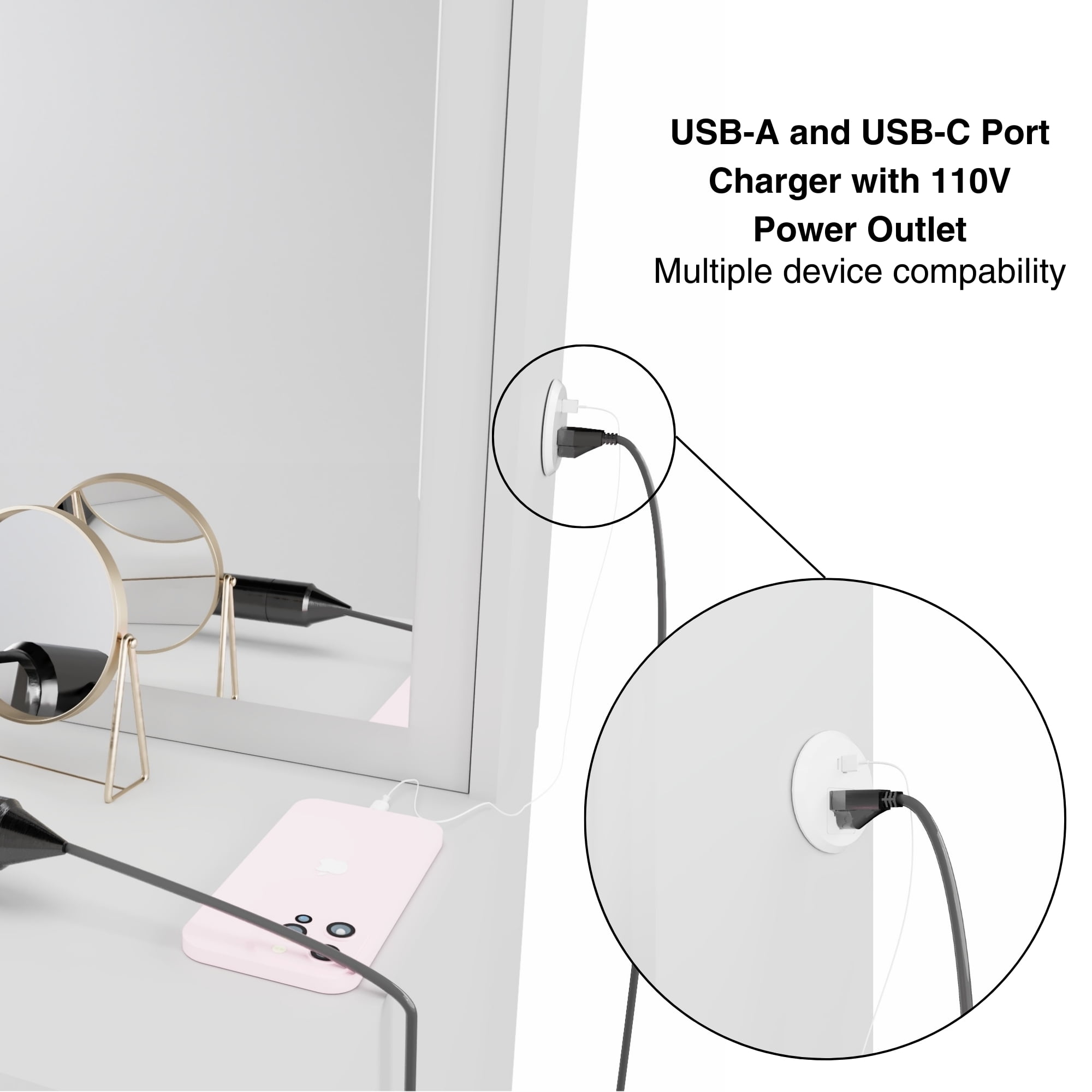 Ember Interiors Polly White Makeup Vanity Desk with Lights, Charging Station