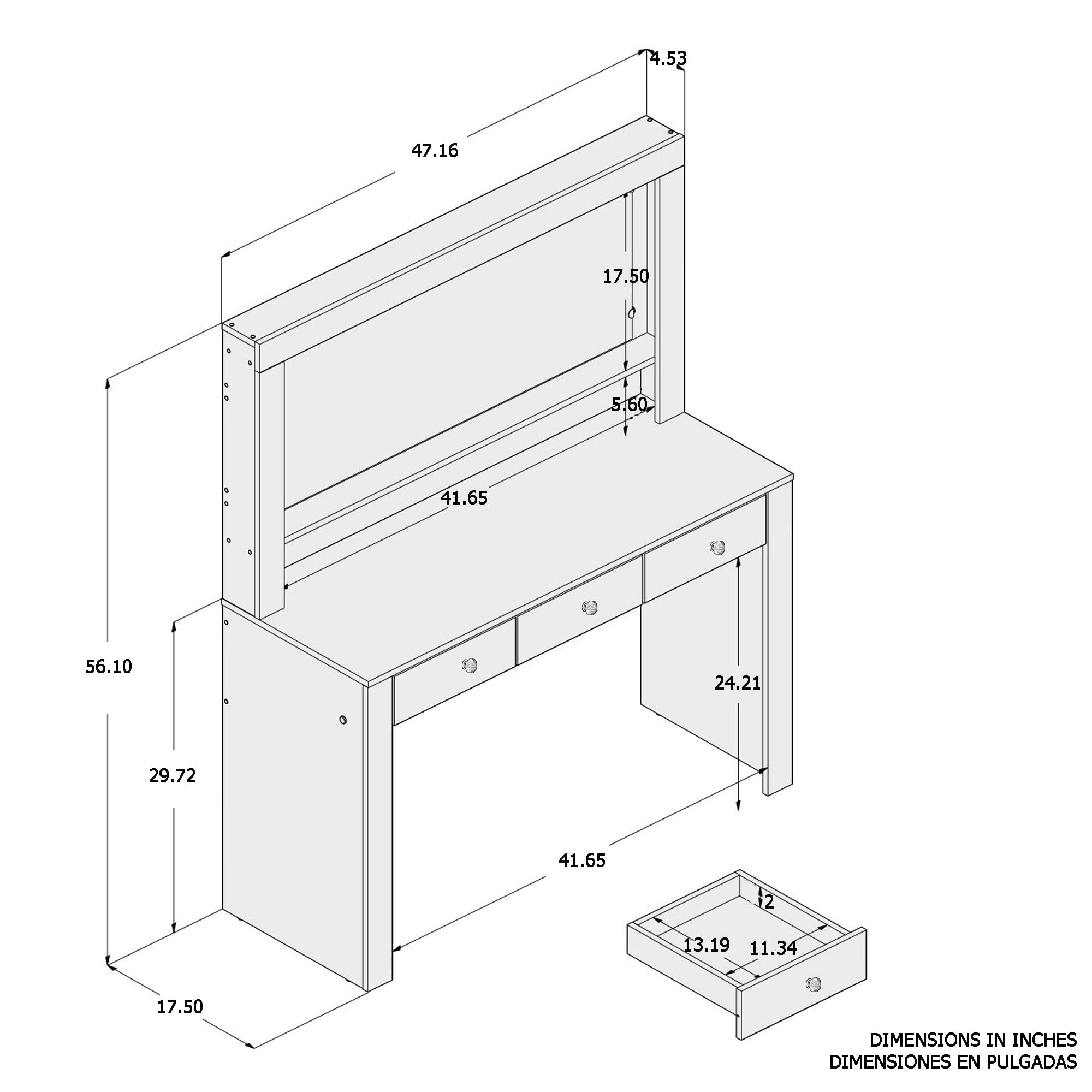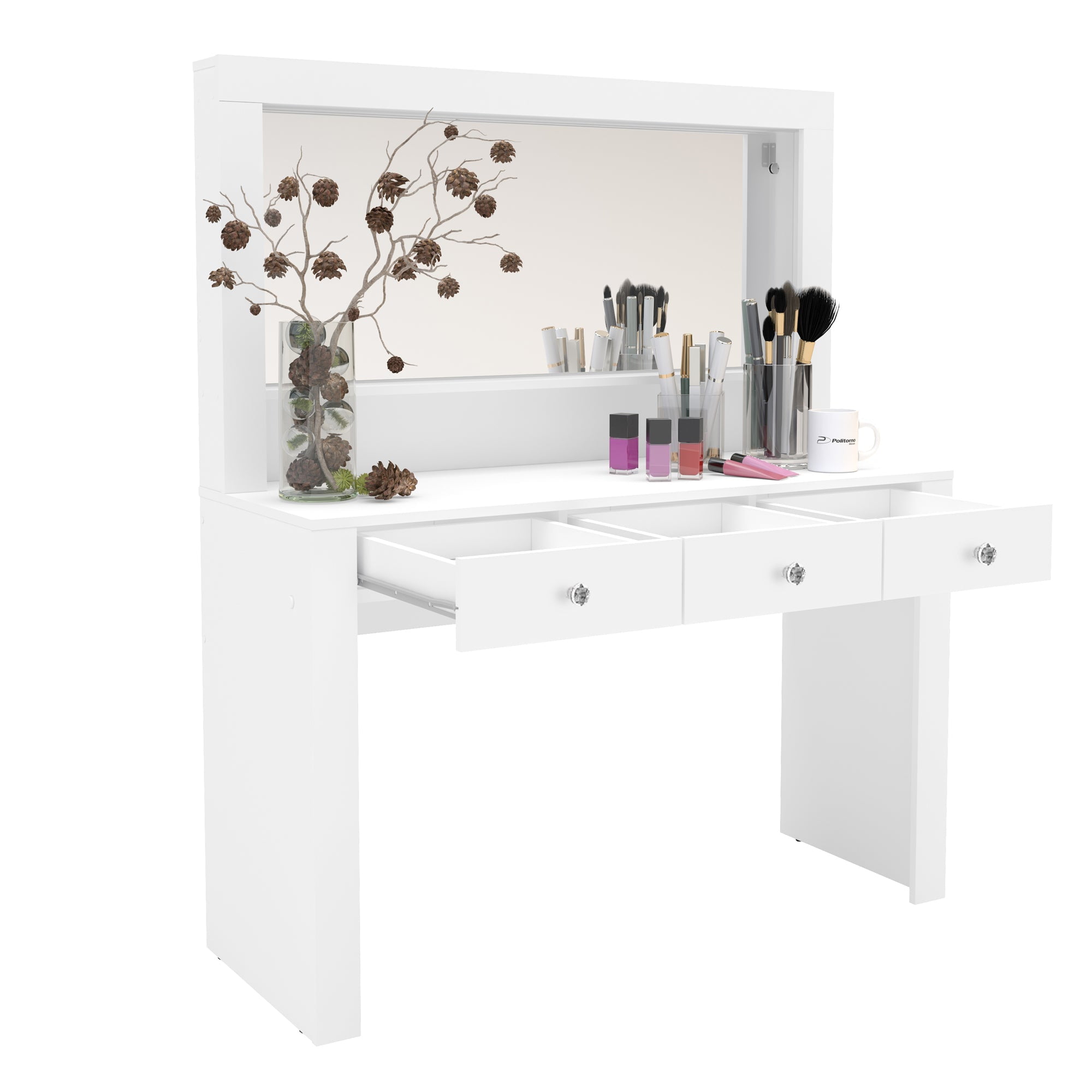 Vanity Dimensions: Measures 56.10″ H x 47.16″ W x 17.50″ D, providing ample space for all your beauty essentials. 3 Drawers with Crystal Knobs: This makeup vanity features three drawers adorned with elegant crystal knobs, providing ample storage while adding a touch of glamour to your beauty setup Sleek White Finish: The painted white finish complements any bedroom decor. Sturdy and Durable: Made from high-quality materials for lasting stability. “Become your own makeup artist. Make this incredible vanity yours today and take your beauty to the next level!” Suitable for All Ages: This makeup vanityis designed to fit from young teenagers to women in the best ages. Discover your best internal beauty with this masterpiece